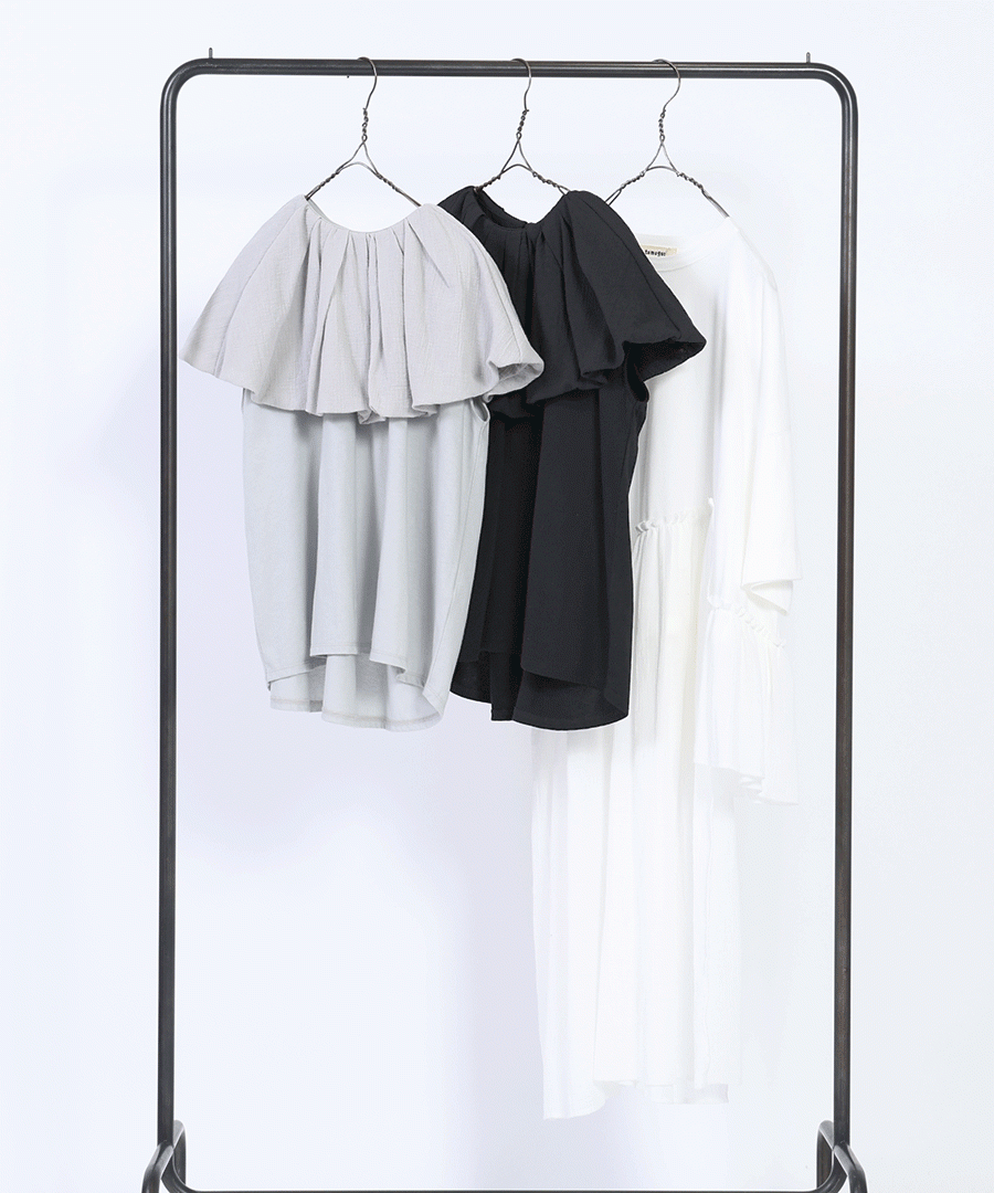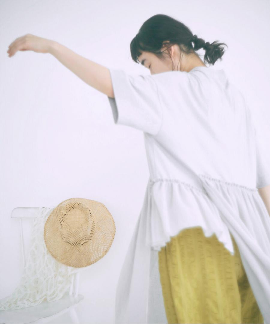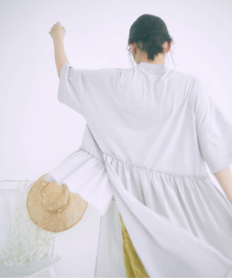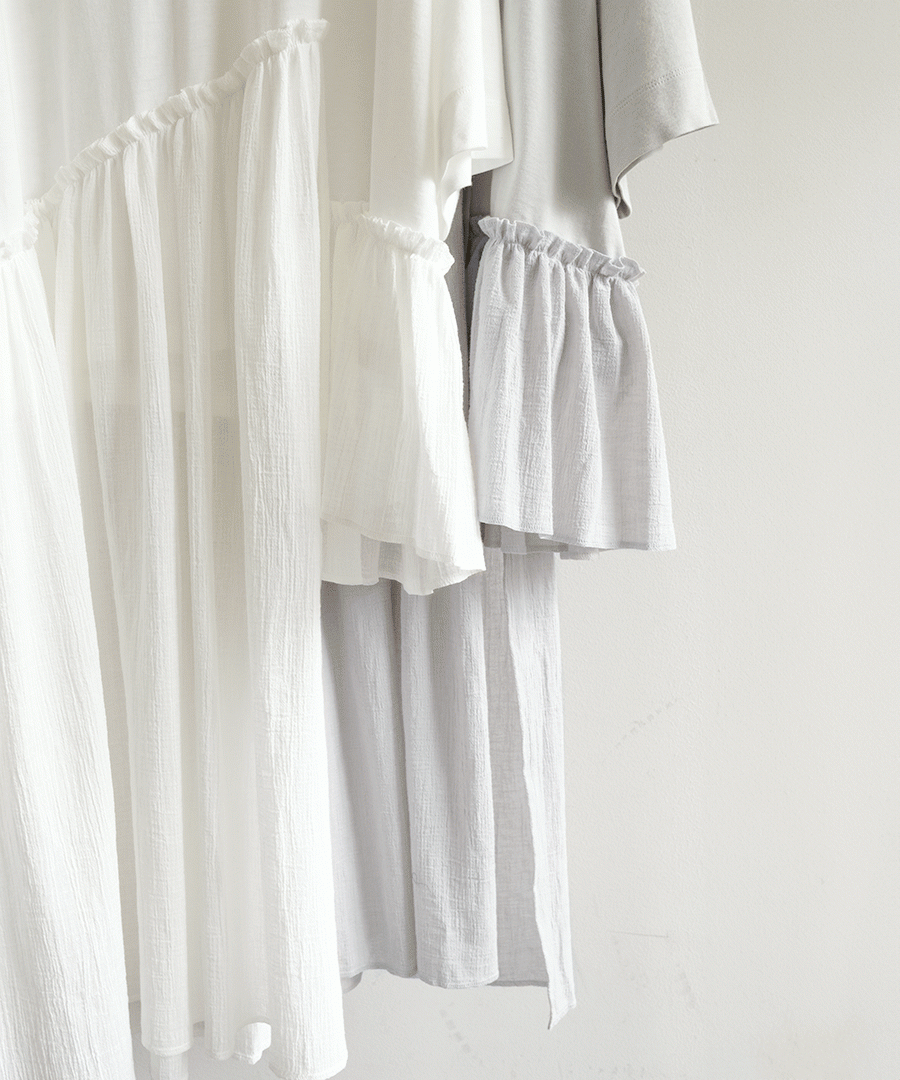 ソフトな風合いのコットン天竺素材と、凹凸感がありほど良い透け感を持つコットンボイル生地を組み合わせることで、軽やかでありながらも洗練された印象を与えるデザインに仕上げました。