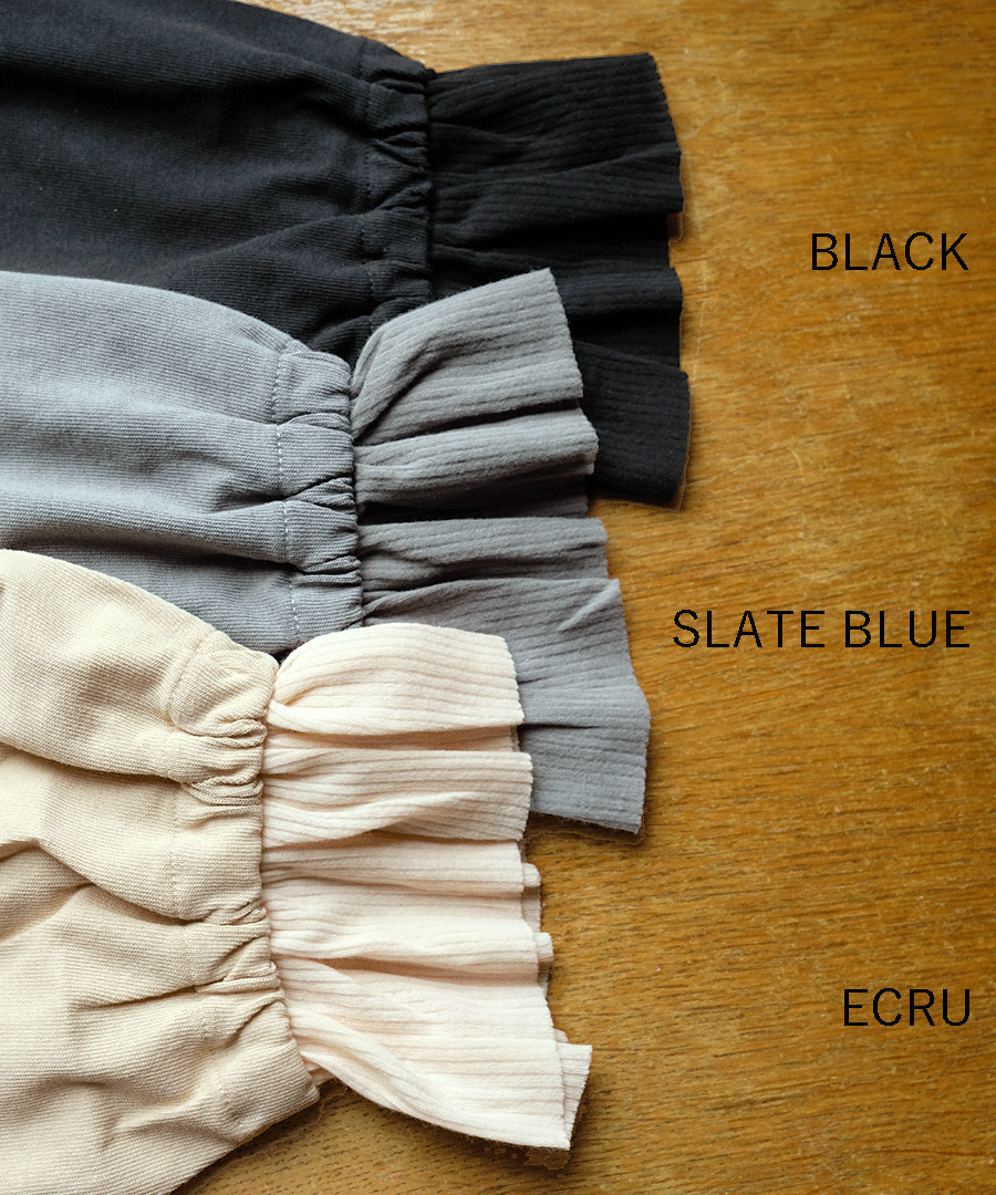 キュプラ混のヴィンテージ感ある生地に、シアーリブ素材のフリルをドッキングしたプルオーバー。
