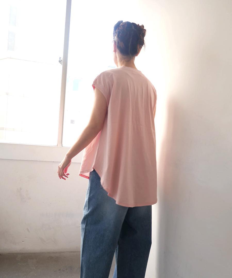 肩まで優しくカバーしてくれるフレンチスリーブのようなデザインで、一枚でも安心して着用いただけます。