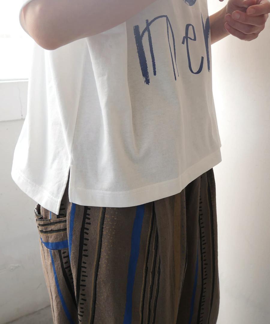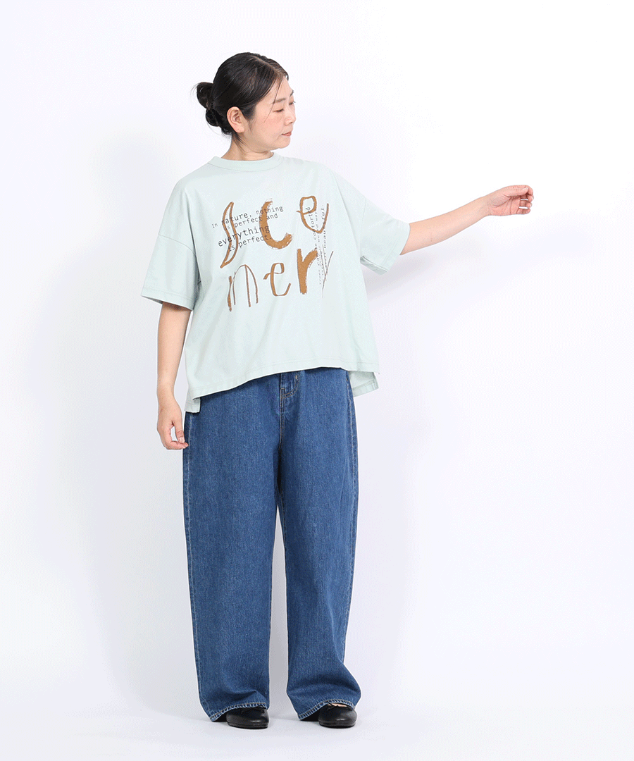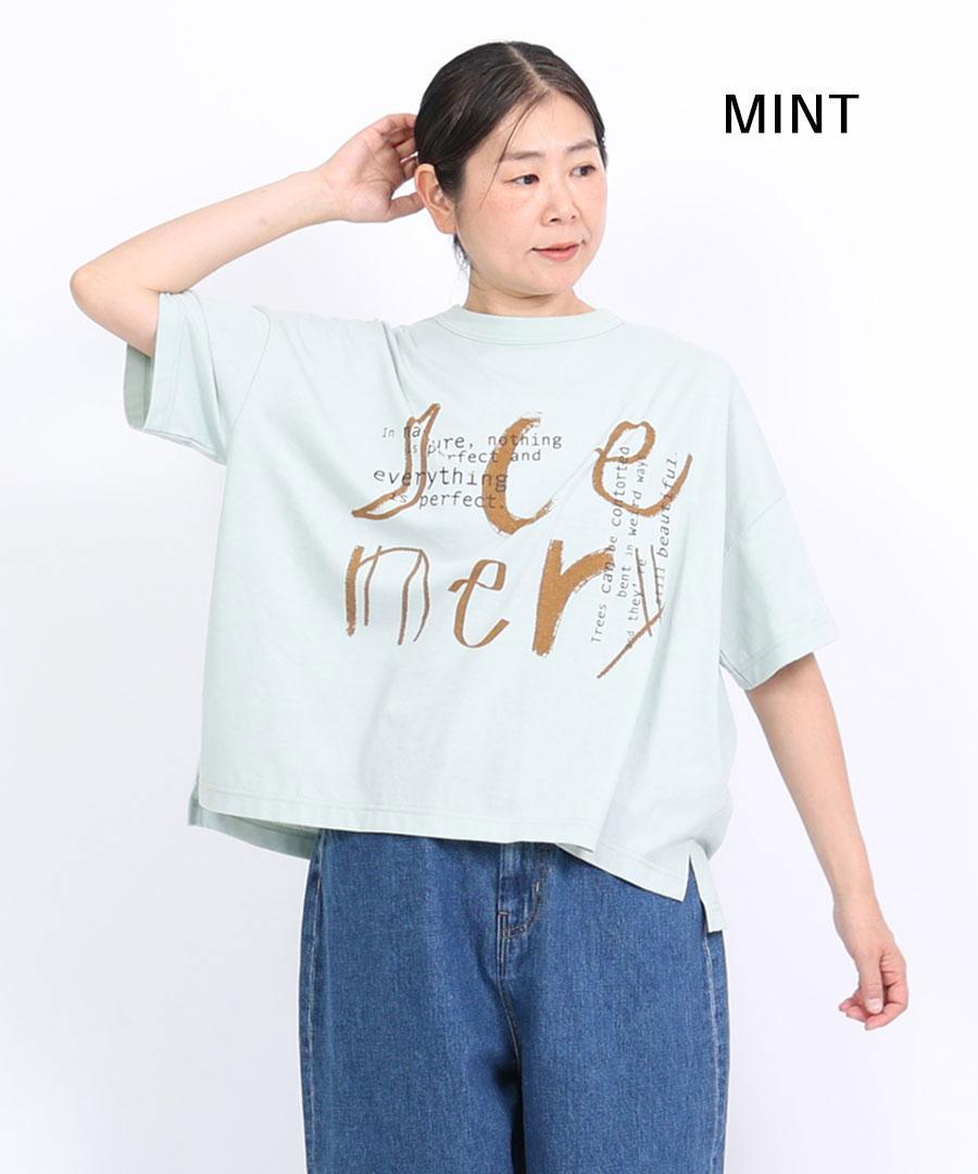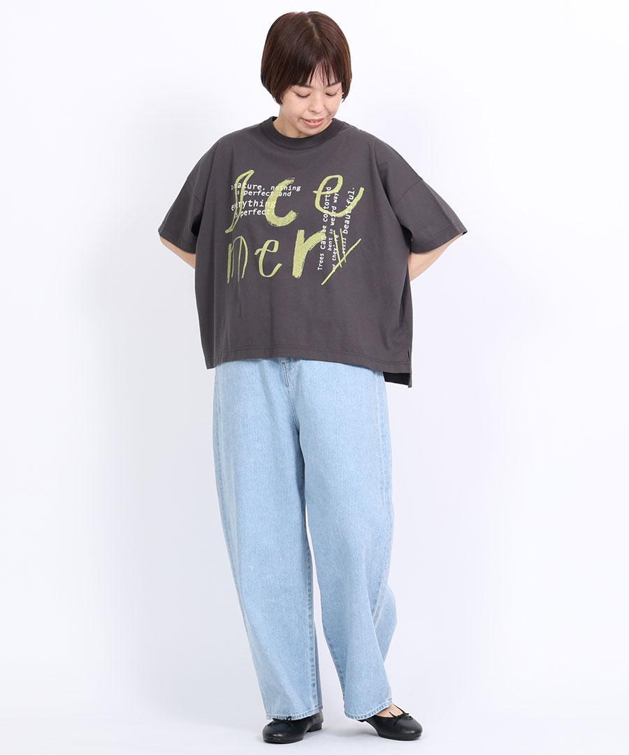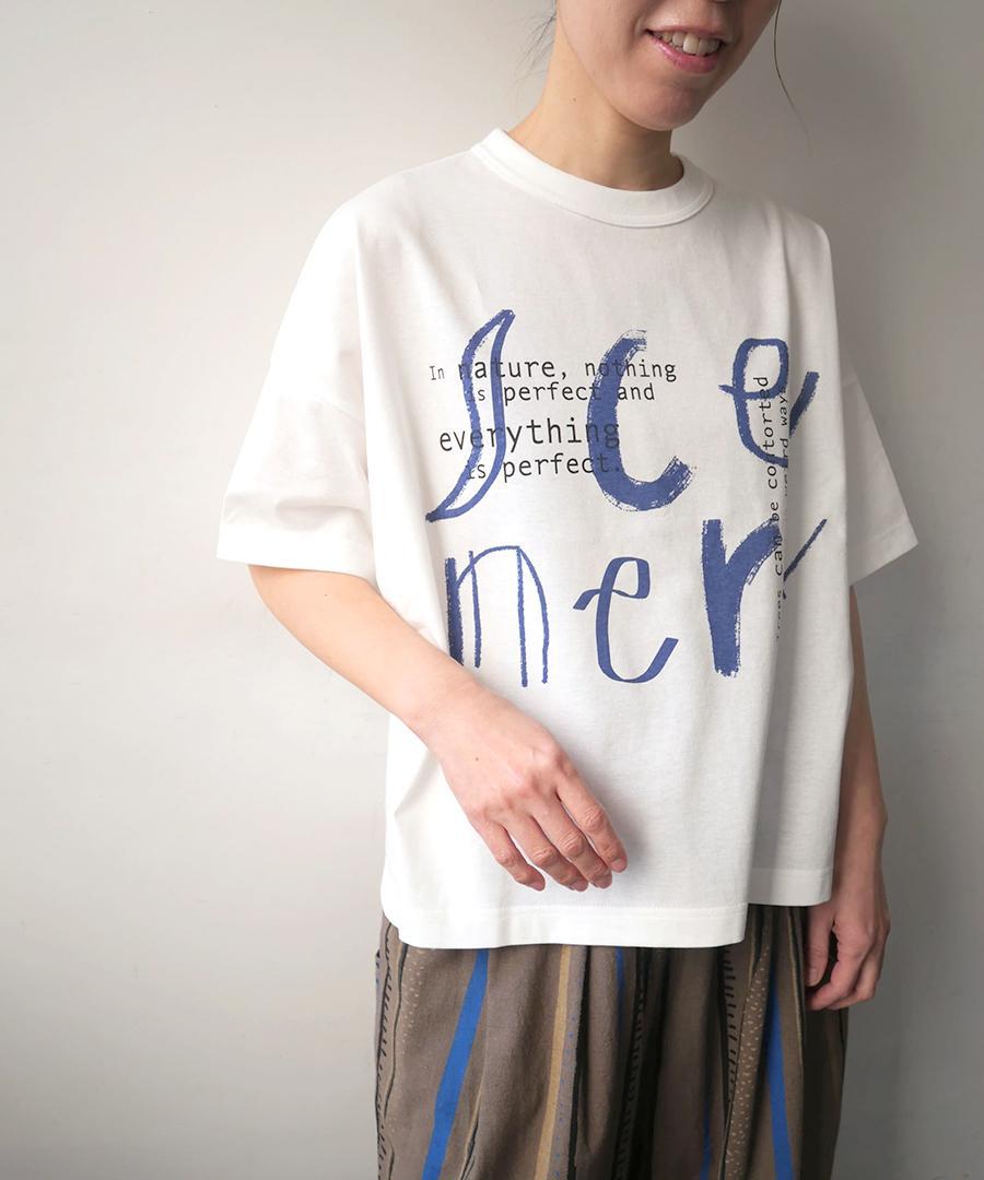 フロントには、手書き風の筆記体と大きくデザインされたアルファベットが組み合わされた、アーティスティックなロゴプリントが魅力です。