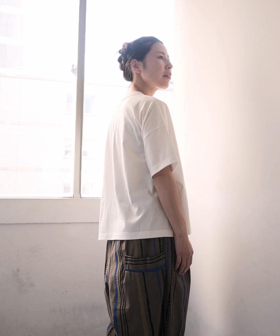 ワイドな身幅と、肩のラインが自然に落ちるドロップショルダーのデザインでゆったりとしたリラックス感のある着心地です。