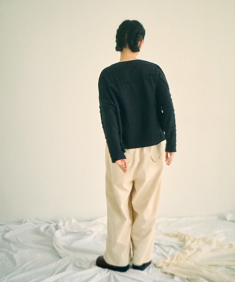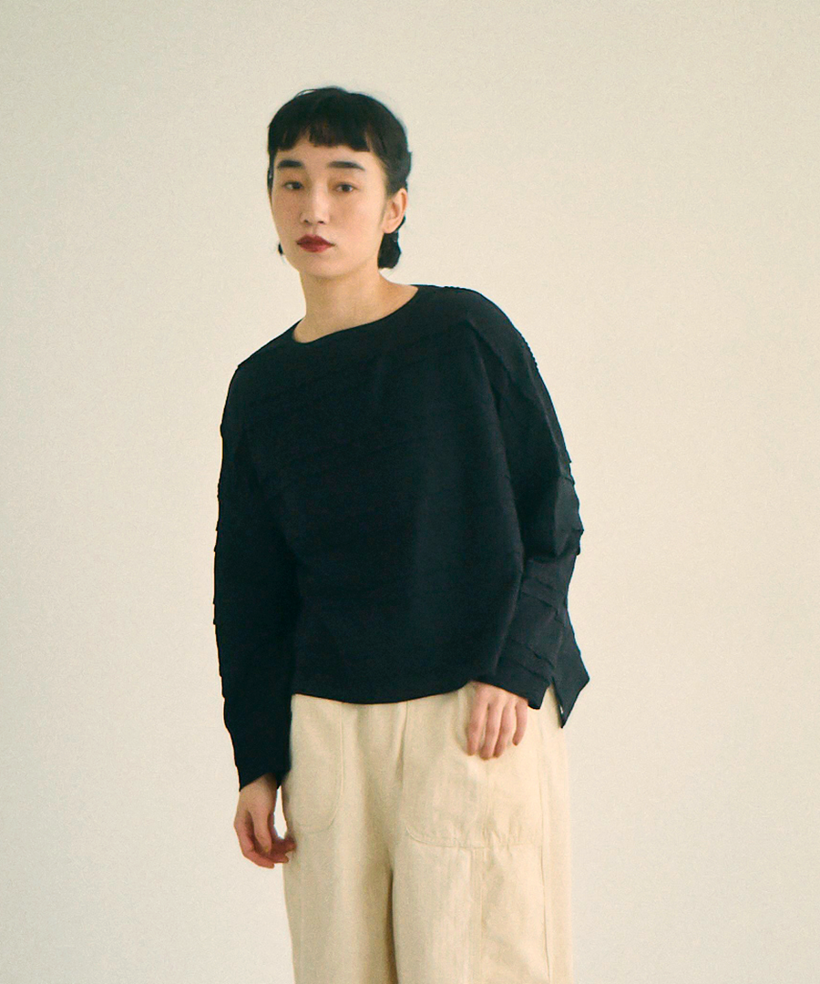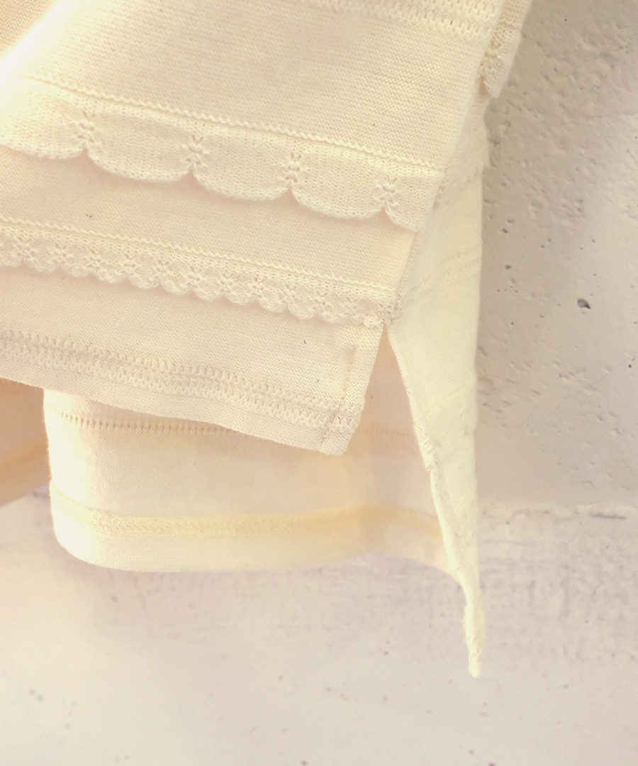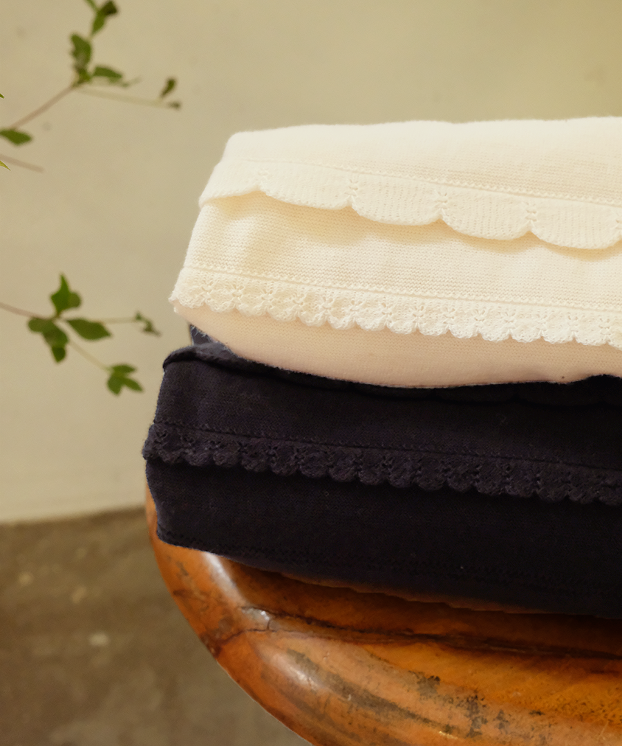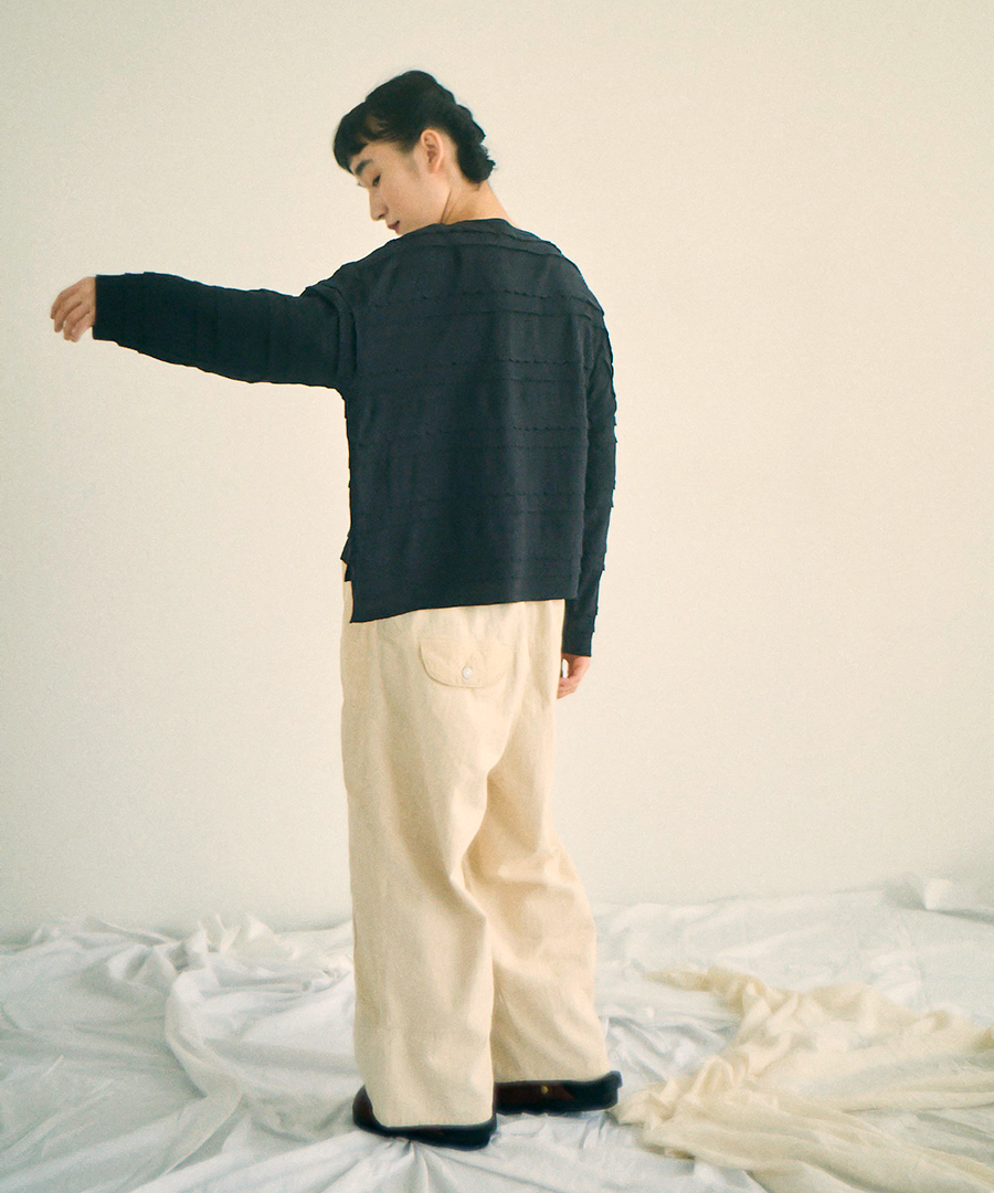 スカラップ状の立体的なボーダー柄が施されたジャガード素材を使用し、シンプルながらも存在感のある1枚に仕上げました。