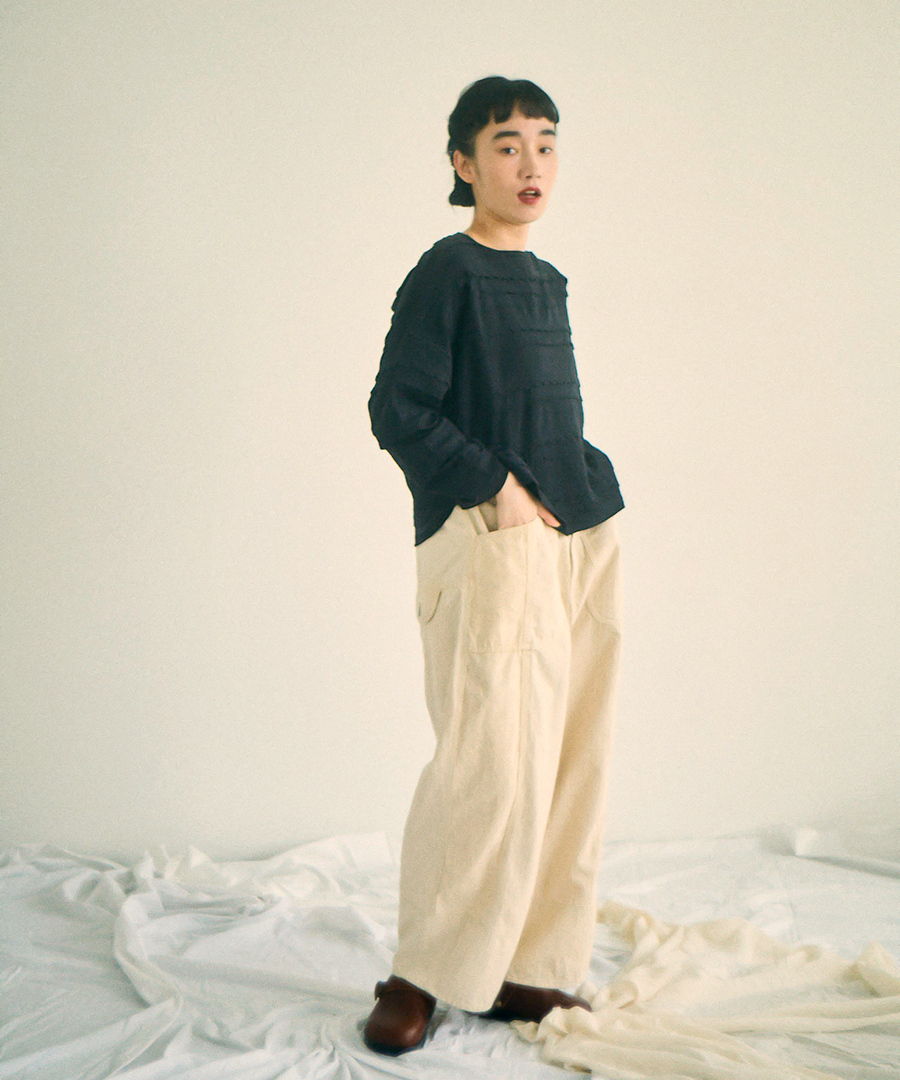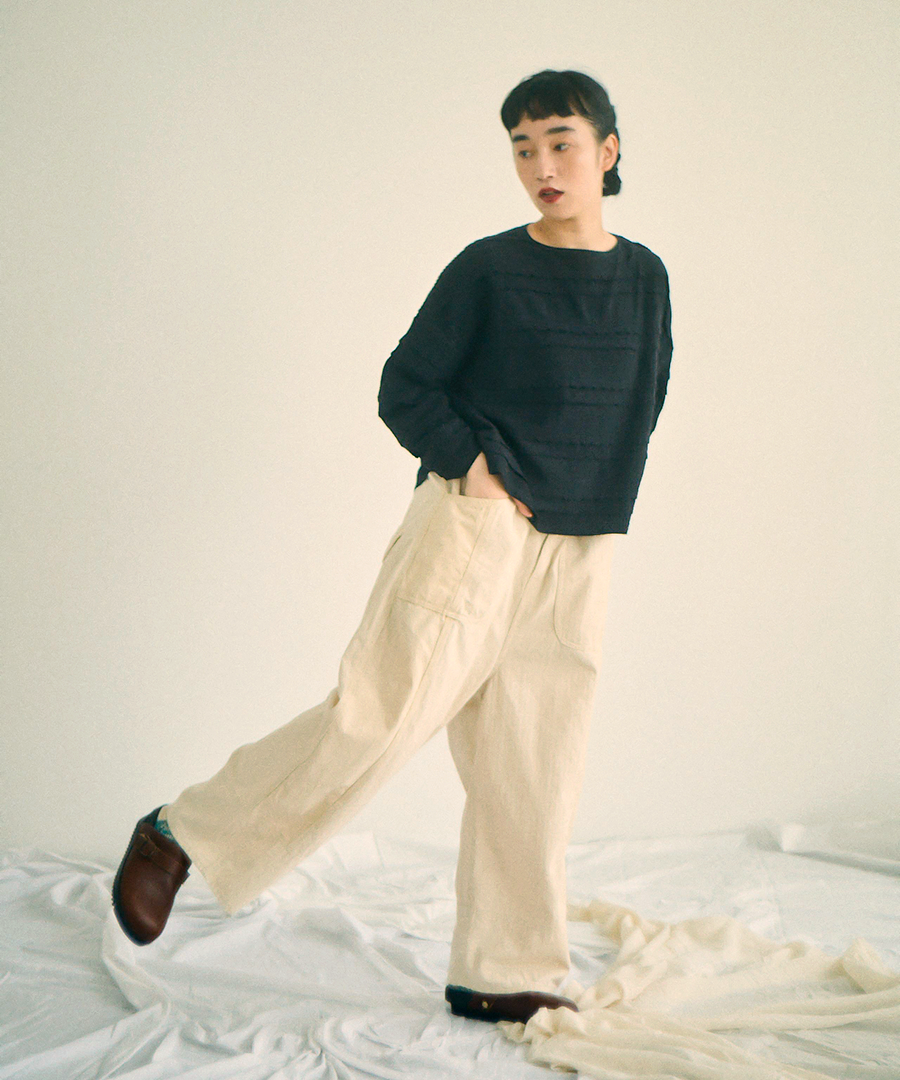 ぐーんとワイドな身幅でゆったりな着心地、前後差をつけた程よい丈感、両サイドにスリット入りでシルエットに変化をつけています。
