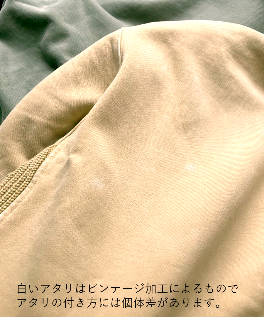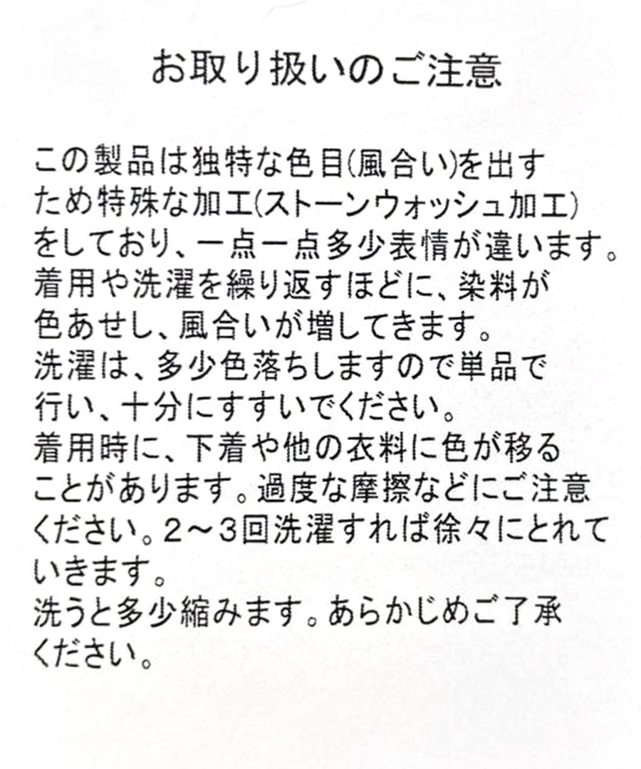 製品染めを施した後にストーンウォッシュ加工を施し、使い込んだような独特の色合いとヴィンテージのようなアタリのある表情豊かな風合いが魅力です。