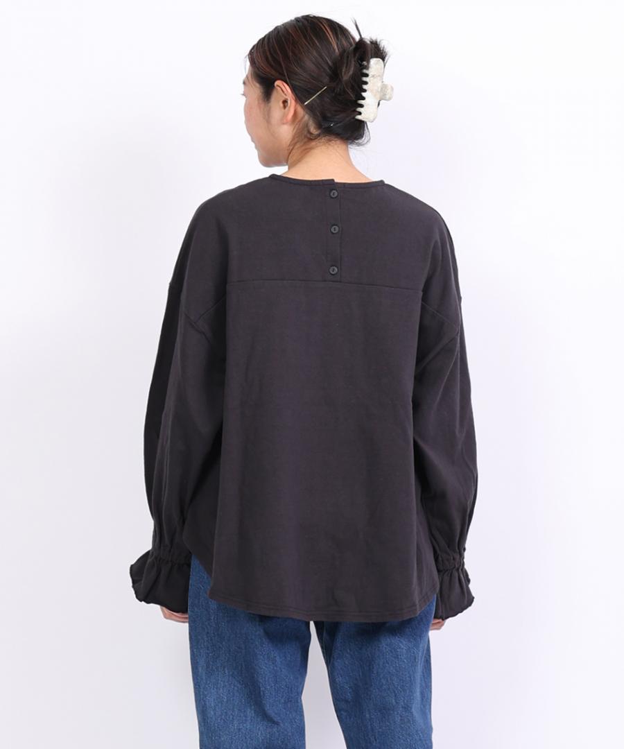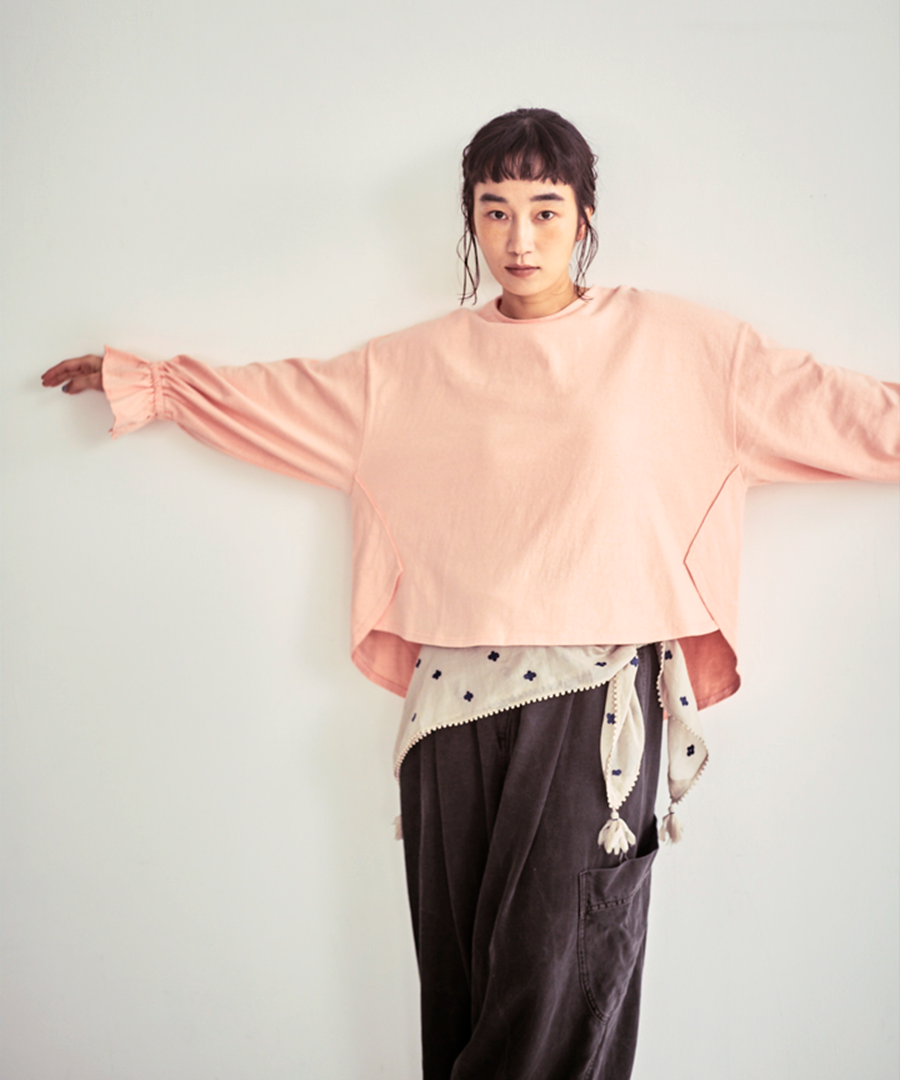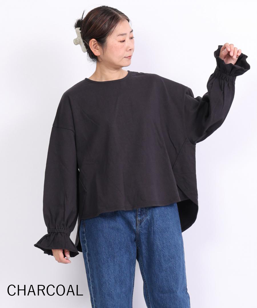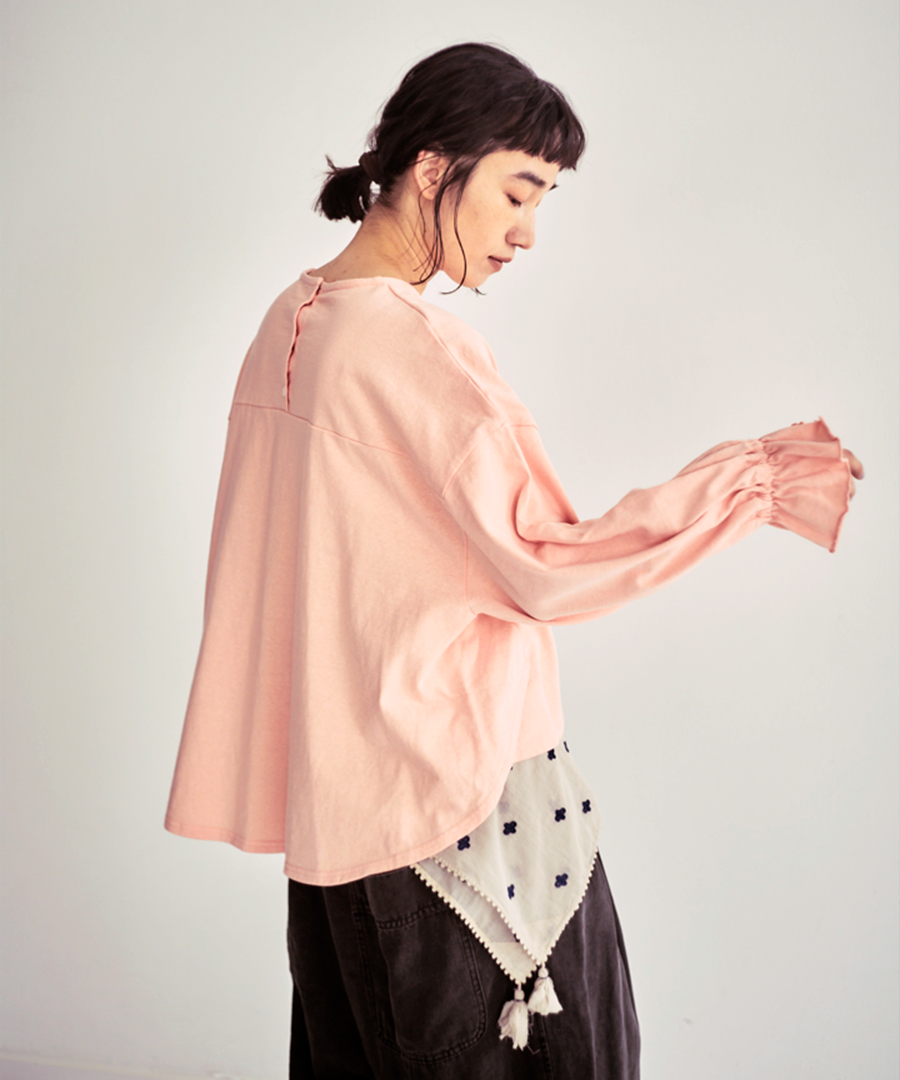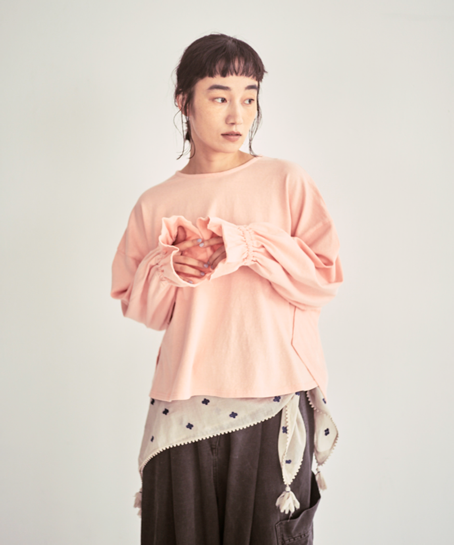 袖口にゴムを入れて寄せたフリルが、シンプルなデザインに甘さをプラス。そのまま着るのはもちろん、袖を少し捲り上げればボリュームをもたせたパフスリーブに。