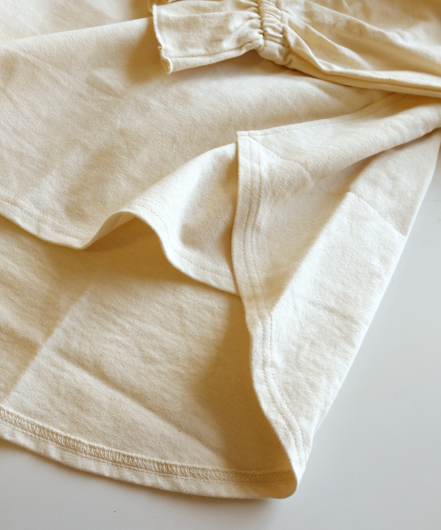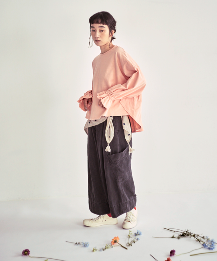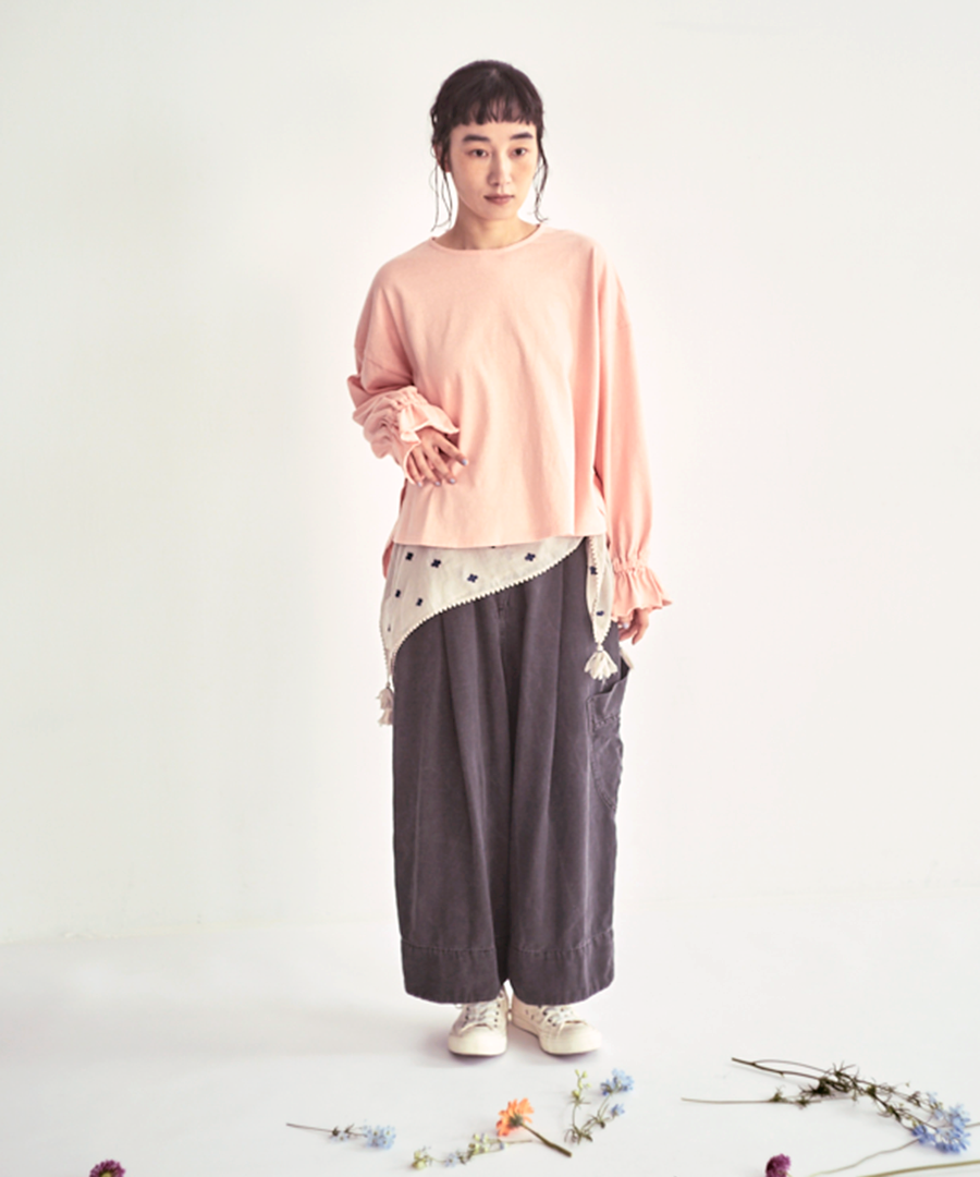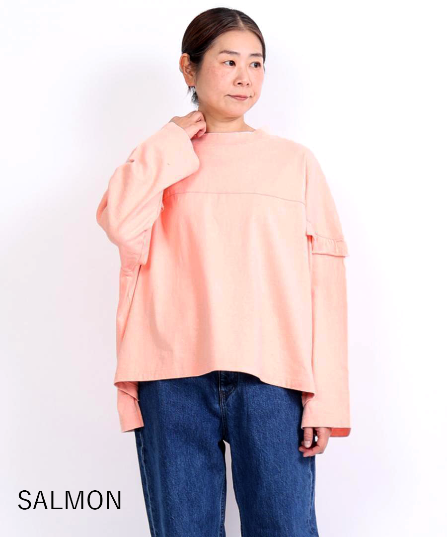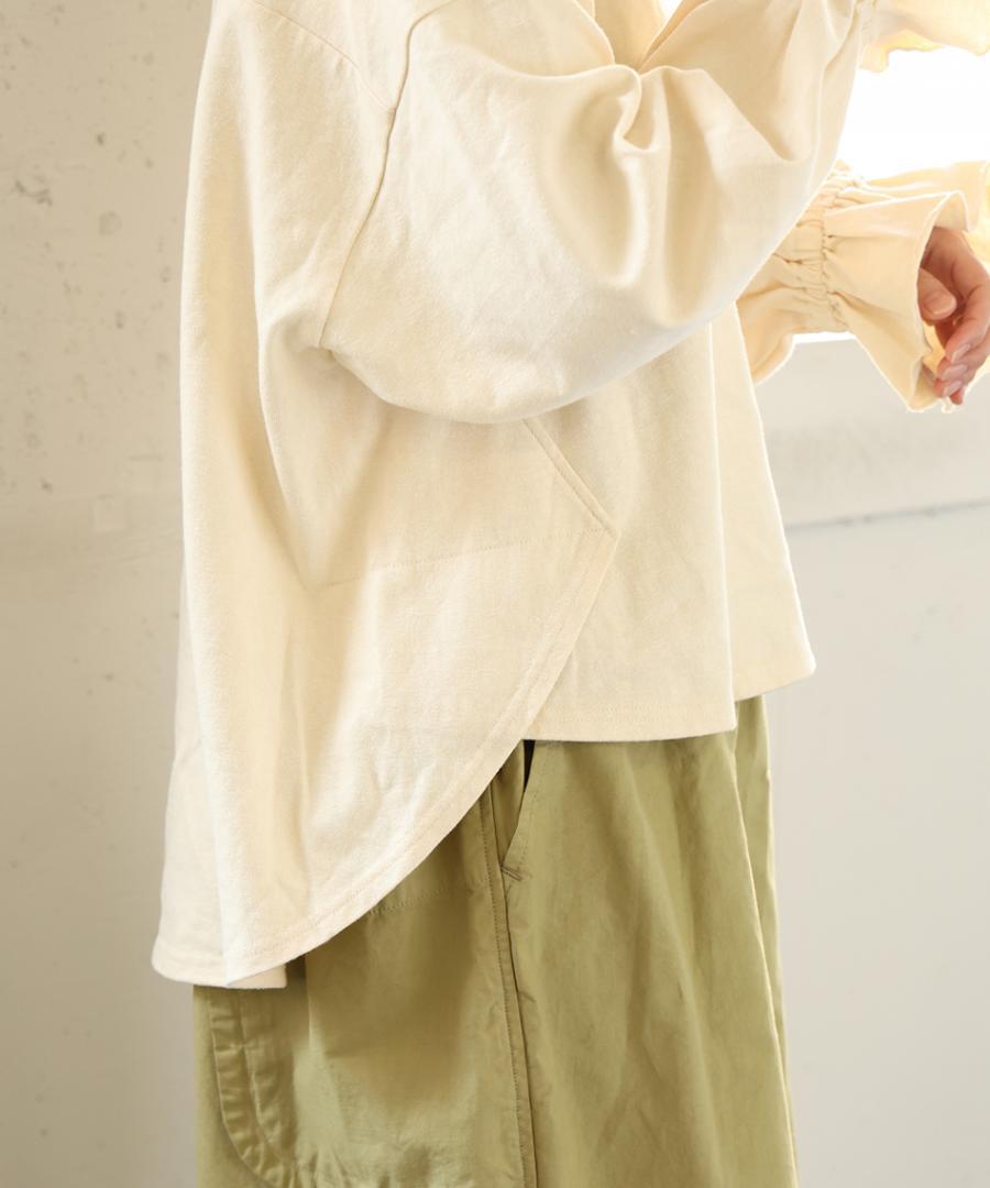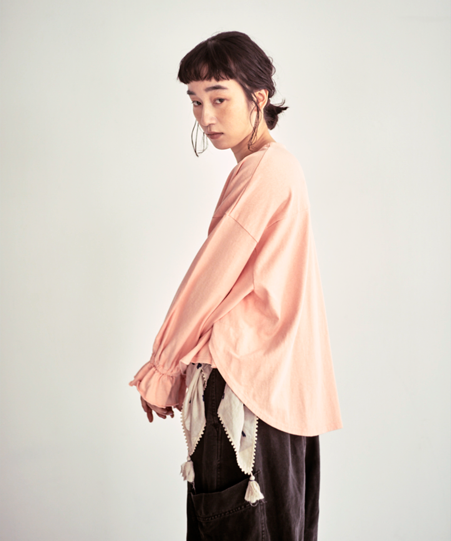 袖口にゴムを入れて寄せたフリルが、シンプルなデザインに甘さをプラス。そのまま着るのはもちろん、袖を少し捲り上げればボリュームをもたせたパフスリーブに。