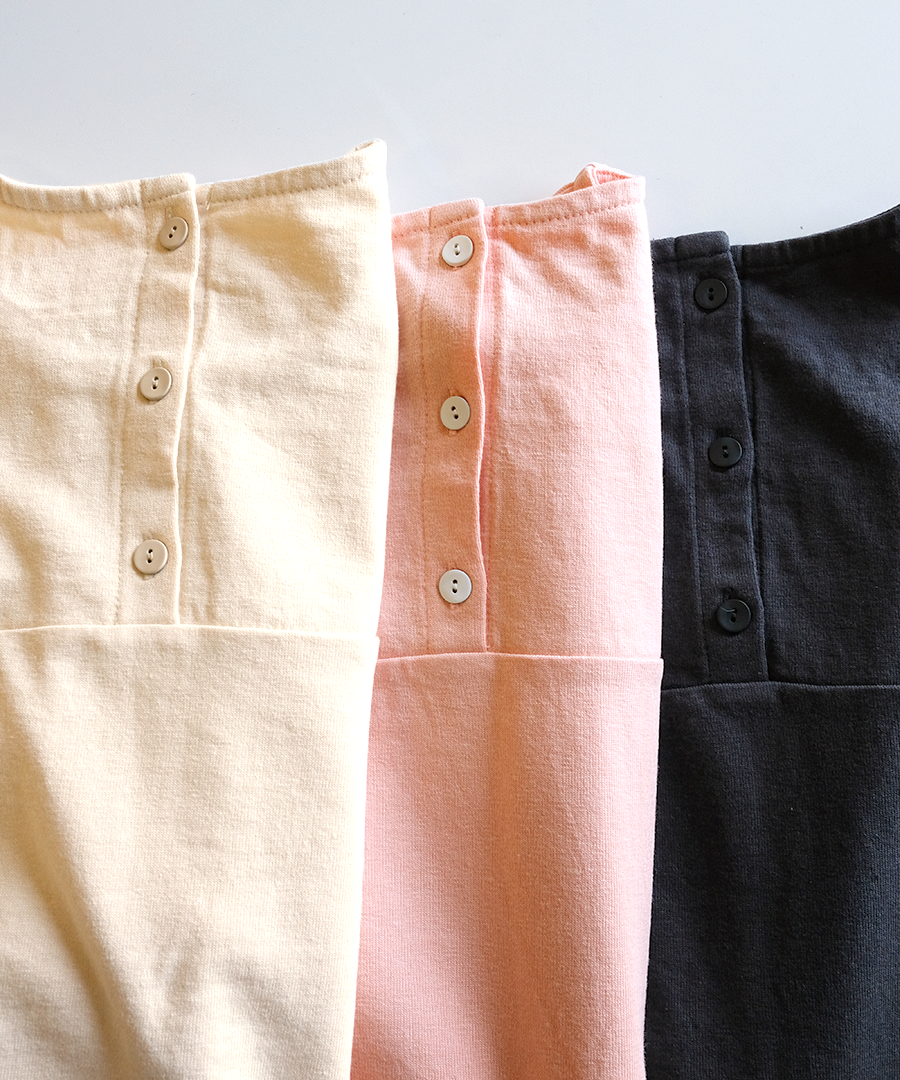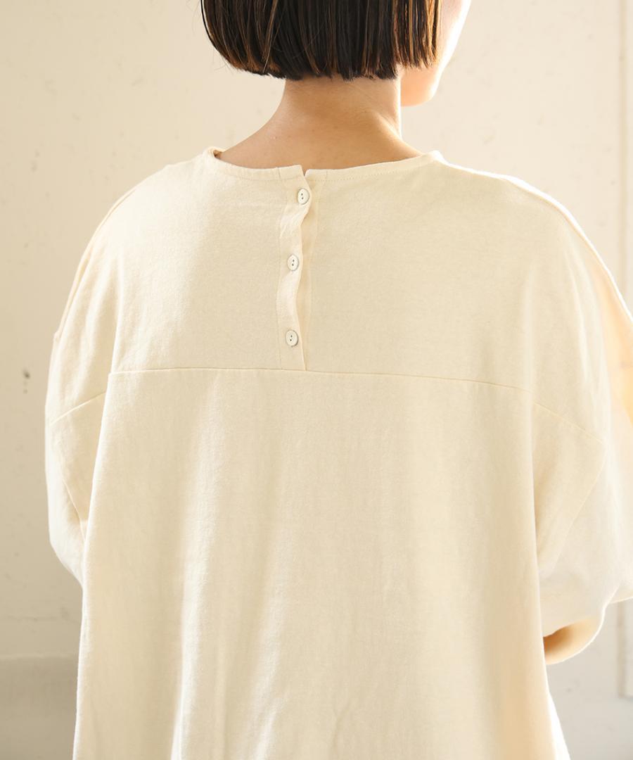 シンプルなカットソーに、切り替えを入れた立体的なフォルム。ワイドな身巾と大きくラウンドした裾でカラダのラインを拾わず、綺麗なシルエットを保ちます。背面の3つボタンが後ろ姿に程よいアクセント。