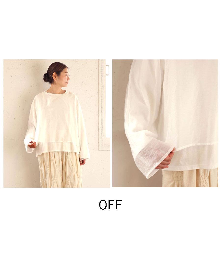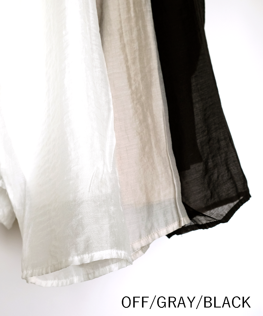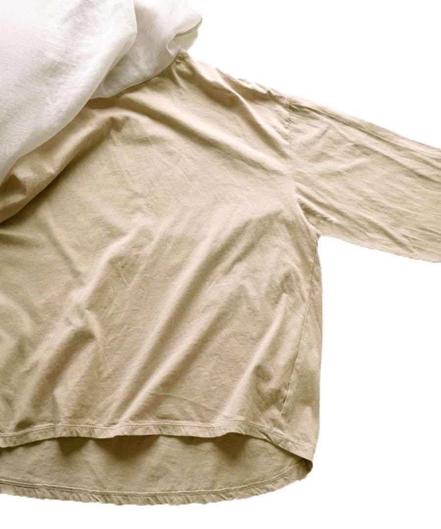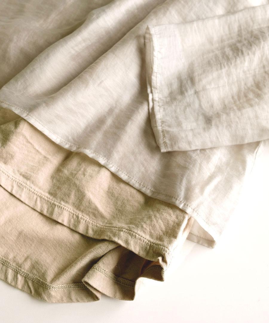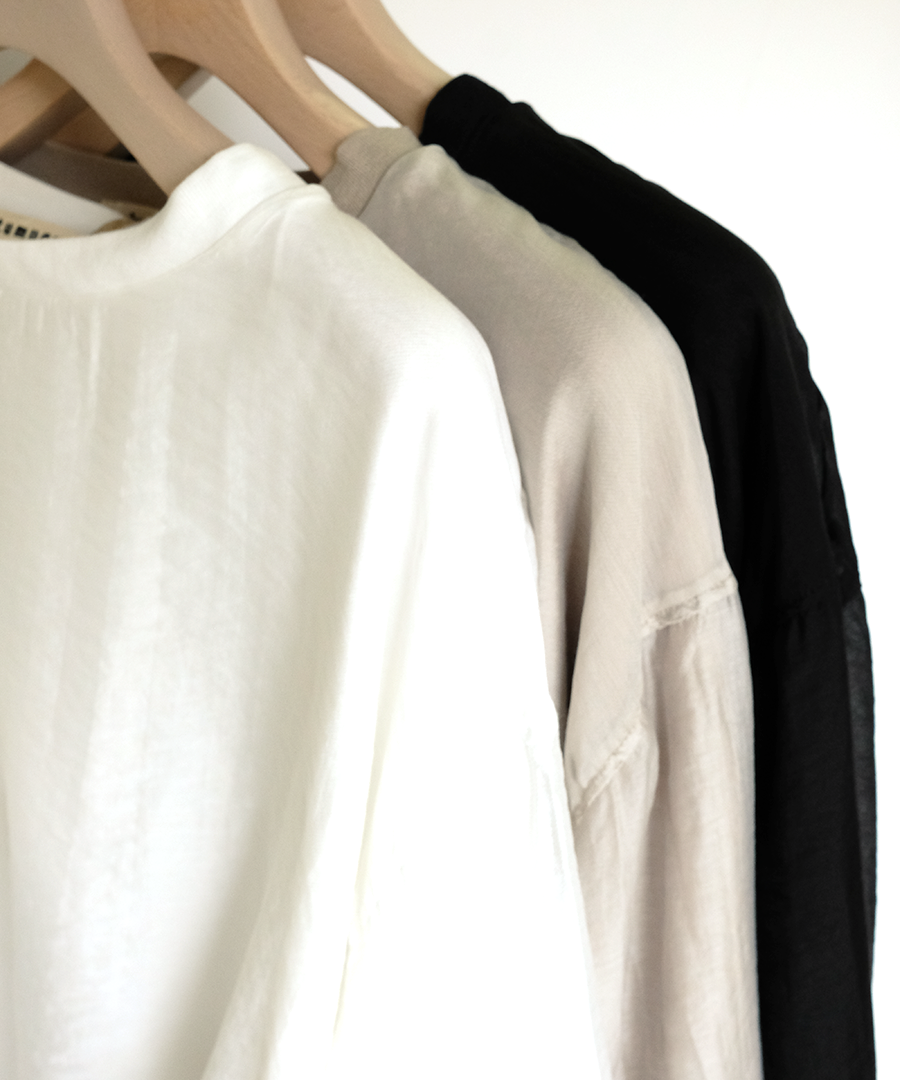 柔らかなコットン天竺と、上品な光沢感と透け感のあるエアシアーツイルを贅沢に重ねました。シンプルながらも、素材の重なりが着こなしに程よいアクセントを添えてくれます。