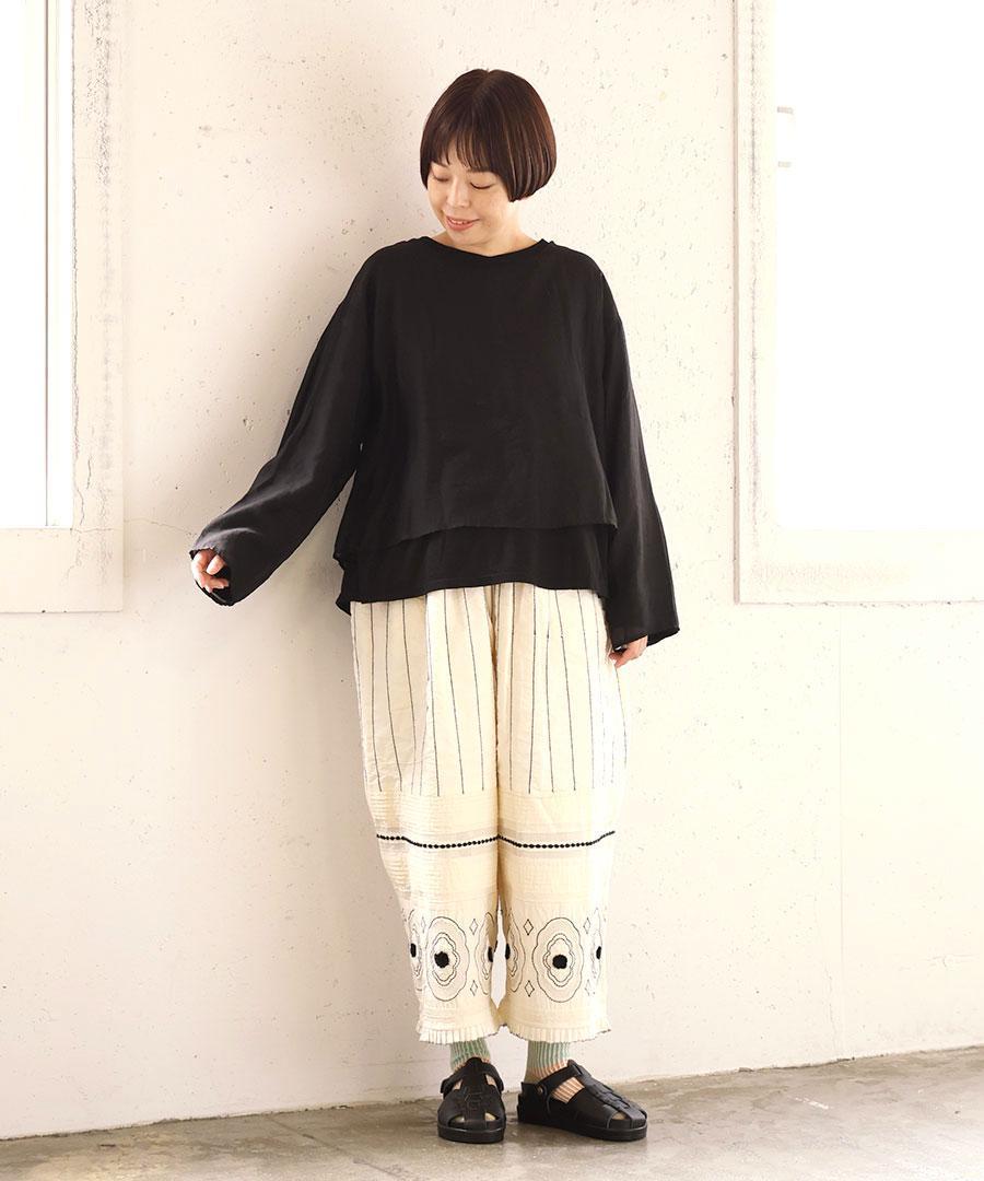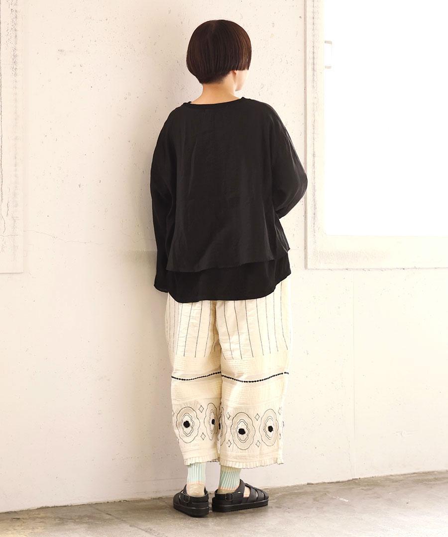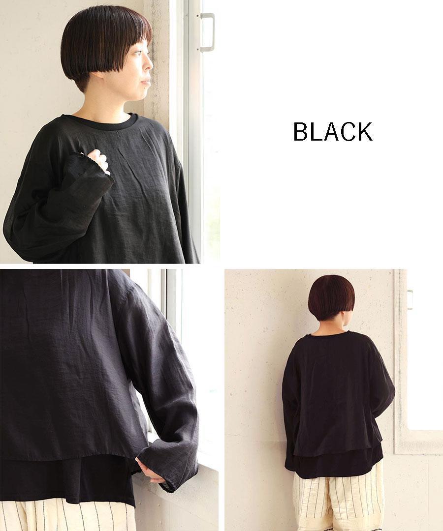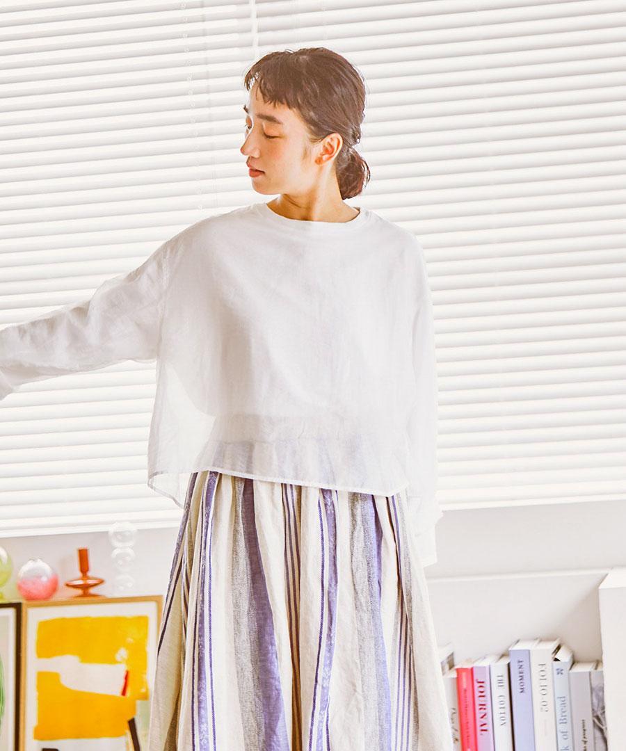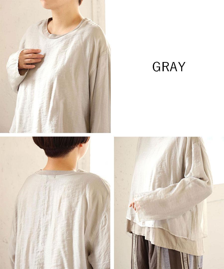 柔らかなコットン天竺と、上品な光沢感と透け感のあるエアシアーツイルを贅沢に重ねました。シンプルながらも、素材の重なりが着こなしに程よいアクセントを添えてくれます。