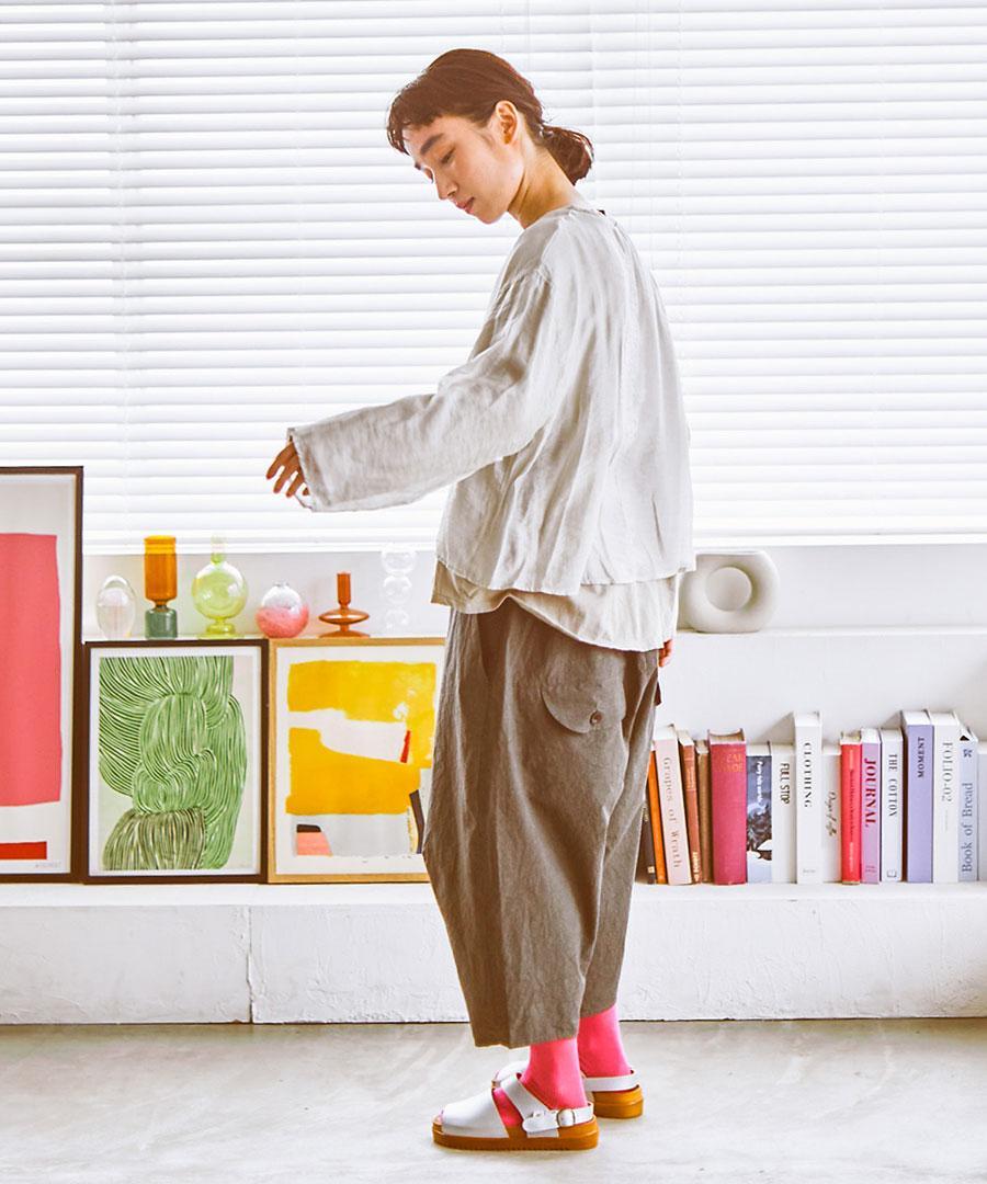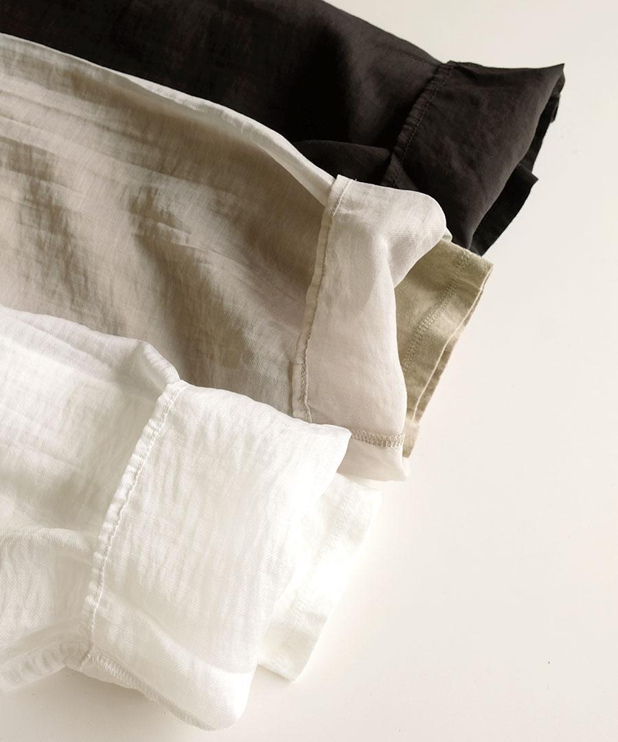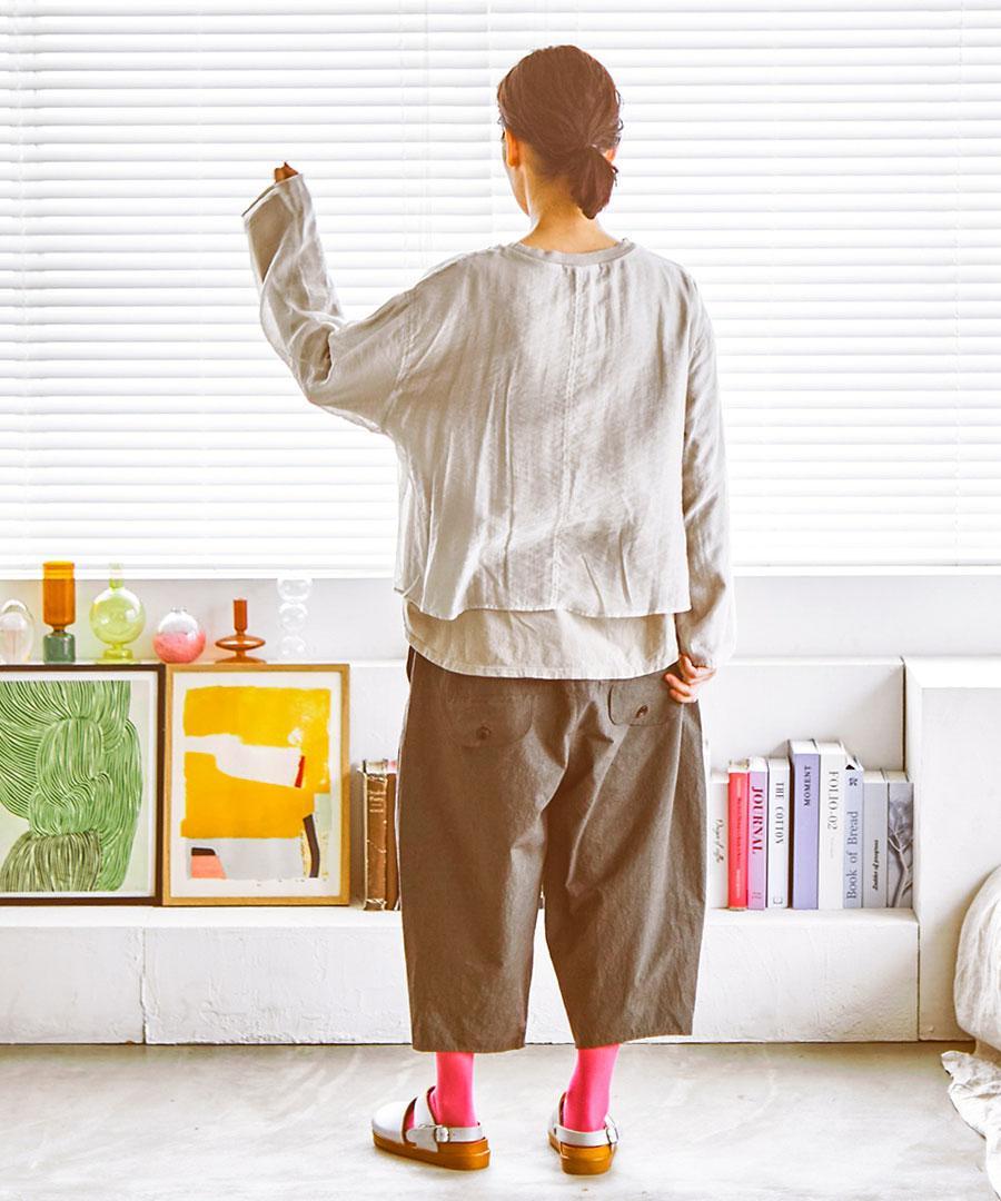 洗い加工を施した生地は、肌に優しく馴染むナチュラルな風合いが魅力。ゆったりとした落ち感のあるシルエットで、自分らしいリラックスした着こなしに寄り添います。