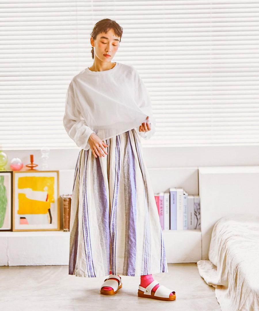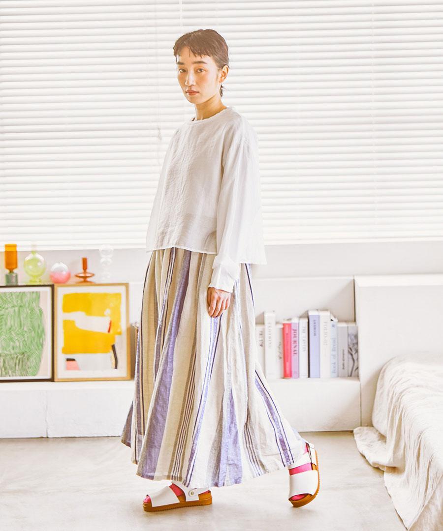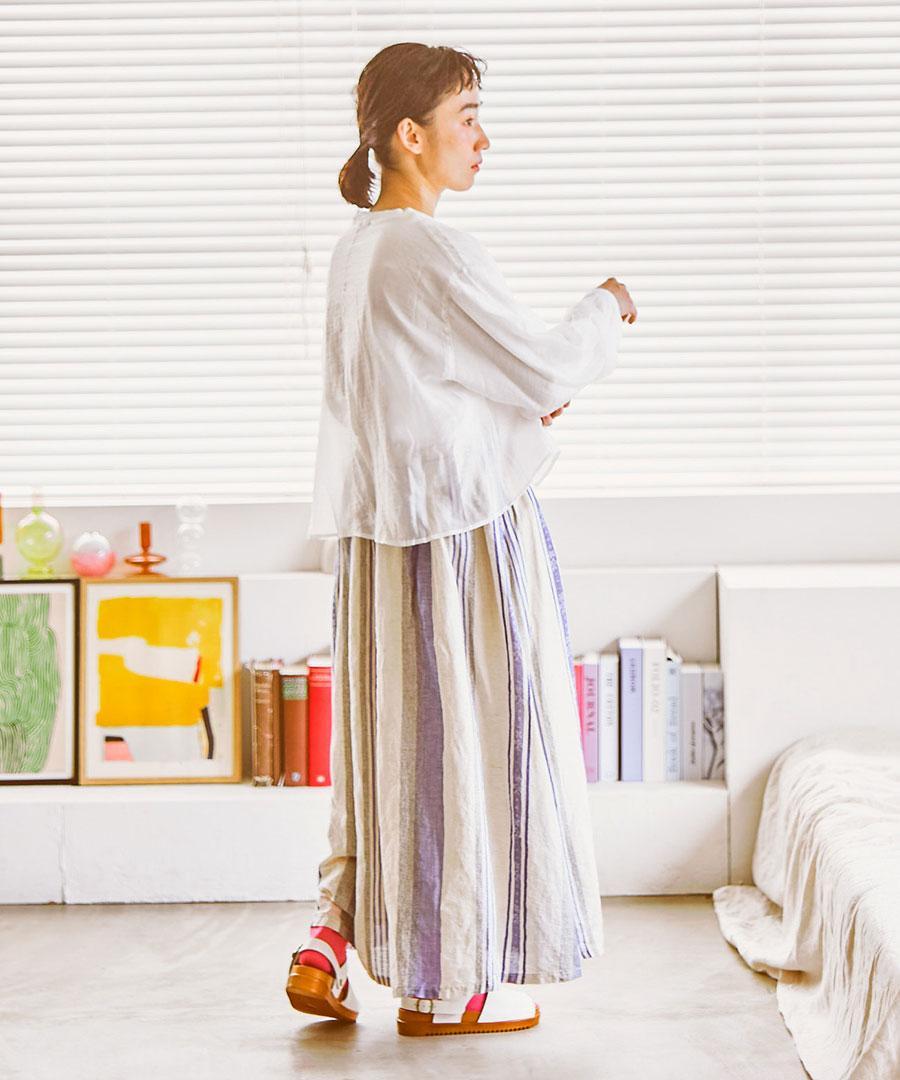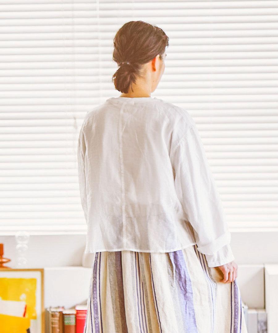 洗い加工を施した生地は、肌に優しく馴染むナチュラルな風合いが魅力。ゆったりとした落ち感のあるシルエットで、自分らしいリラックスした着こなしに寄り添います。