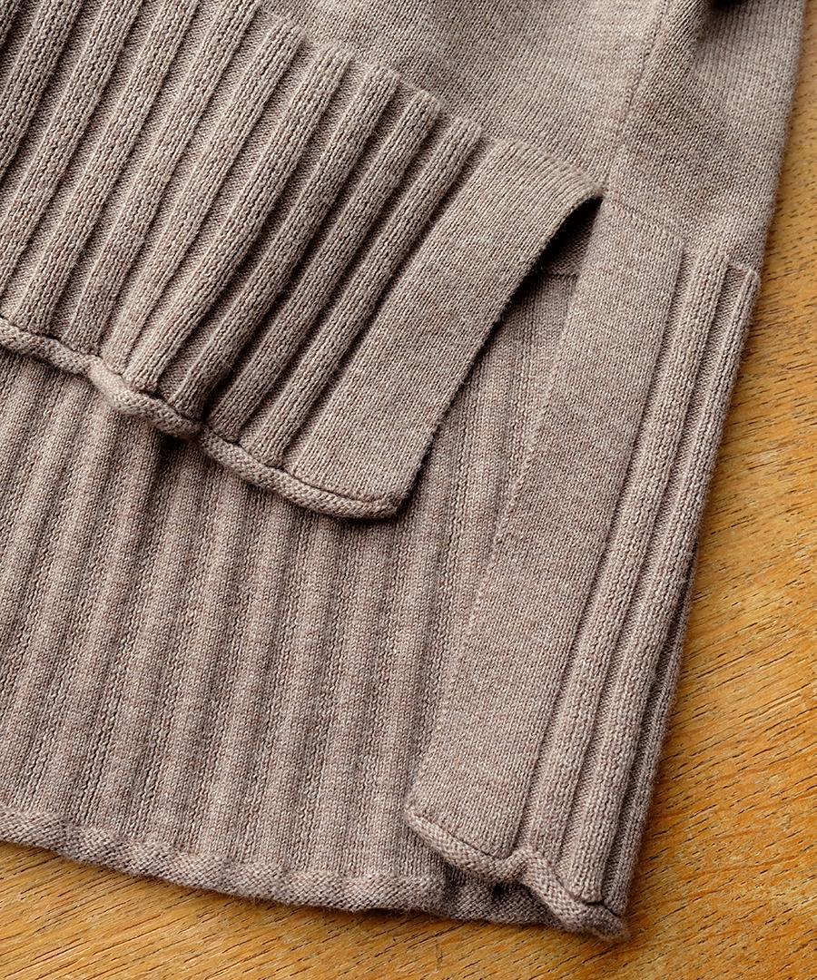 裾はリブを効かせたデザインで単調に見えない工夫がされており、同色のクルミボタンが上品な印象をプラス。