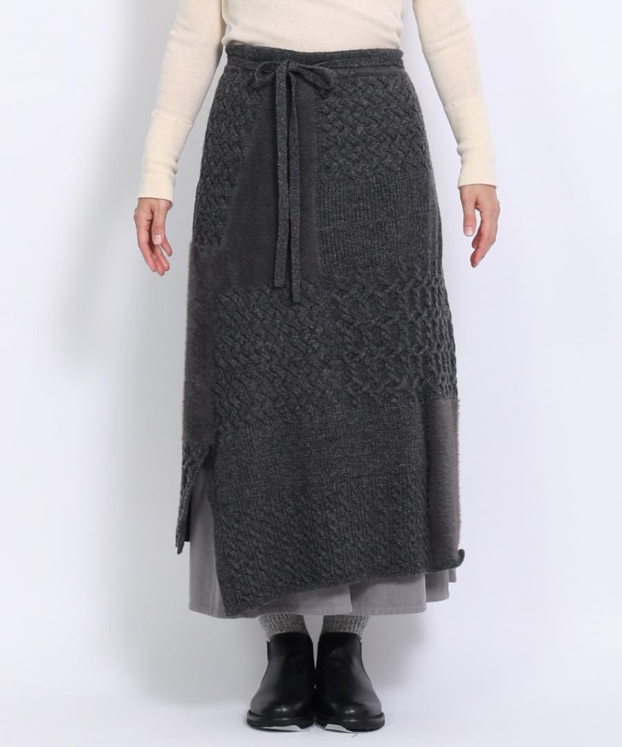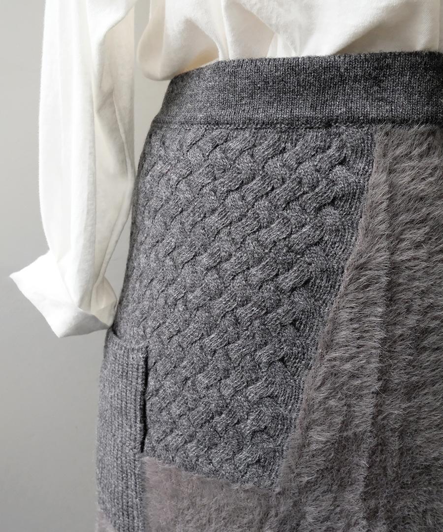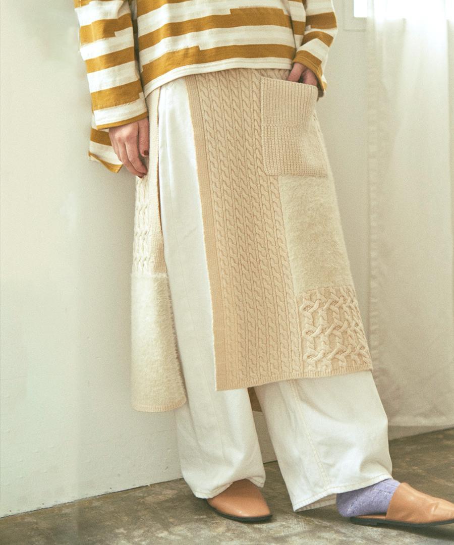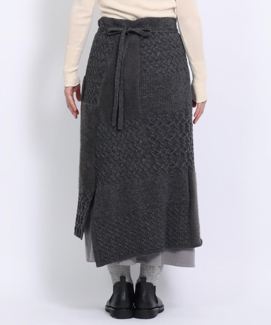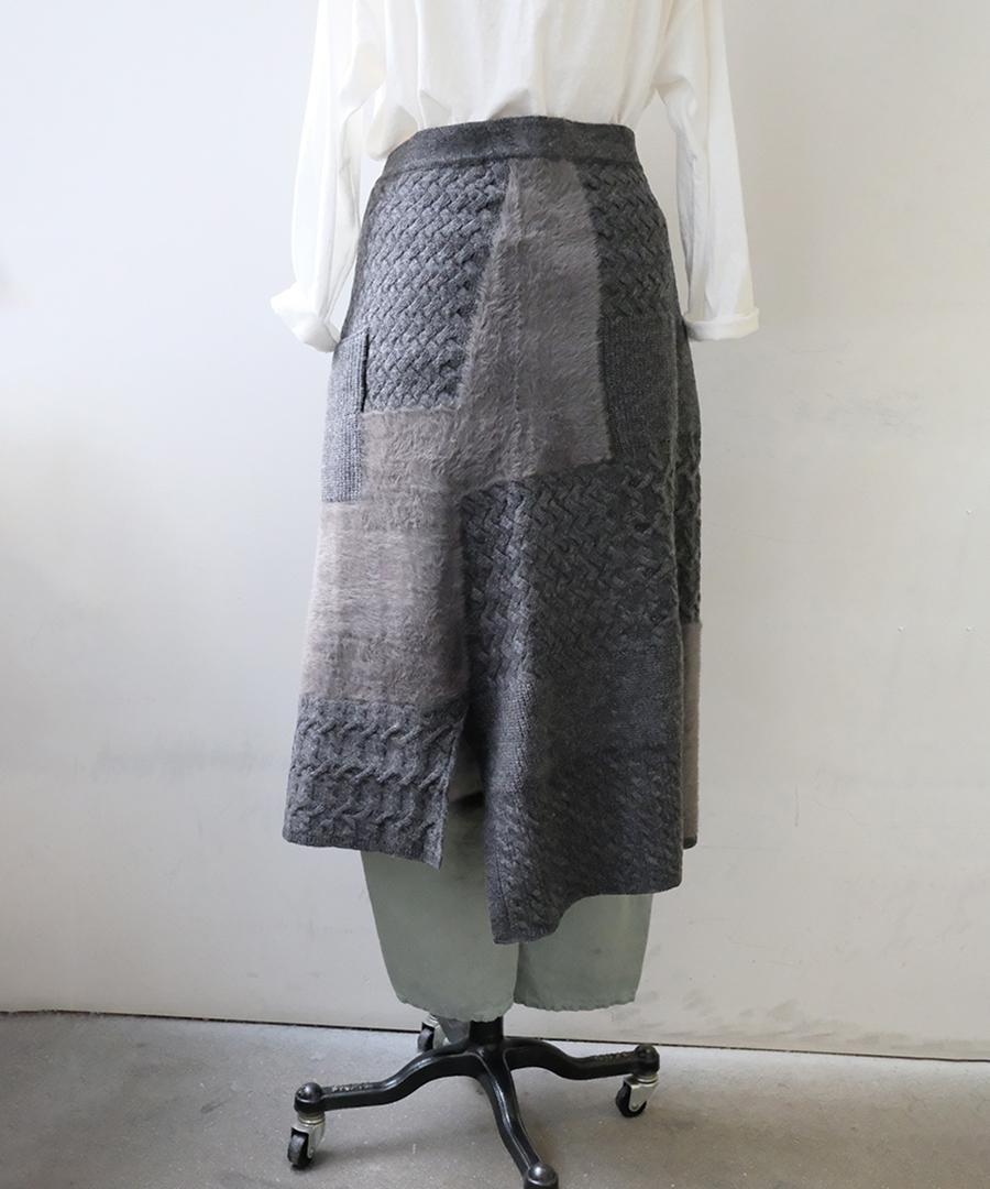 ラムウールとフェザーの2種類の糸を使用し、さまざまな編地をパッチワークで組み合わせたエプロンスカート。