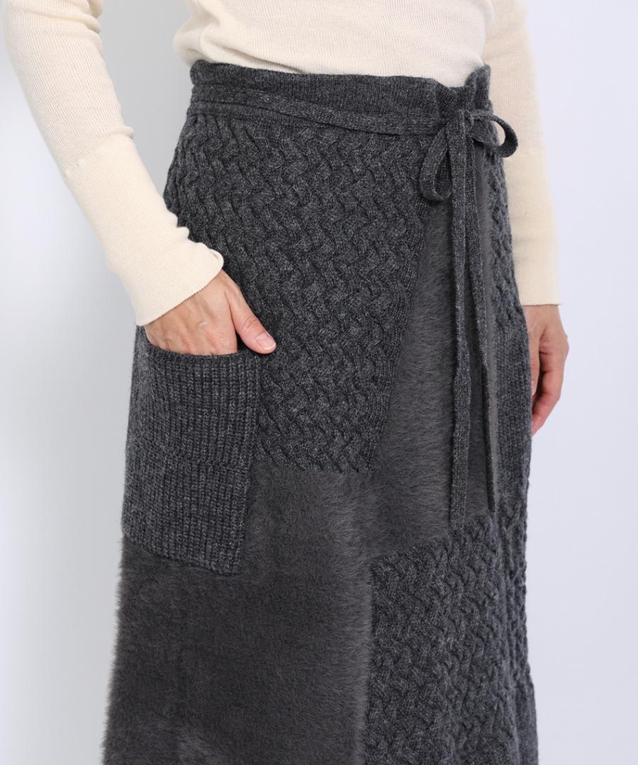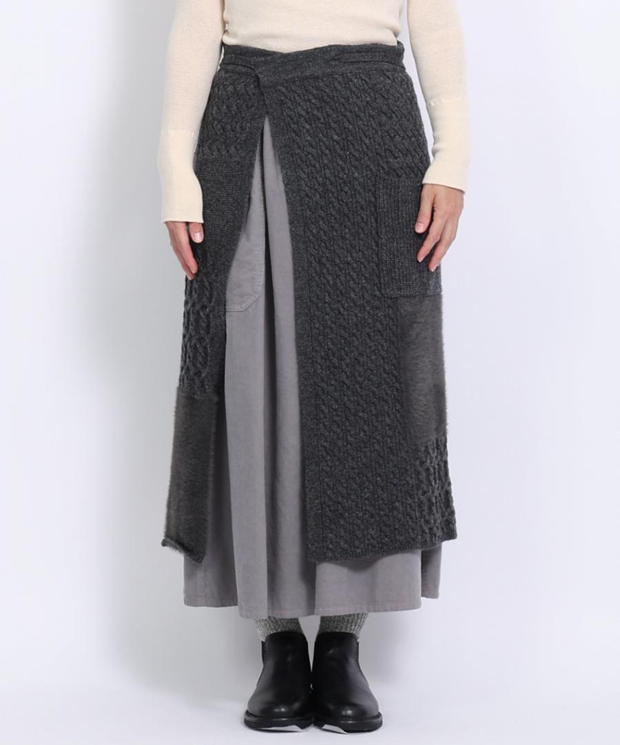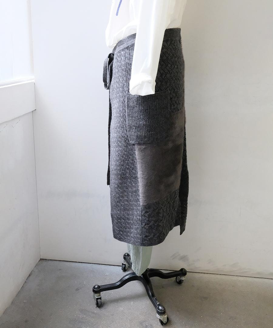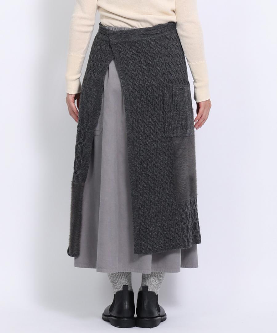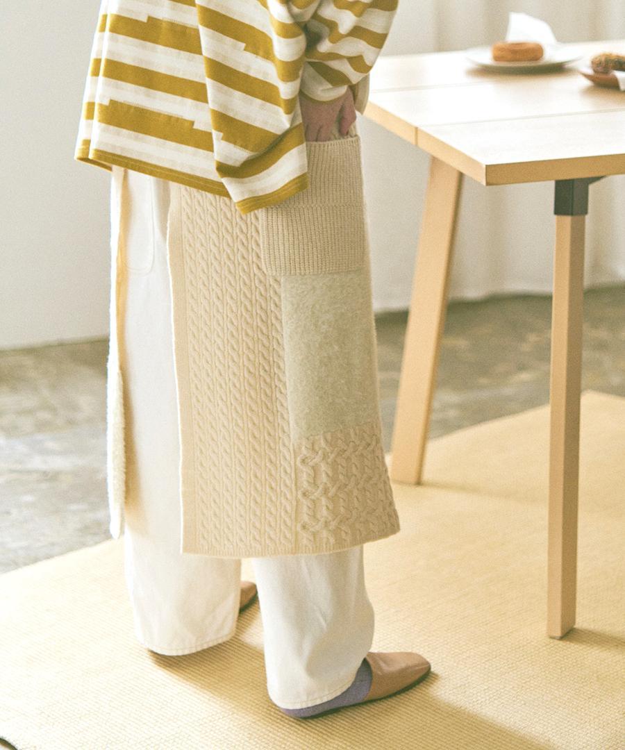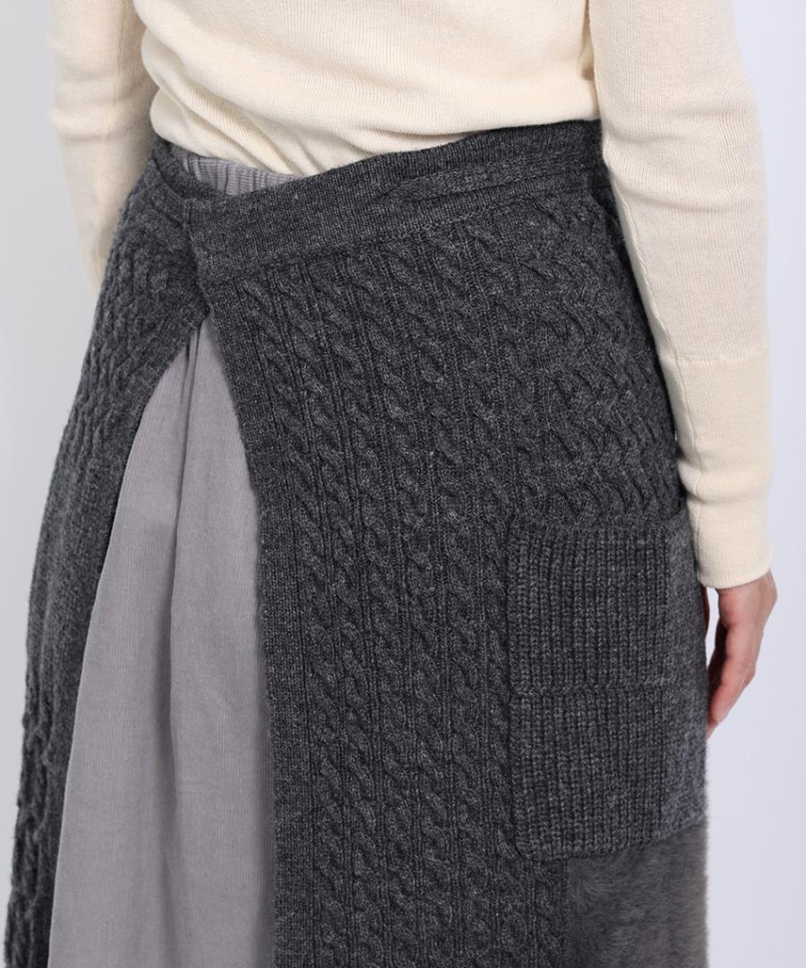 ラムウールとフェザーの2種類の糸を使用し、さまざまな編地をパッチワークで組み合わせたエプロンスカート。