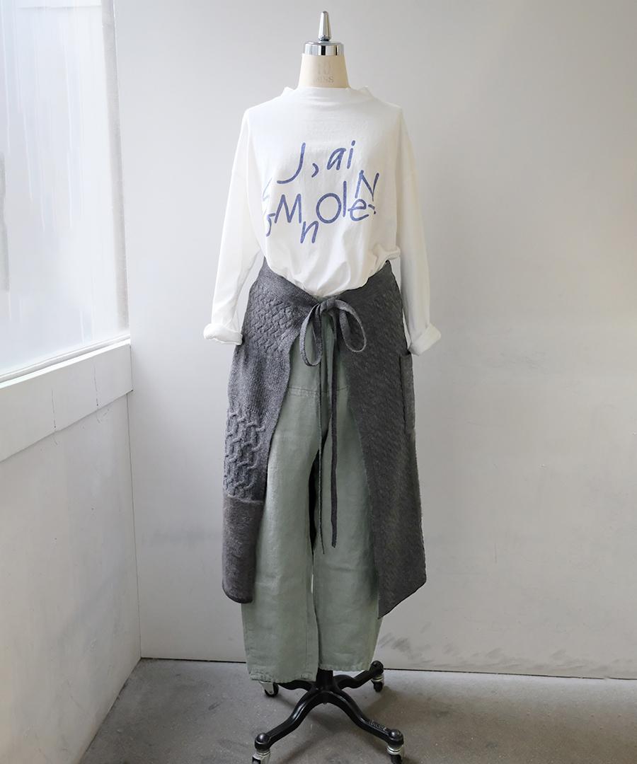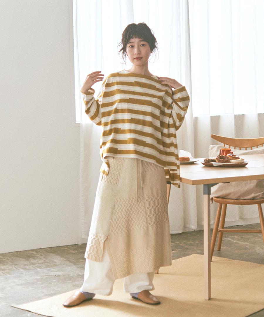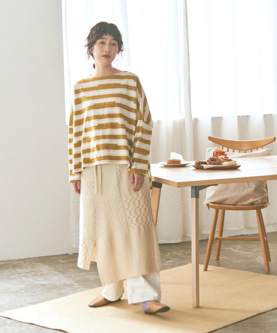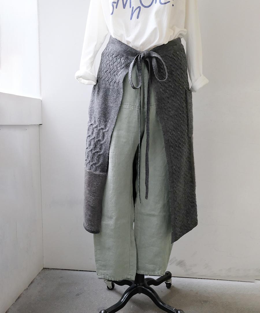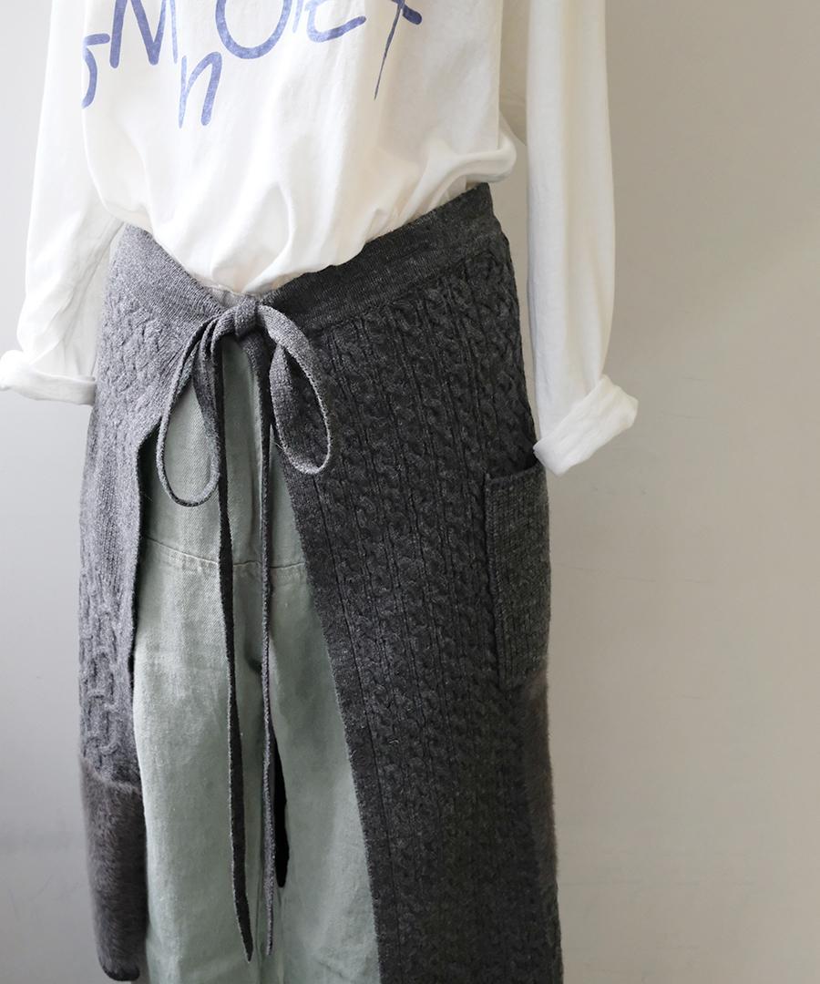 ラムウールとフェザーの2種類の糸を使用し、さまざまな編地をパッチワークで組み合わせたエプロンスカート。