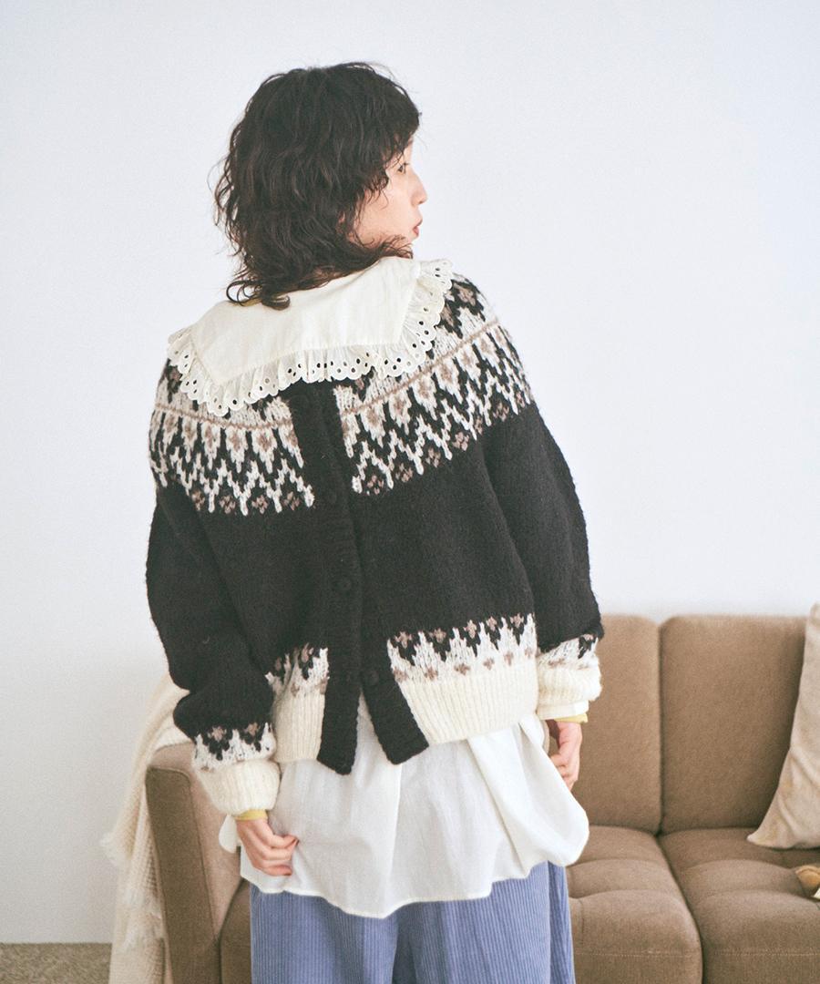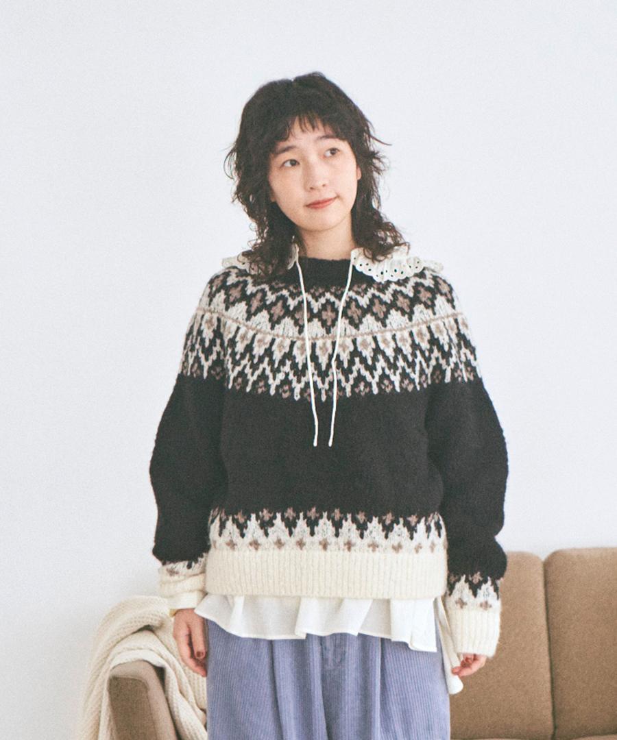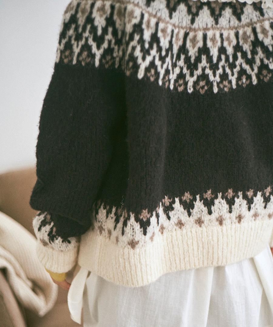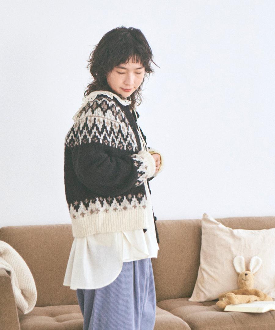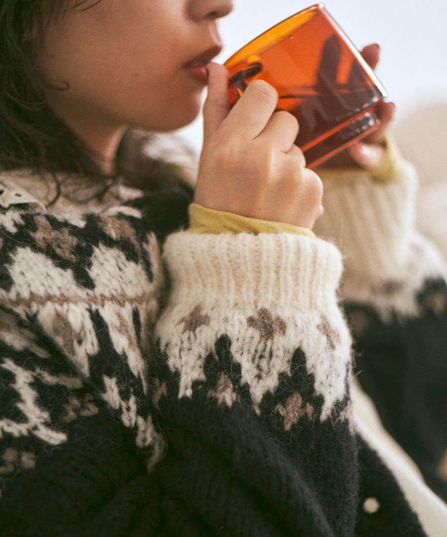 温かみのあるノルディックジャガード柄がシンプルになりがちなコーデに華やかさを与えてくれます。