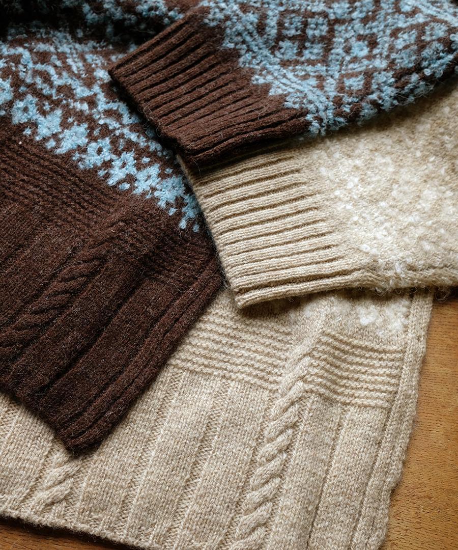 ふっくらとしたウールの糸をベースに柄部分をループ糸で表現した立体感のあるジャガード編みです。