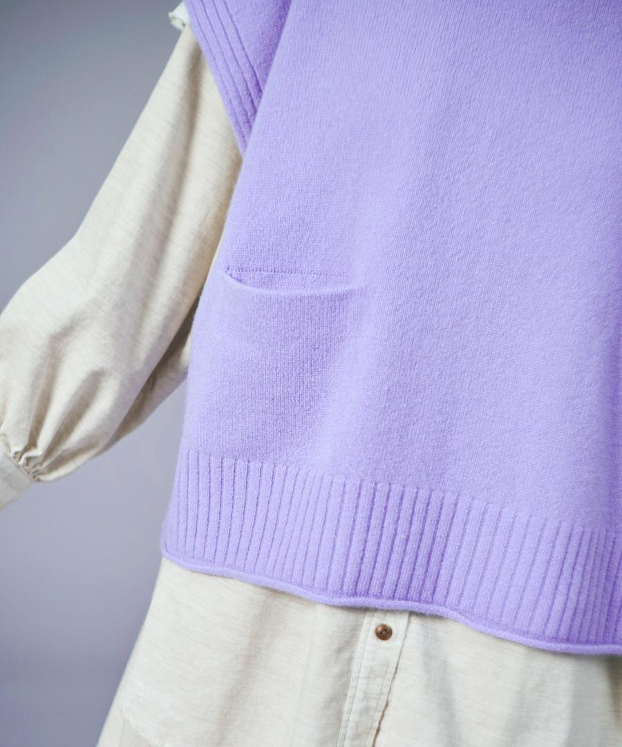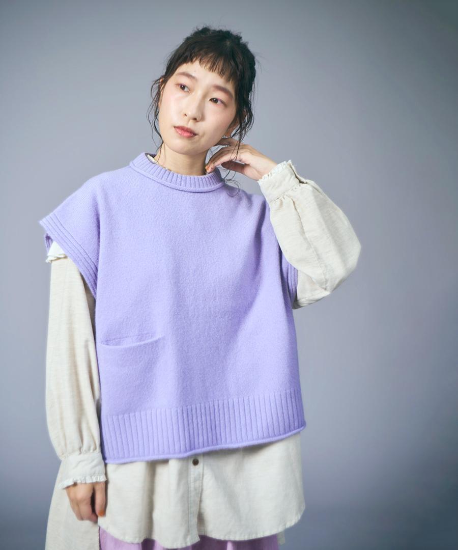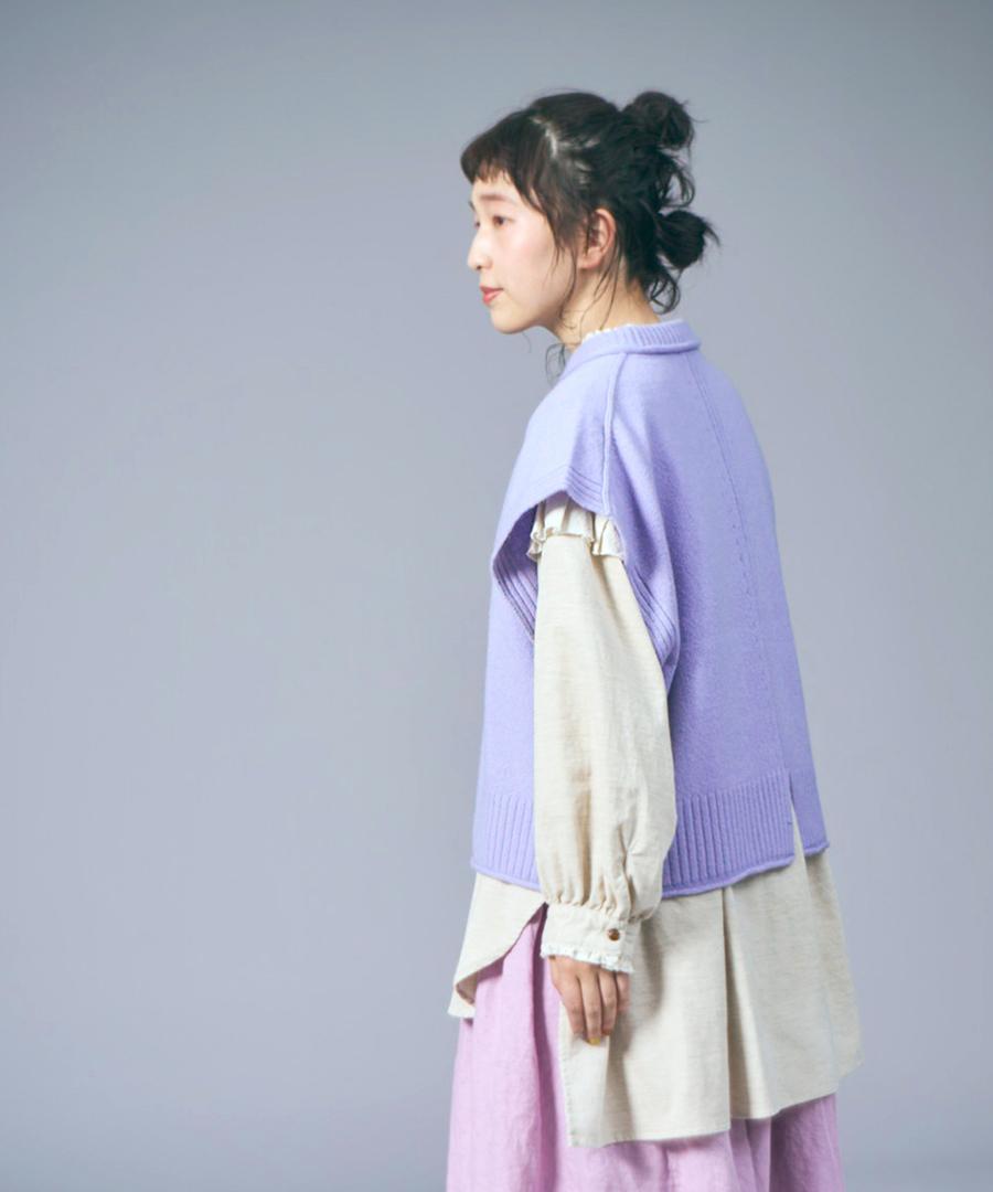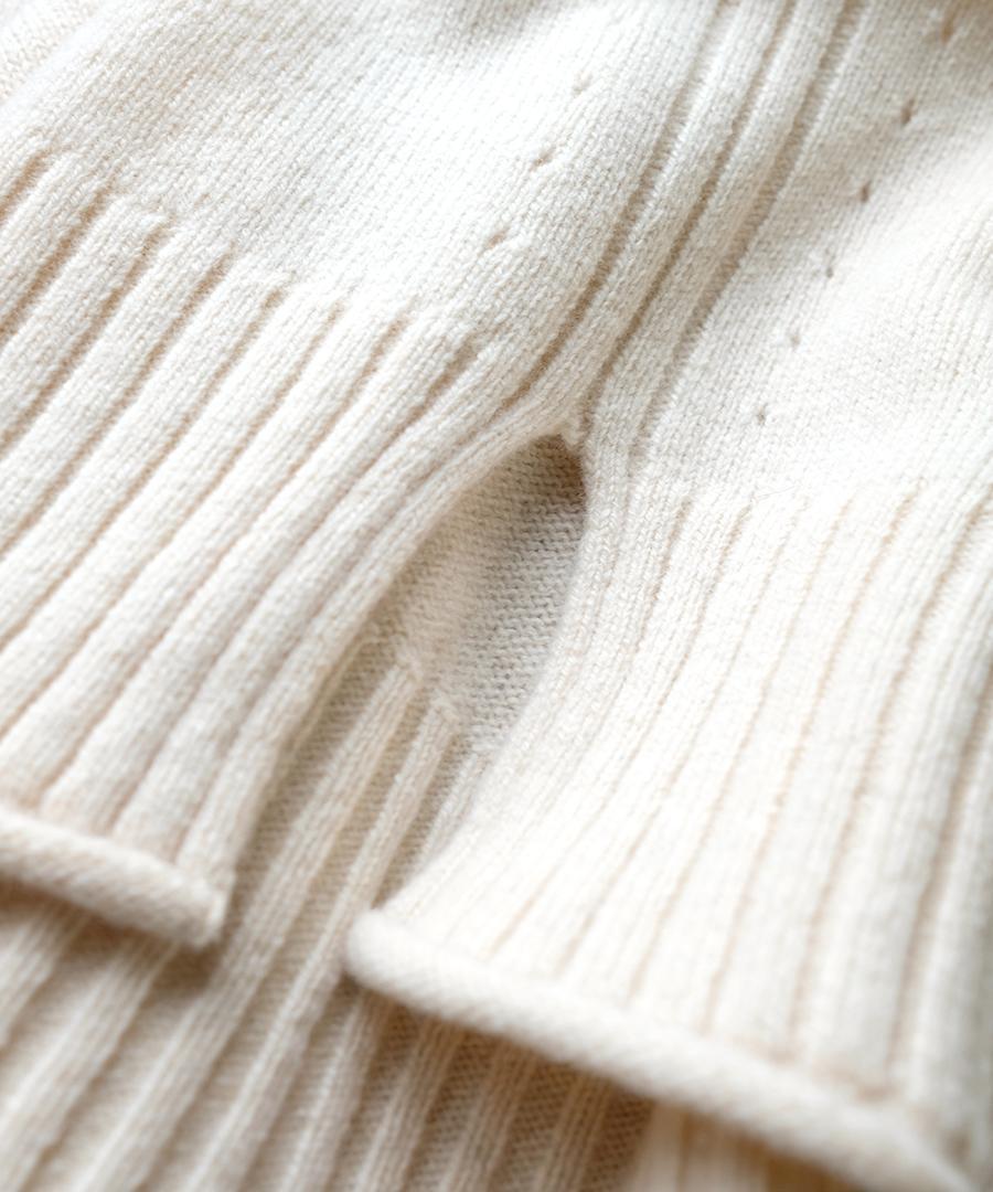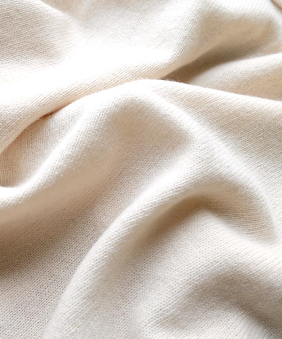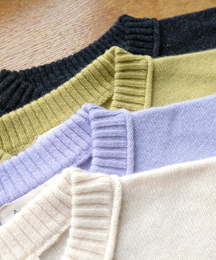 ふわふわで柔らかいウール100%の毛糸をミドルゲージで編み立て、重ね着にも使いやすい肉感にしています。