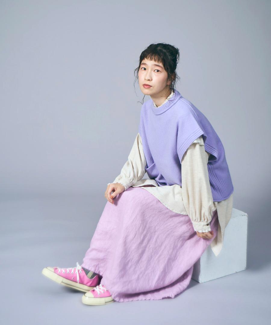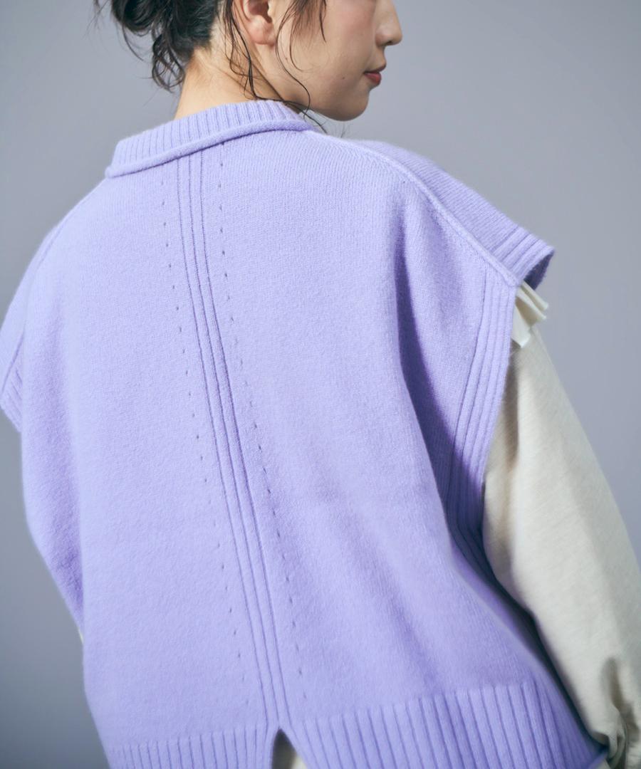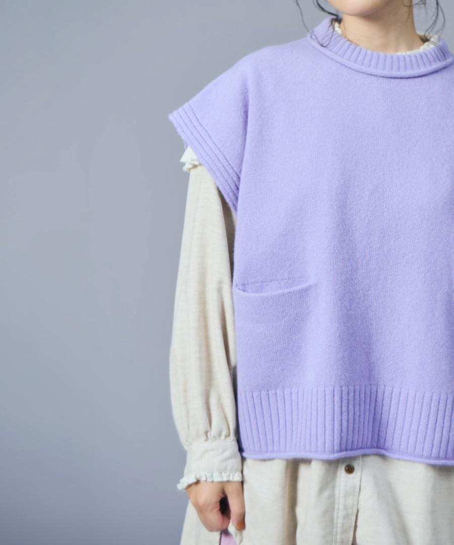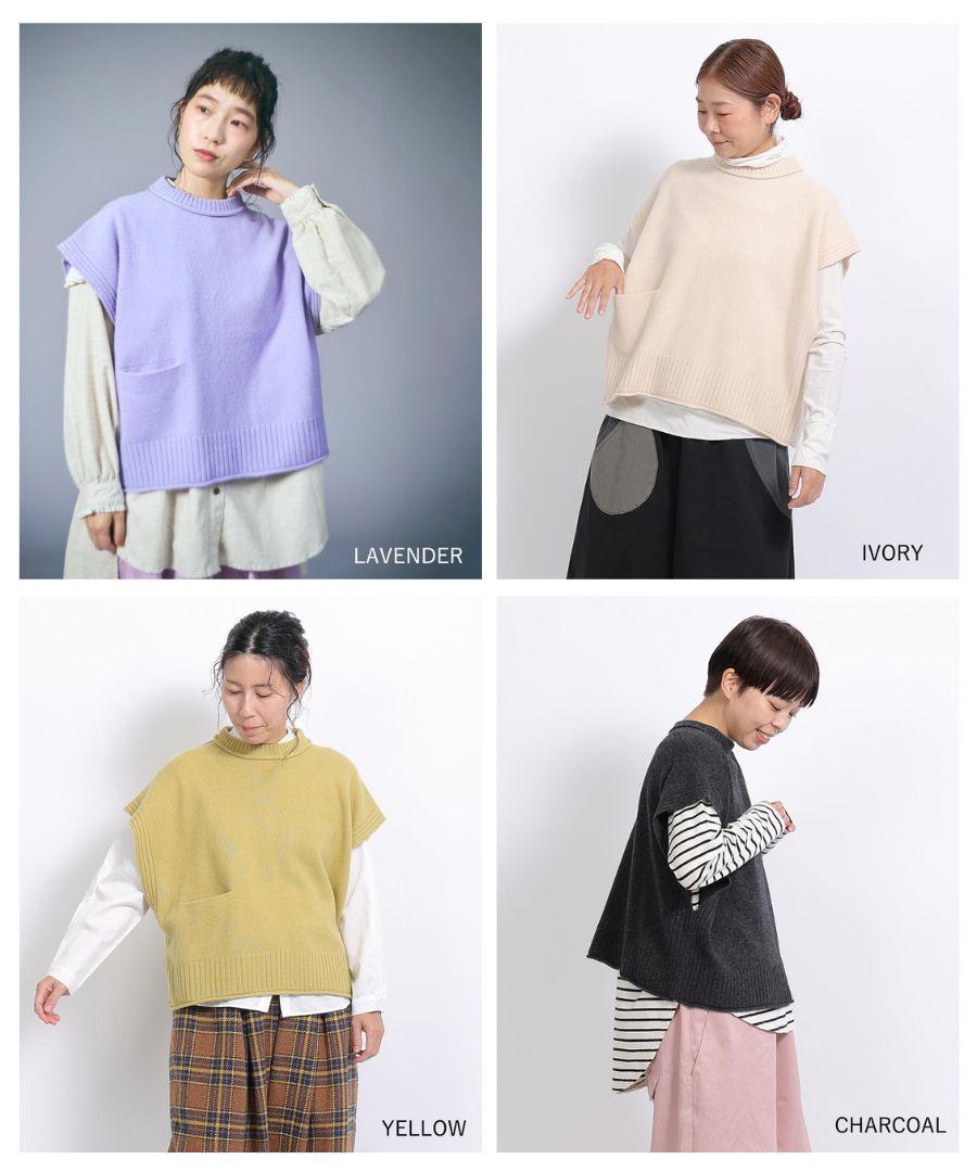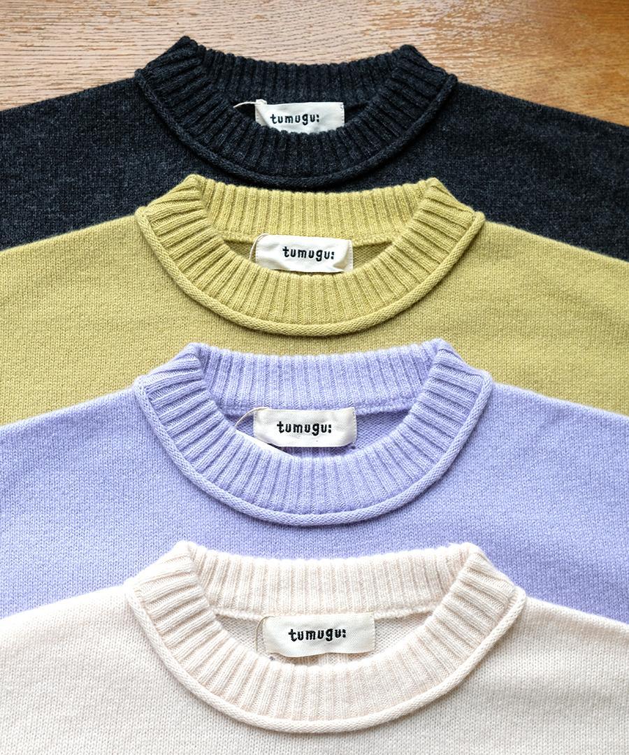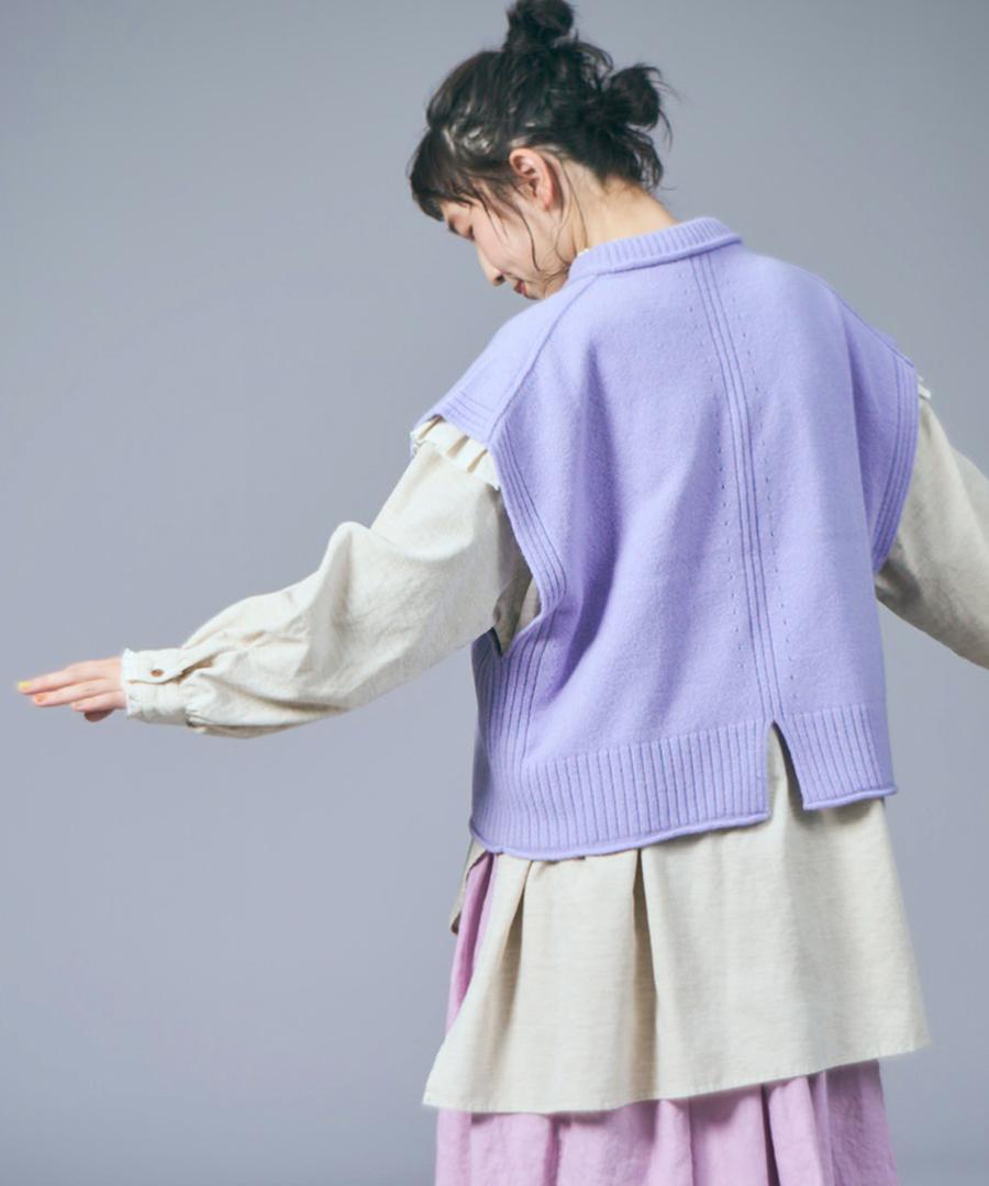 ふわふわで柔らかいウール100%の毛糸をミドルゲージで編み立て、重ね着にも使いやすい肉感にしています。