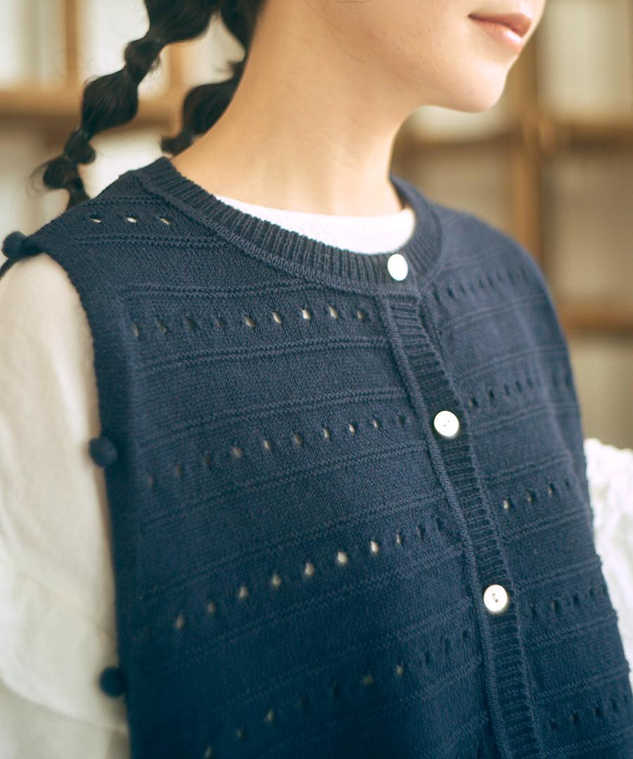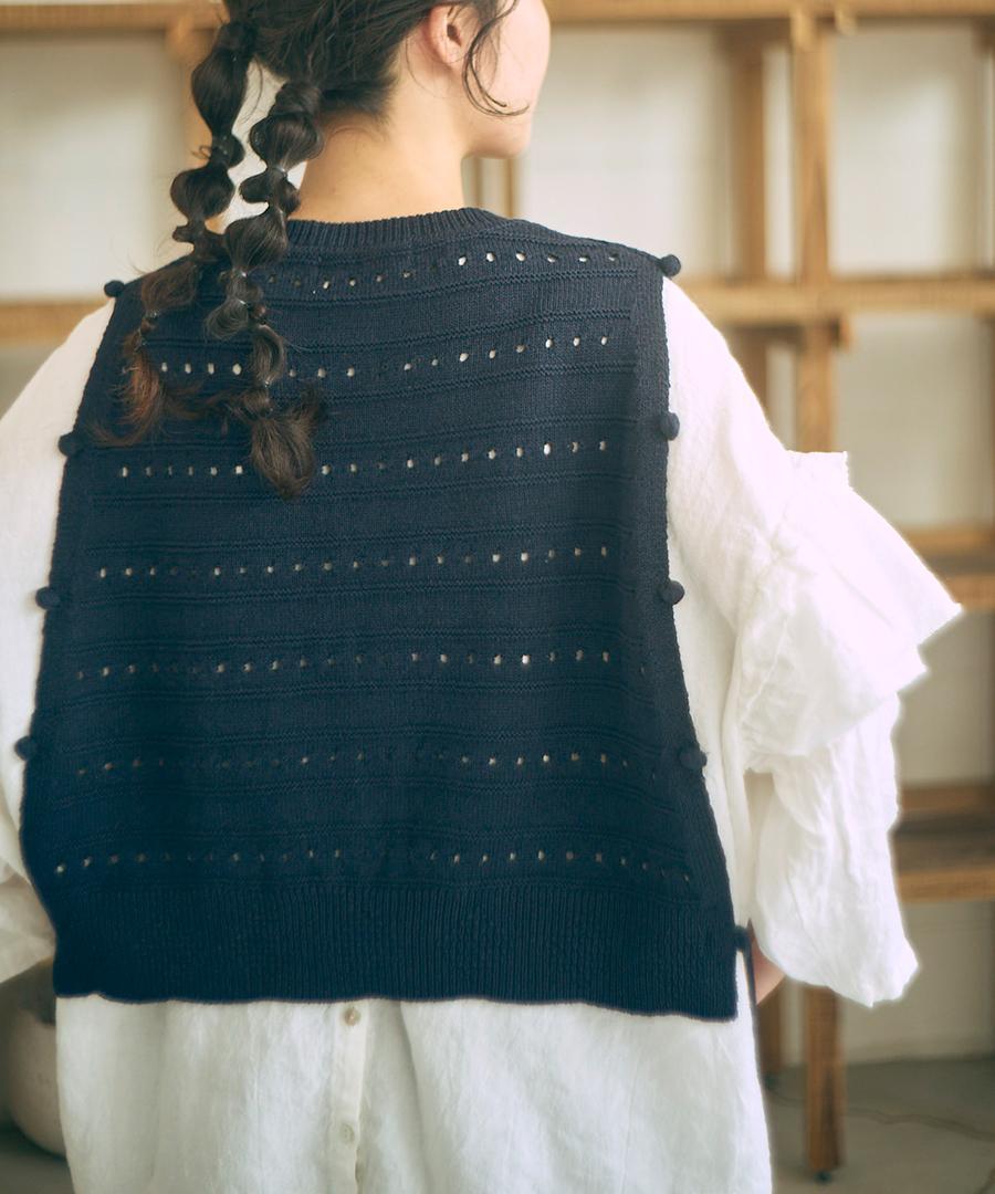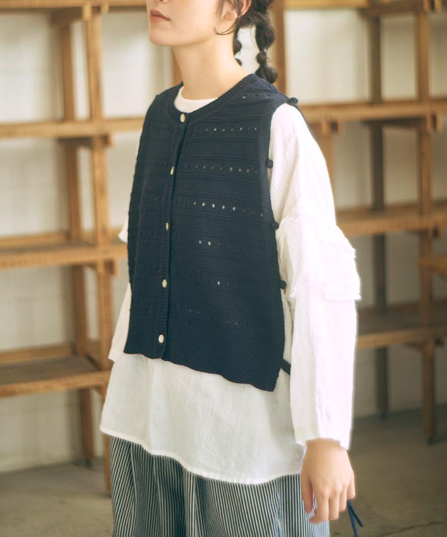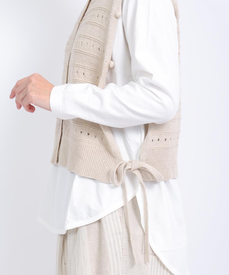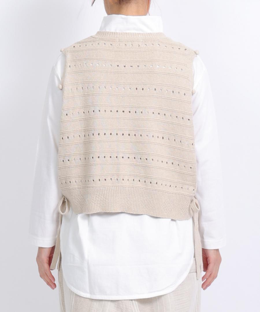 柔らかく優しい肌触りのリリヤーン糸を使用して編み上げた、軽やかで心地よいニット素材のベスト。