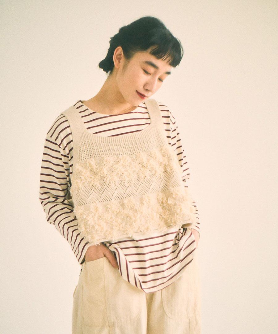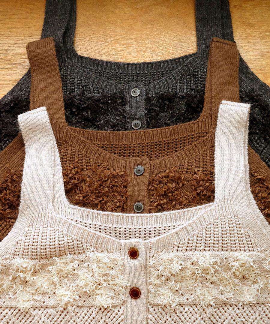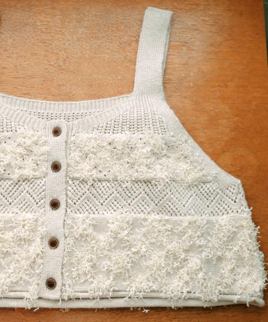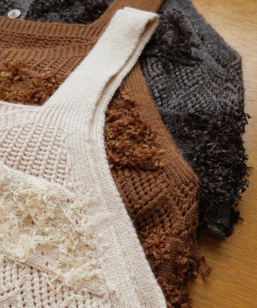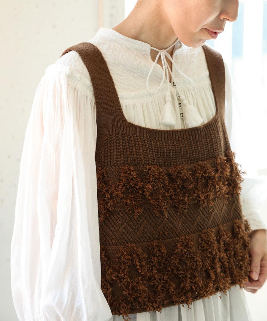 立体的なフリンジと、クラシカルな地模様の編み地を組み合わせた、表情豊かなニットビスチェ。