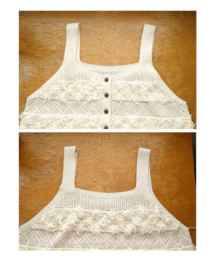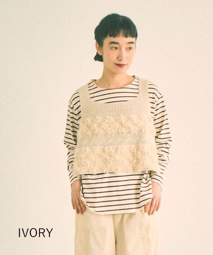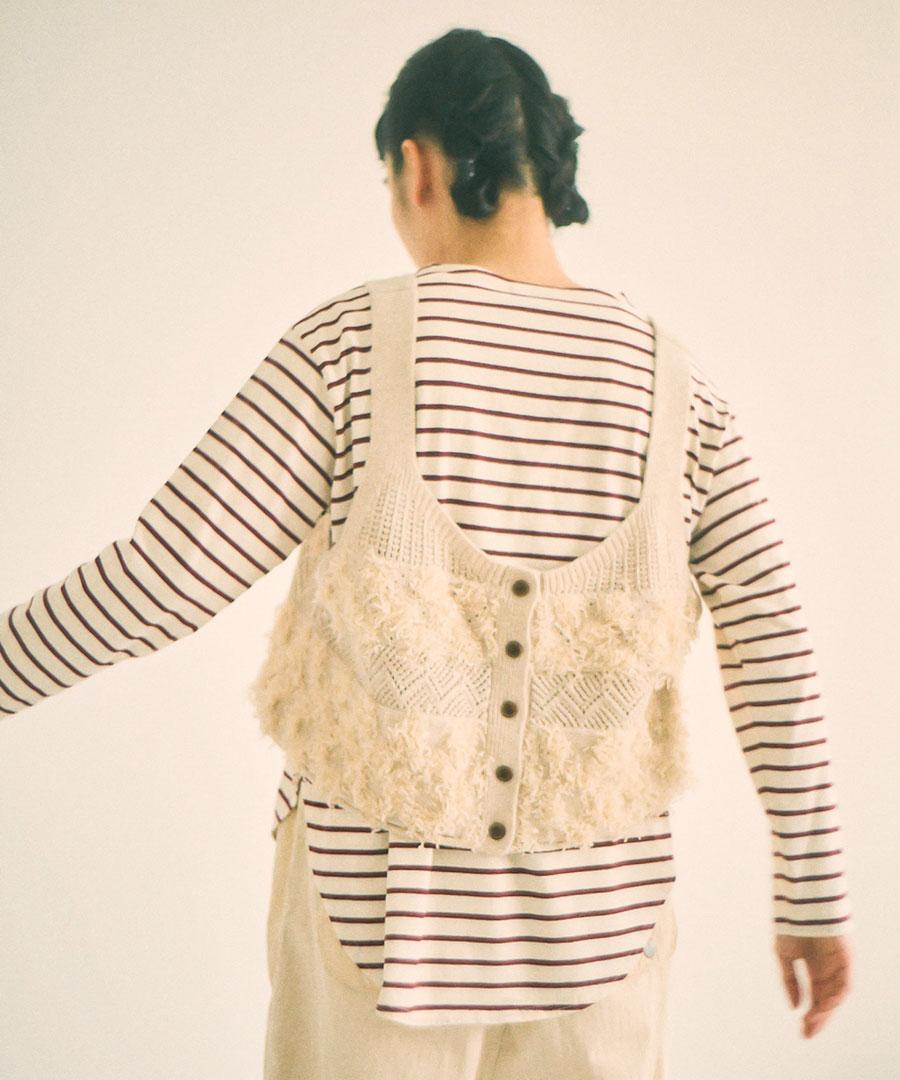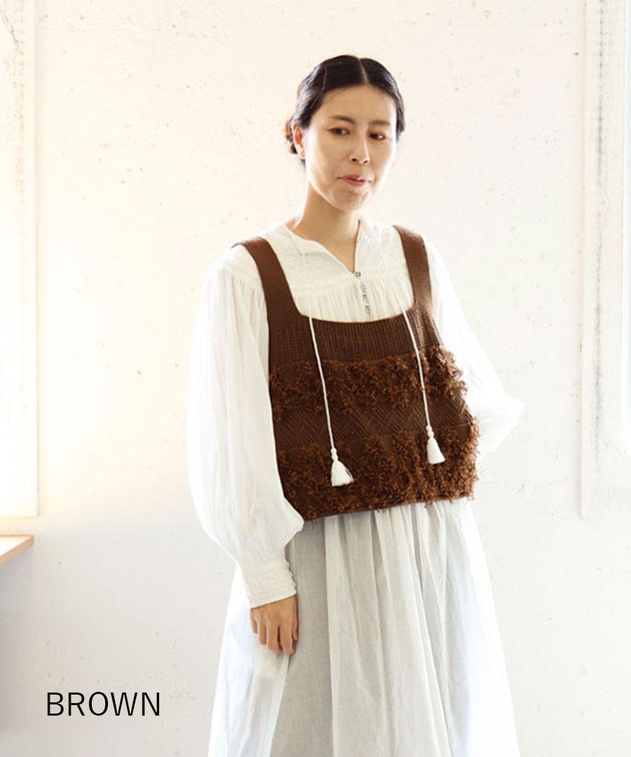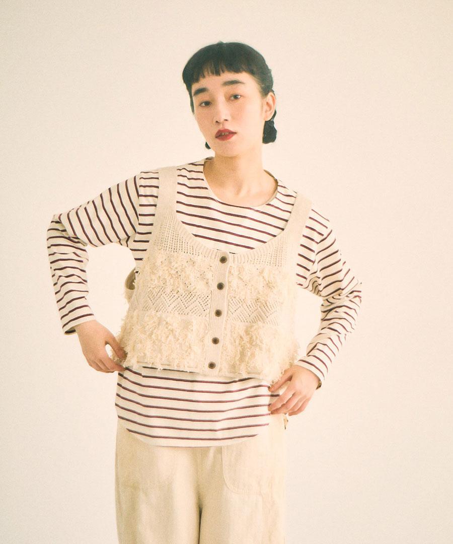 立体的なフリンジと、クラシカルな地模様の編み地を組み合わせた、表情豊かなニットビスチェ。