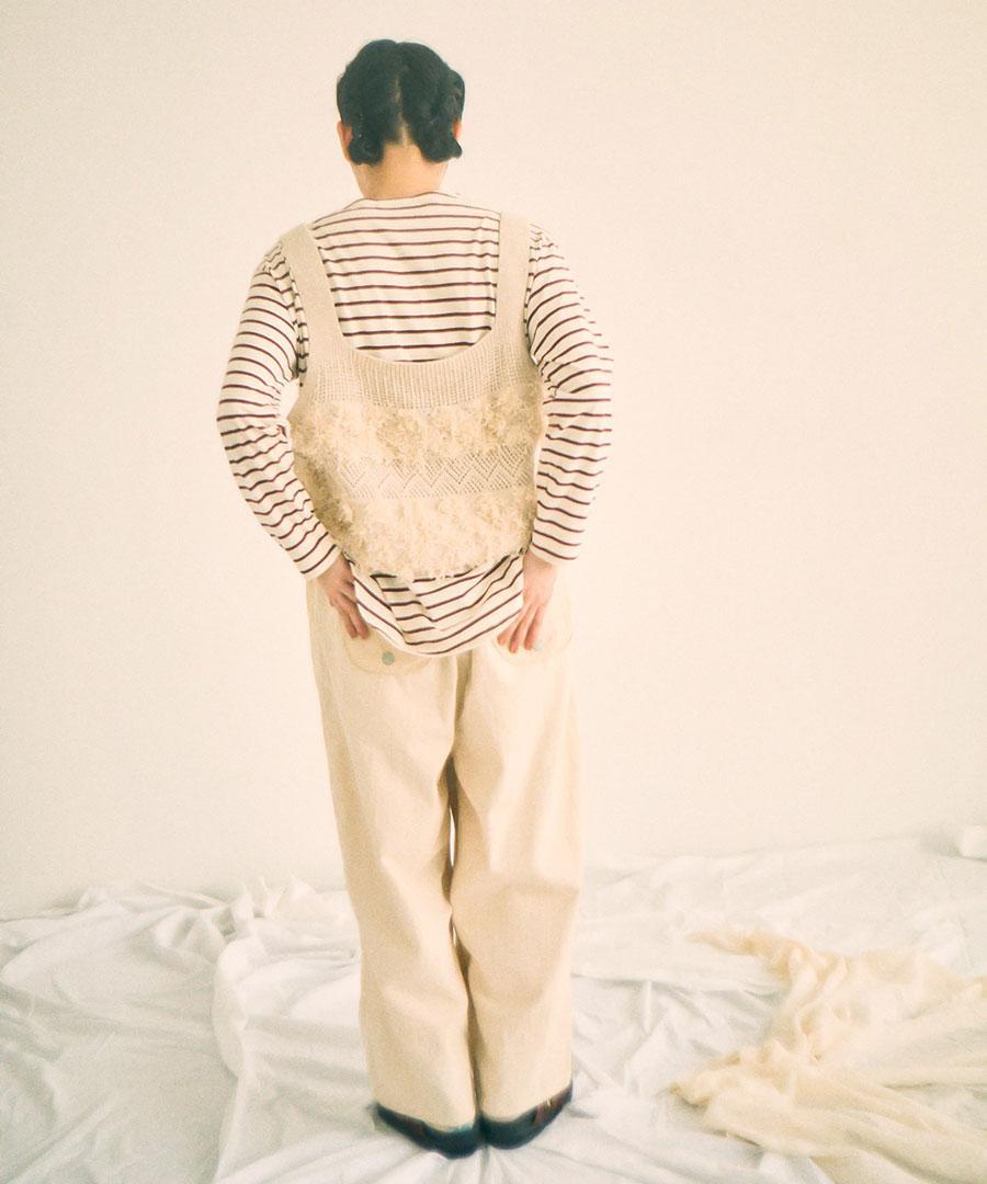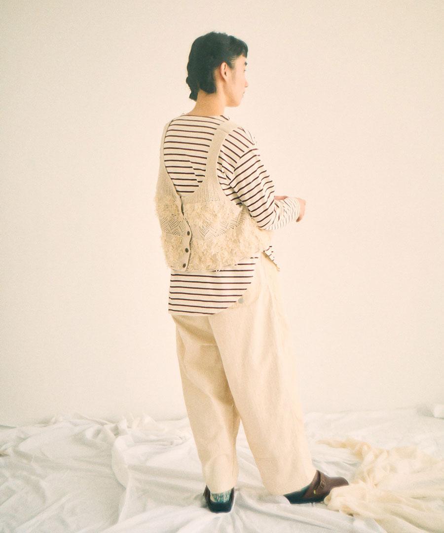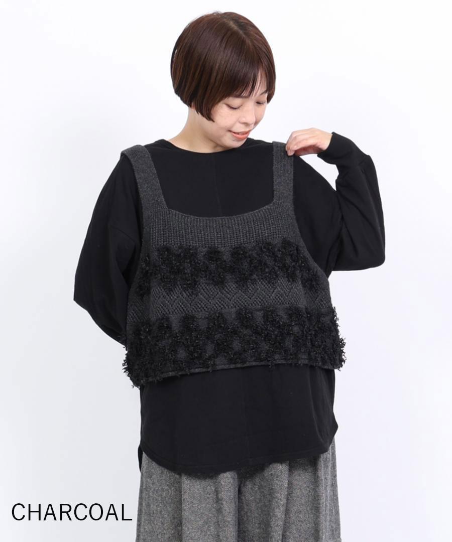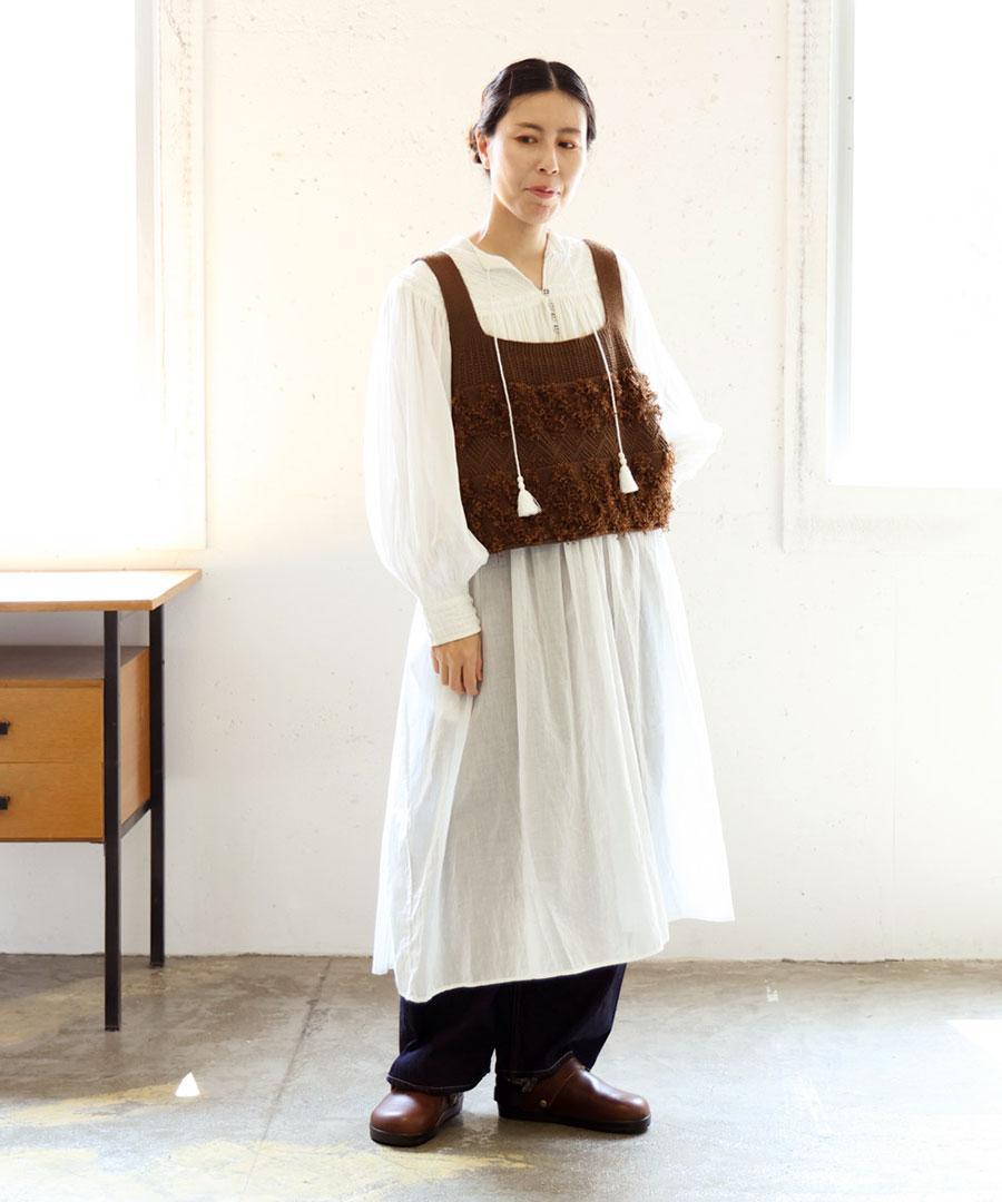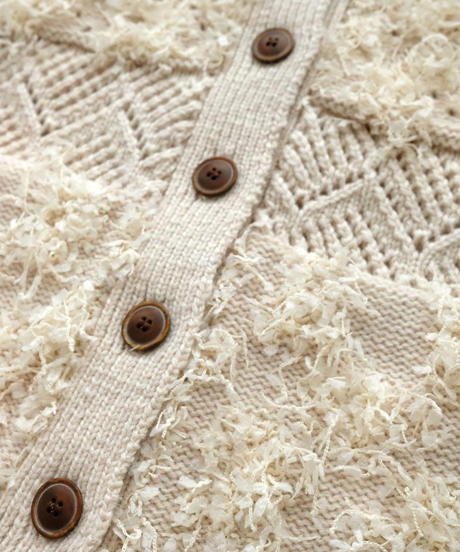 立体的なフリンジと、クラシカルな地模様の編み地を組み合わせた、表情豊かなニットビスチェ。