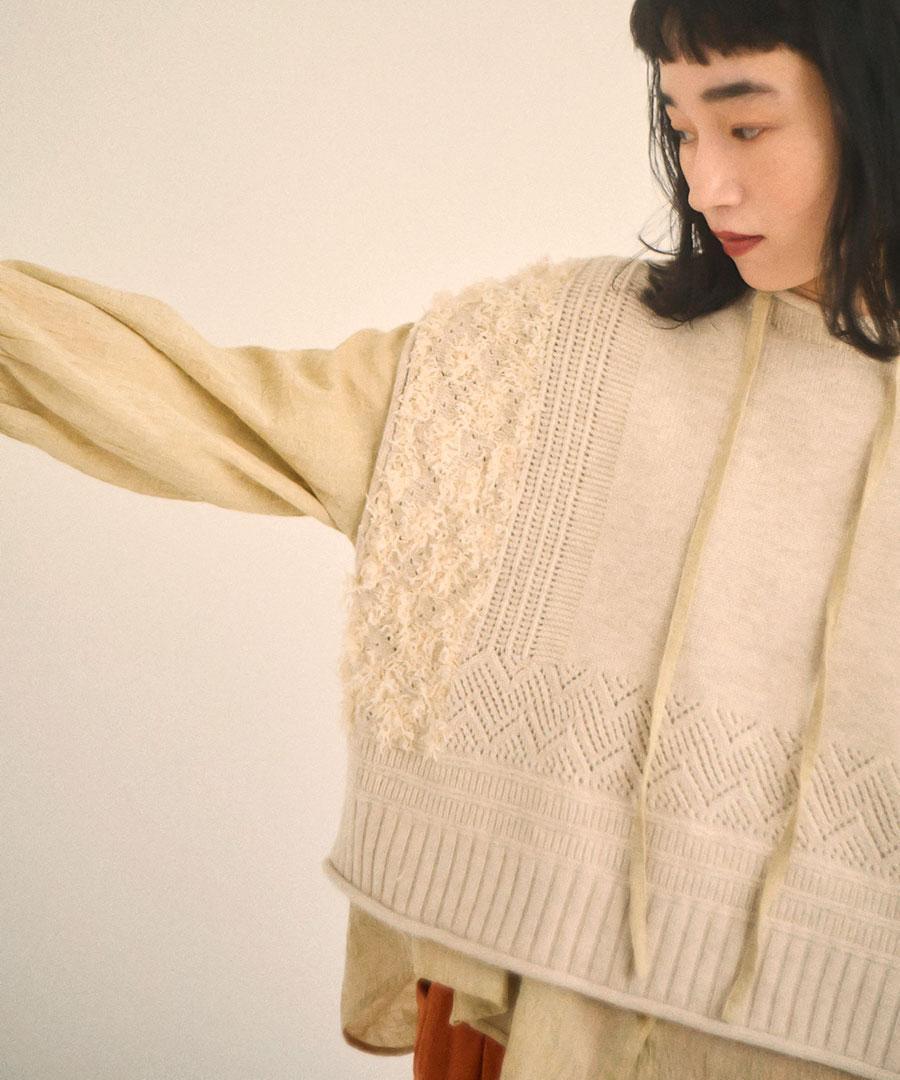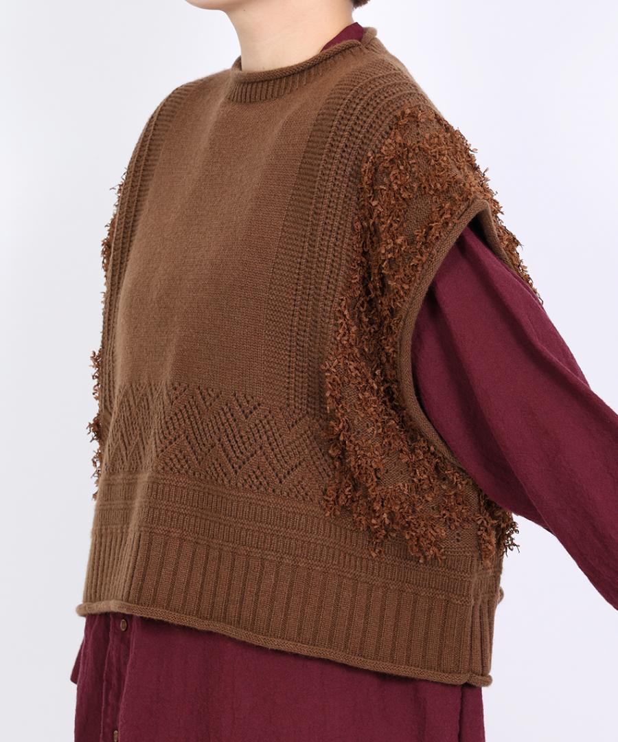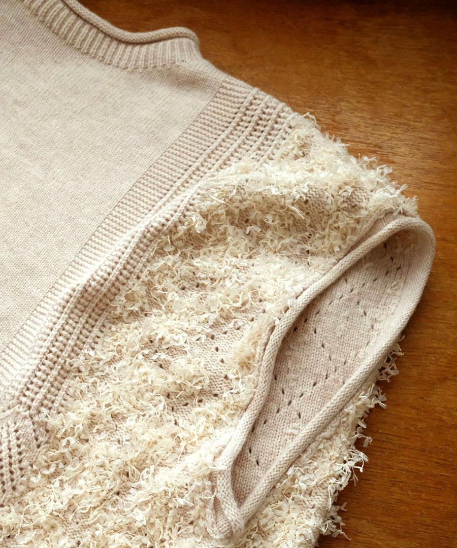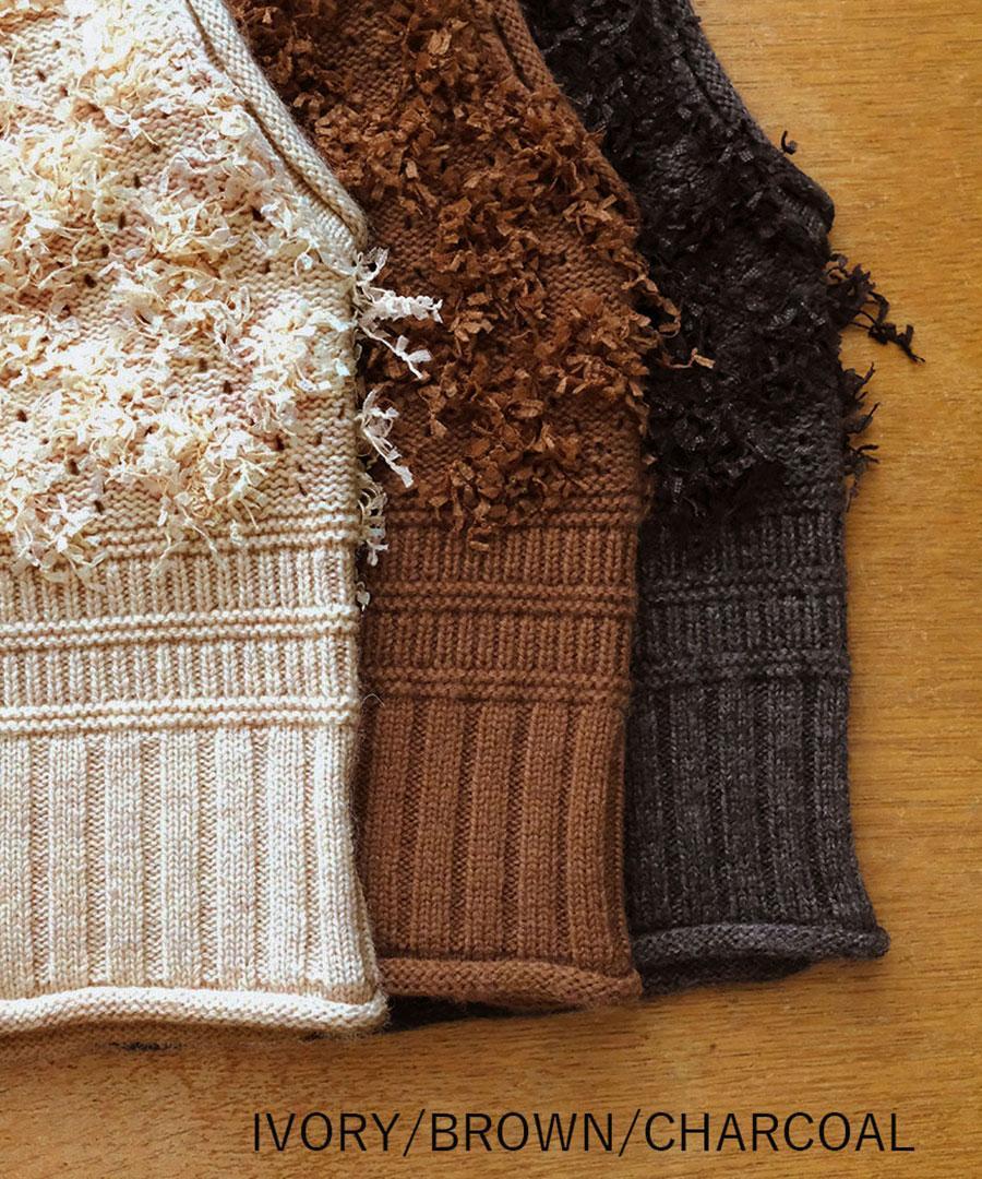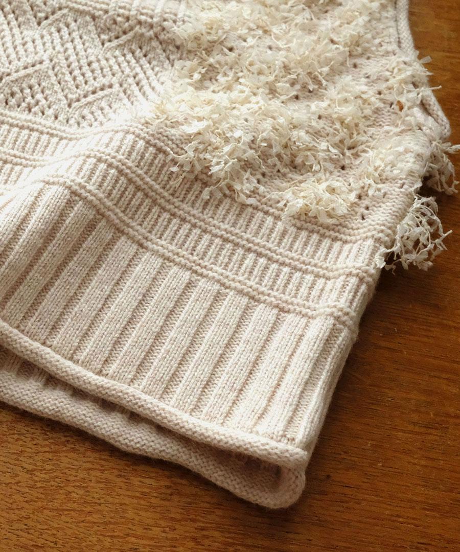 立体的なフリンジと、クラシカルな地模様の編み地を組み合わせた、表情豊かなデザインが特徴です。