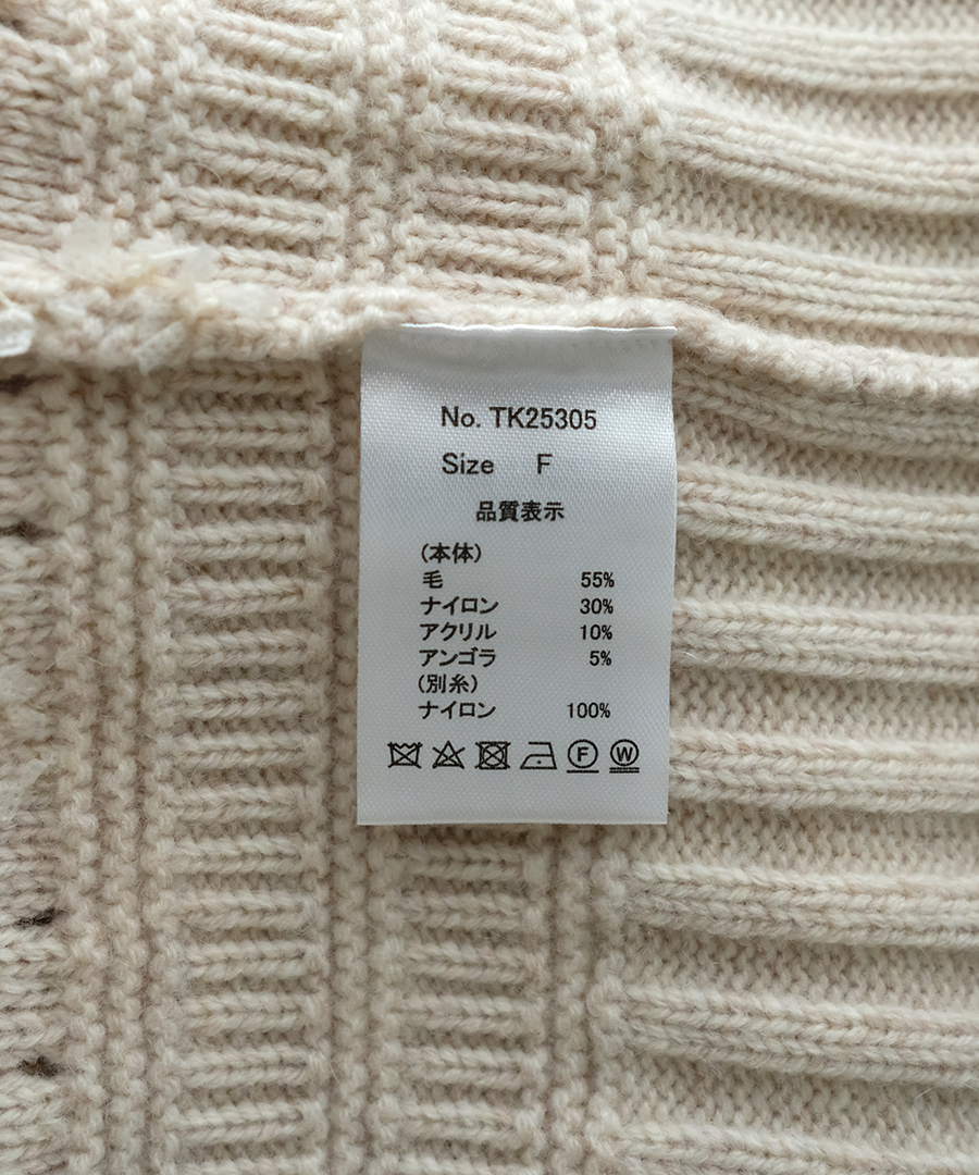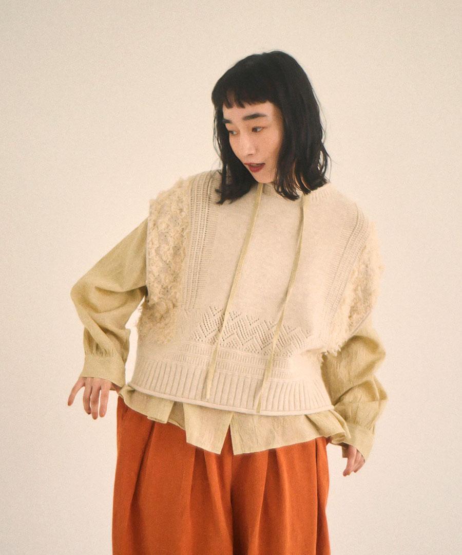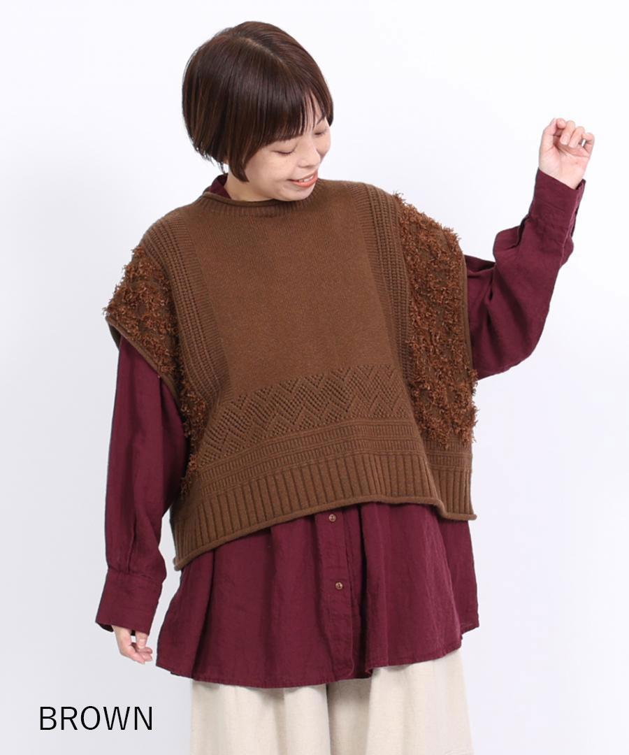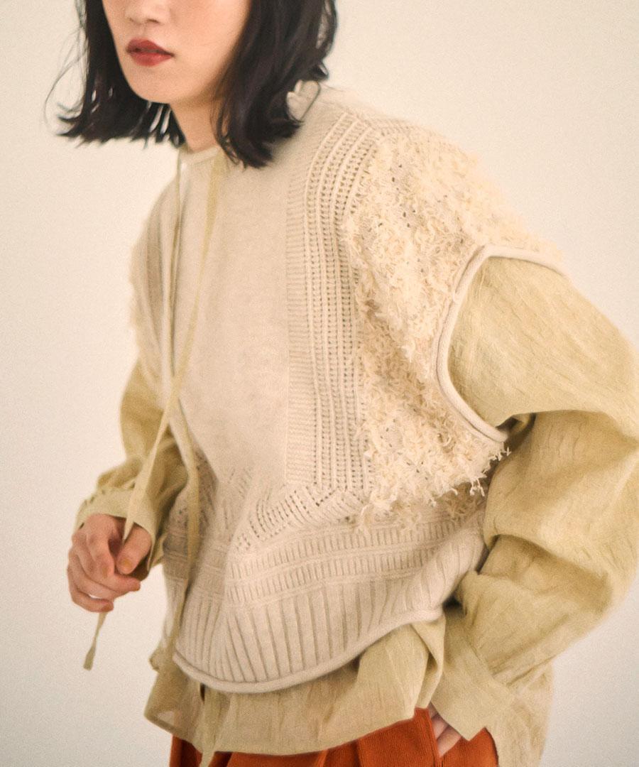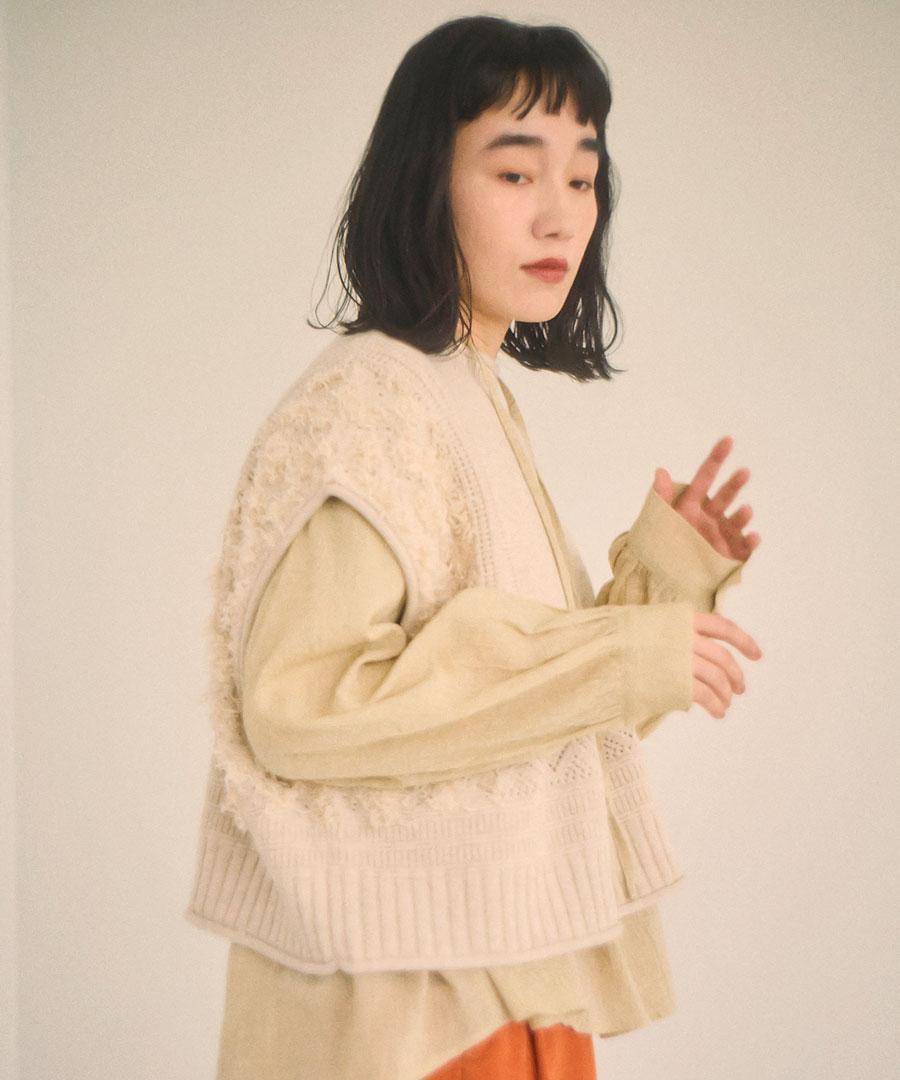 立体的なフリンジと、クラシカルな地模様の編み地を組み合わせた、表情豊かなデザインが特徴です。