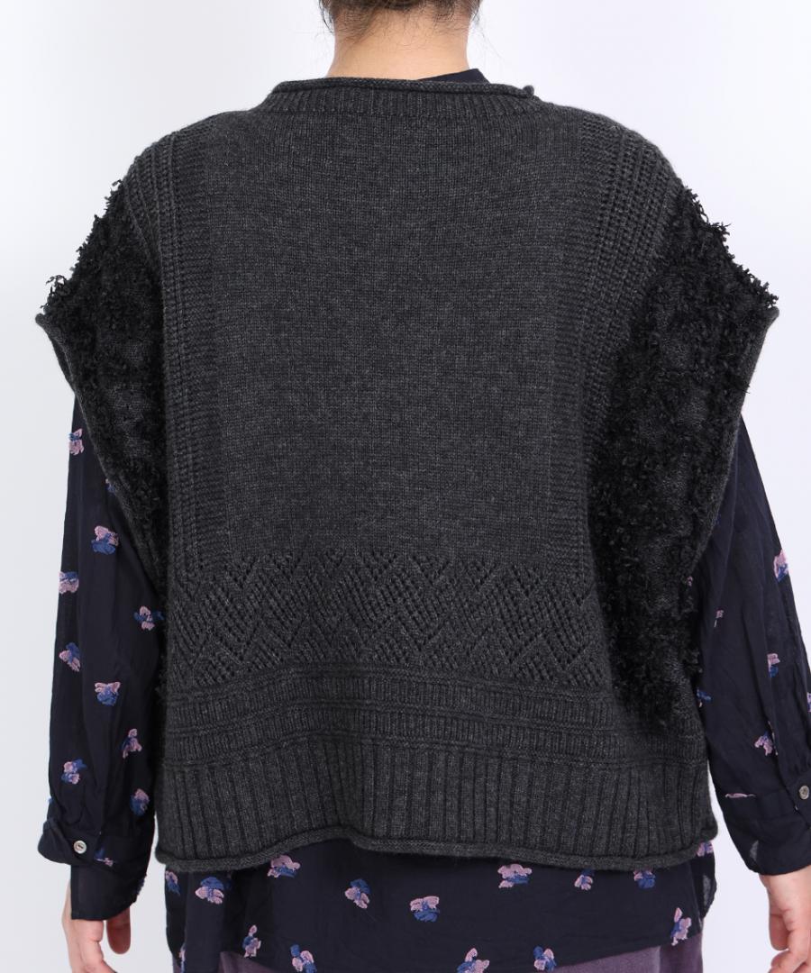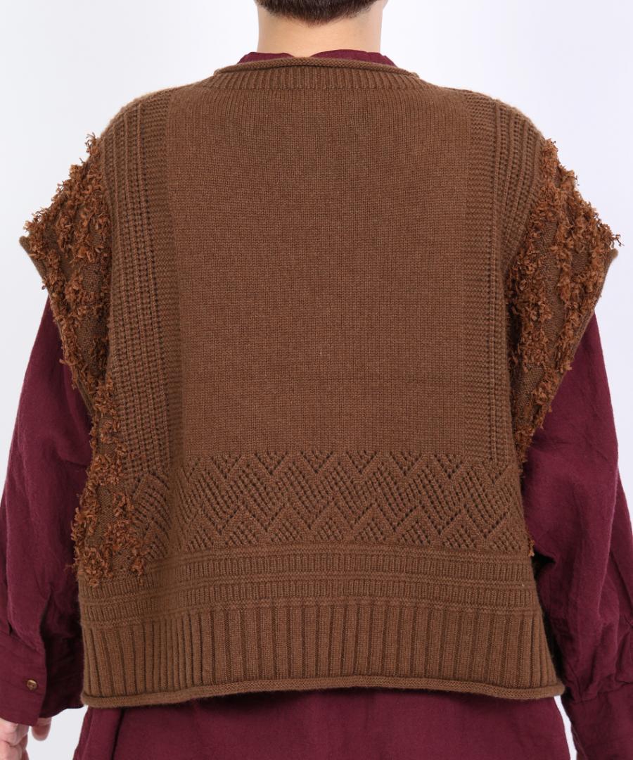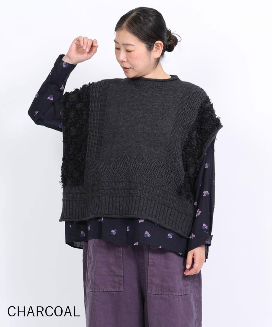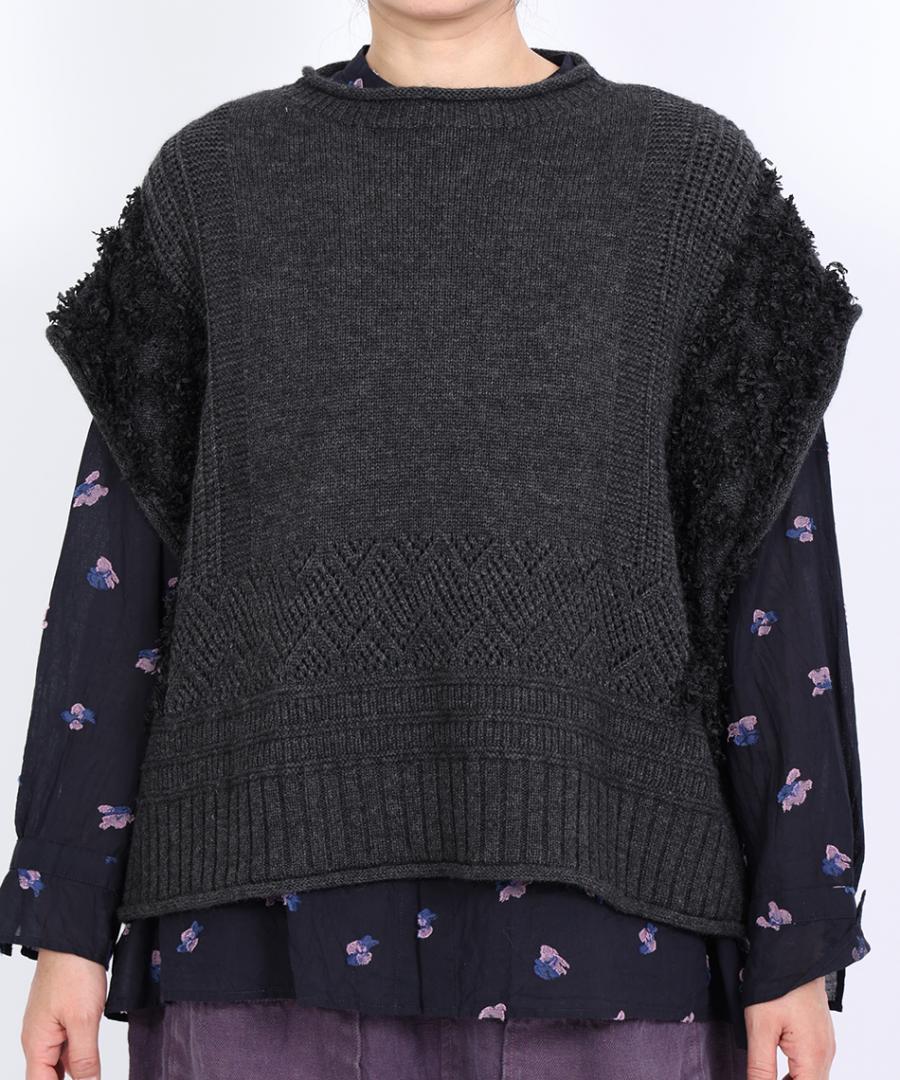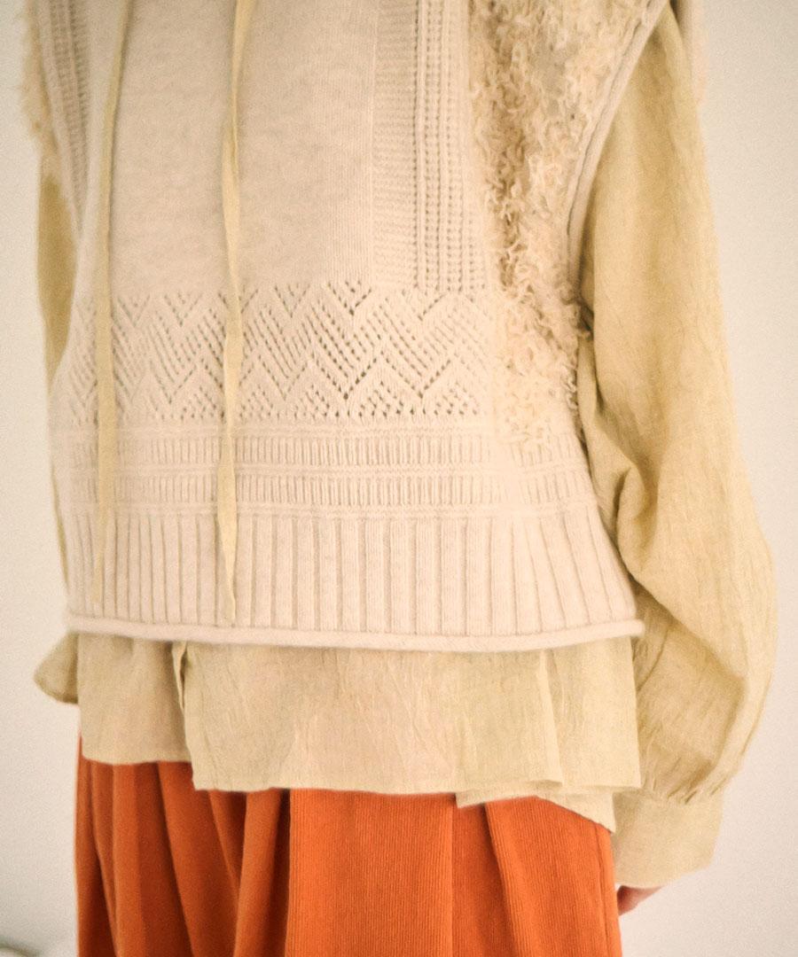 立体的なフリンジと、クラシカルな地模様の編み地を組み合わせた、表情豊かなデザインが特徴です。
