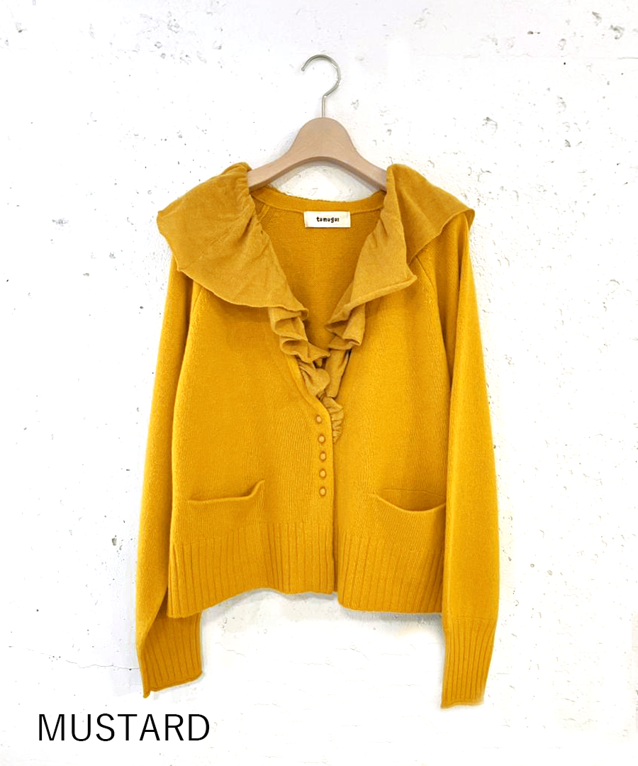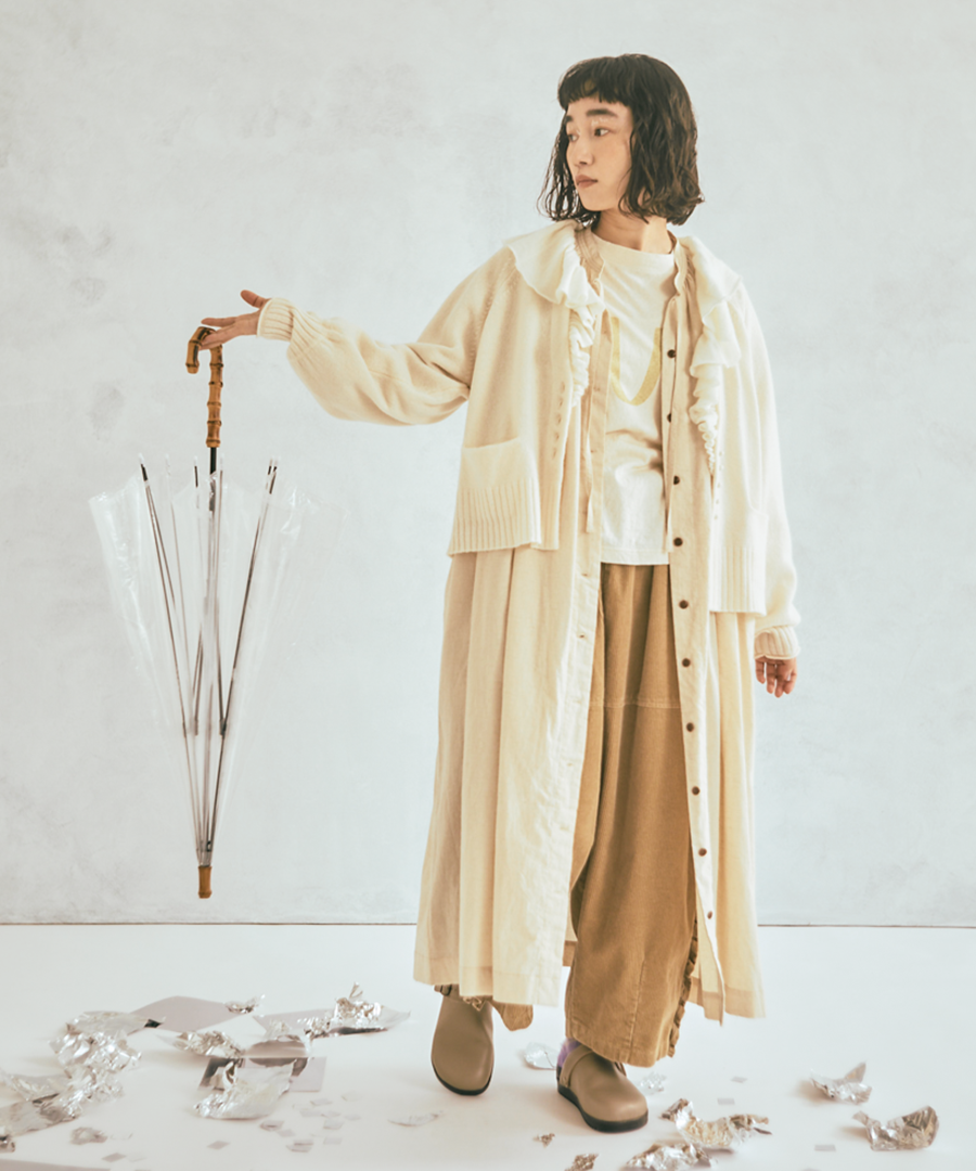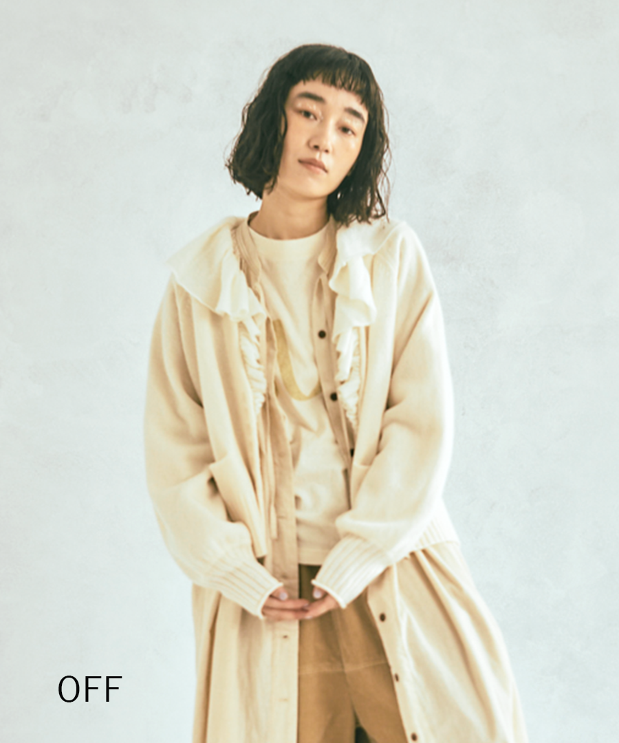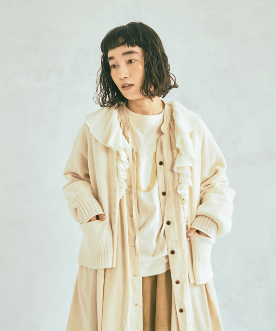 首元からフロントにかけてあしらわれた大胆で華やかなフリルカラーが、顔周りを明るく、フェミニンな印象に演出。小さなくるみボタンが縦に並び、デザインのさりげないアクセントに。