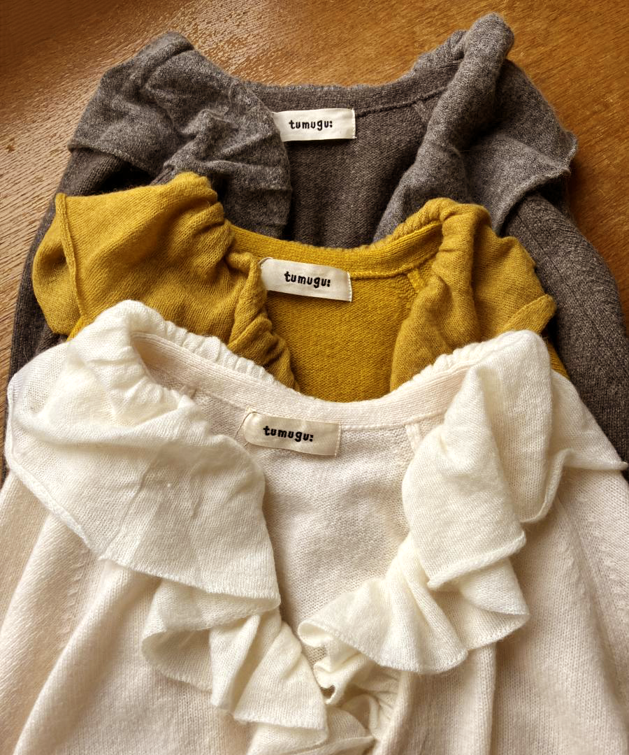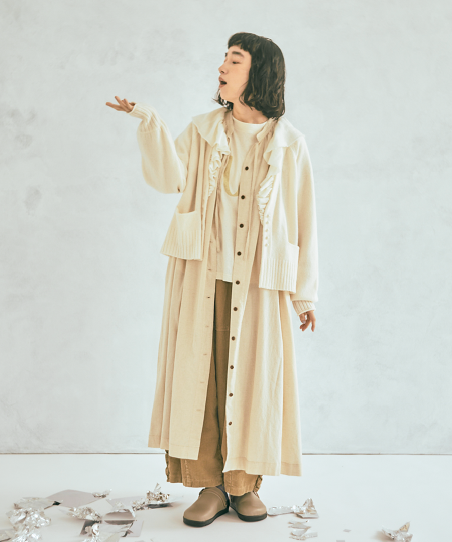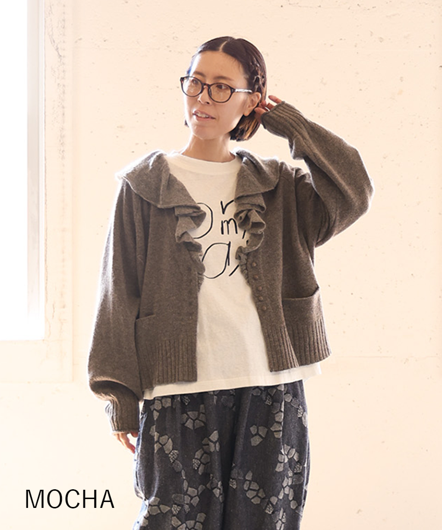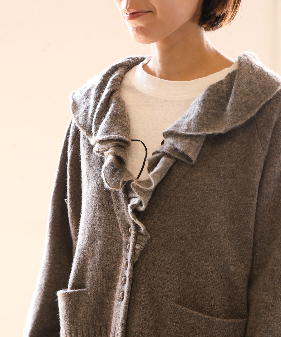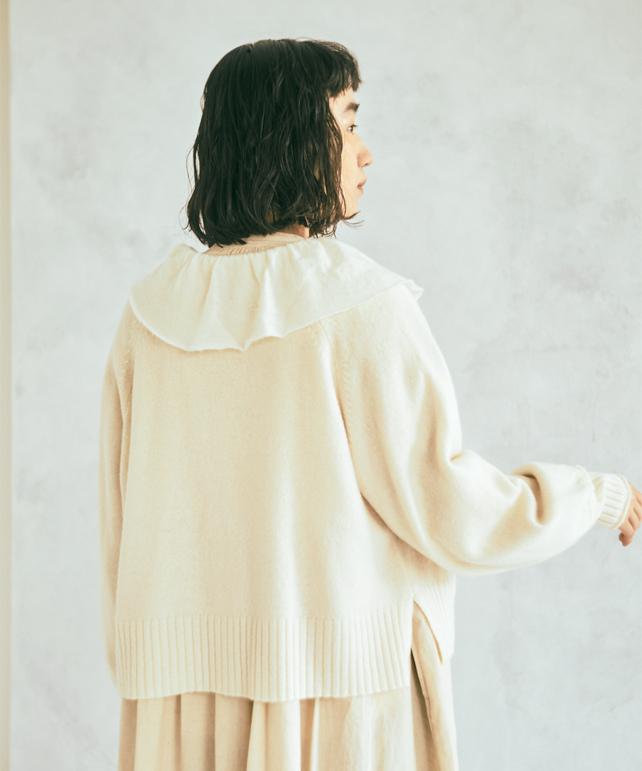 高品質なメリノウールを使用し、しっとりとした柔らかさと、アルパカ混のフリル部分はふんわりと空気を含んだ軽くて暖かな風合いです。