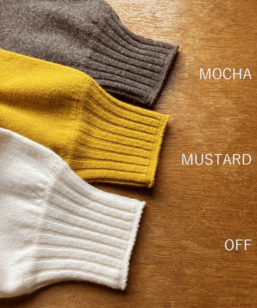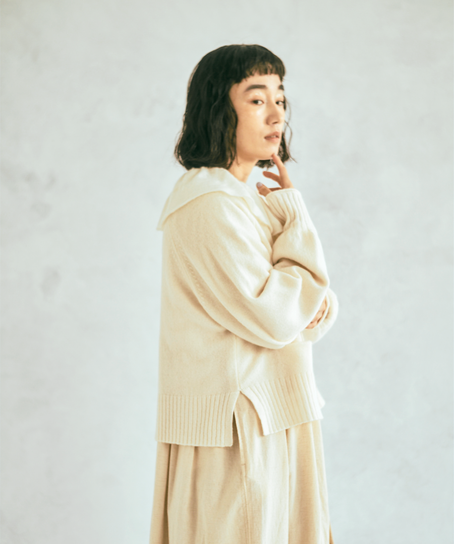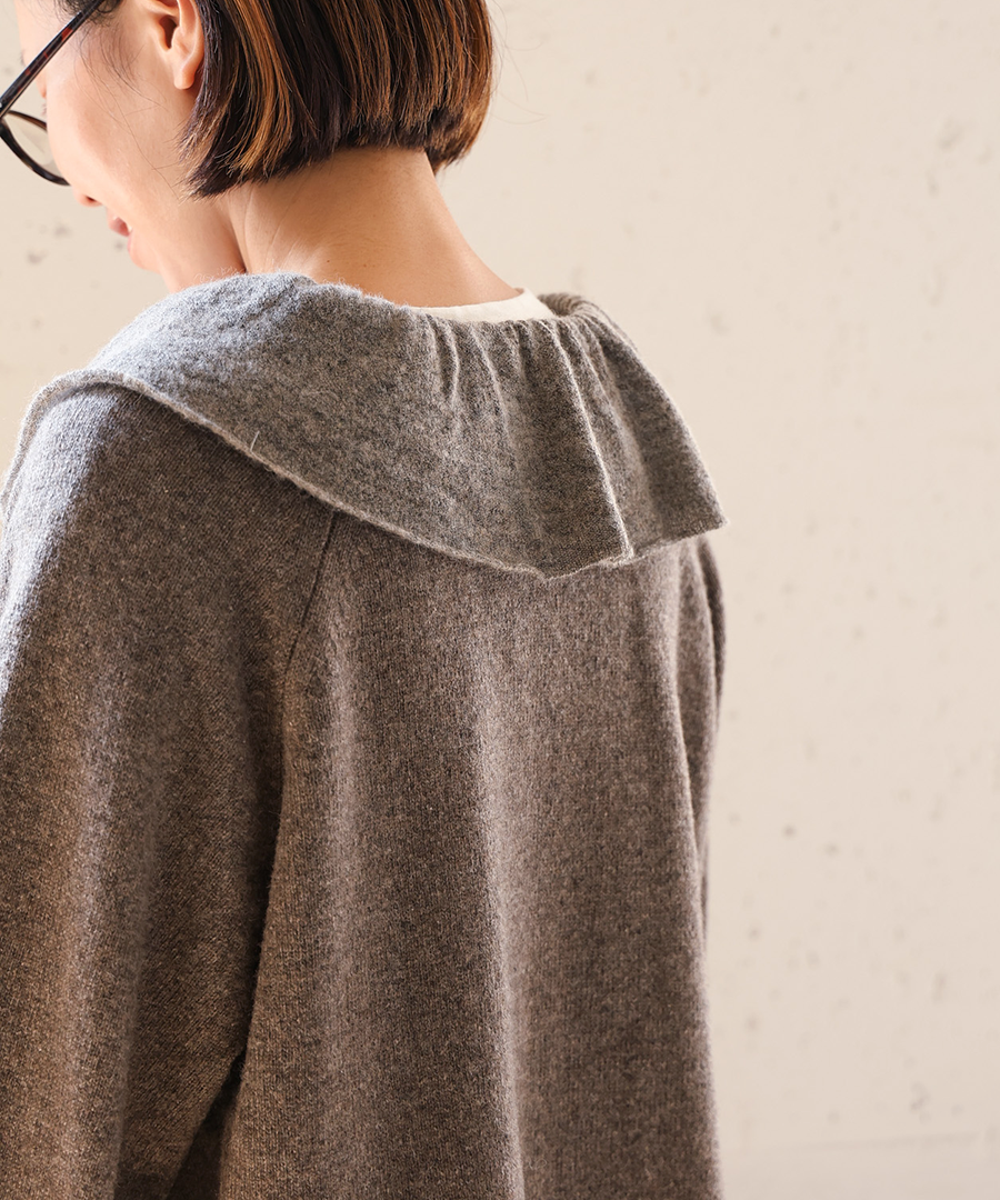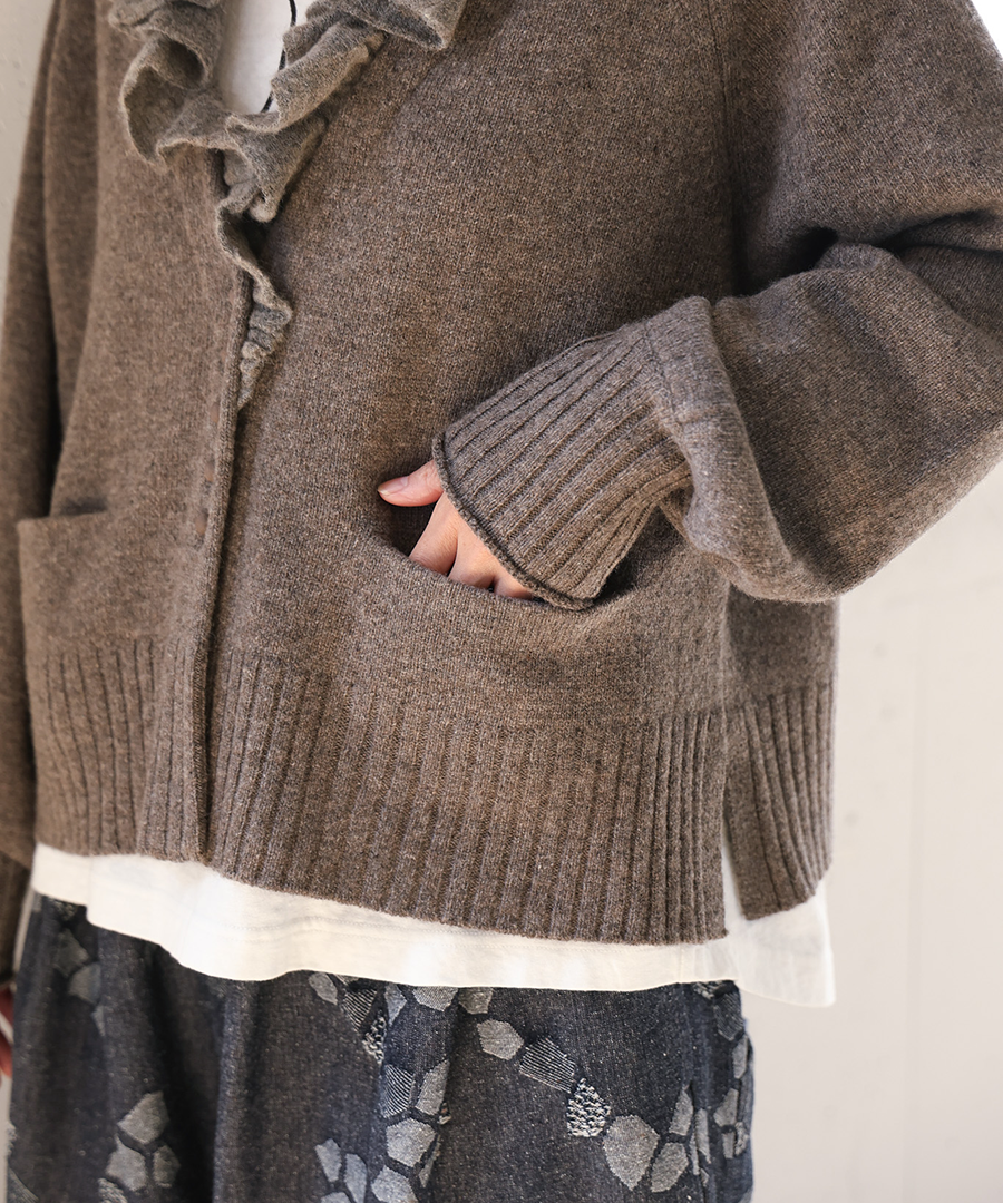 高品質なメリノウールを使用し、しっとりとした柔らかさと、アルパカ混のフリル部分はふんわりと空気を含んだ軽くて暖かな風合いです。