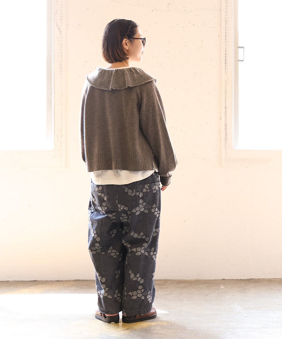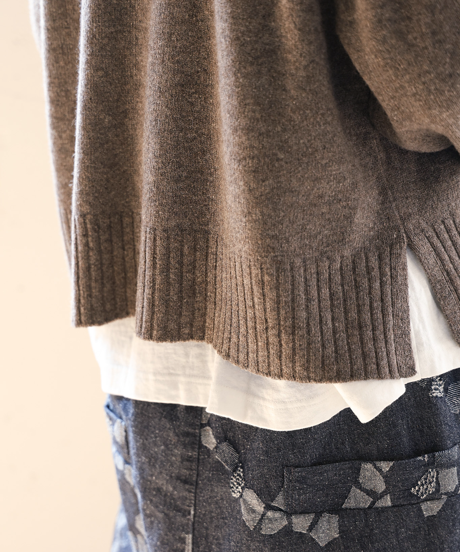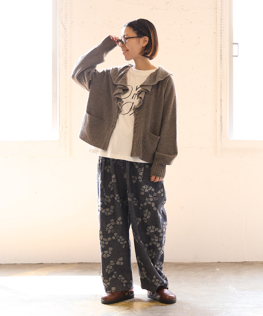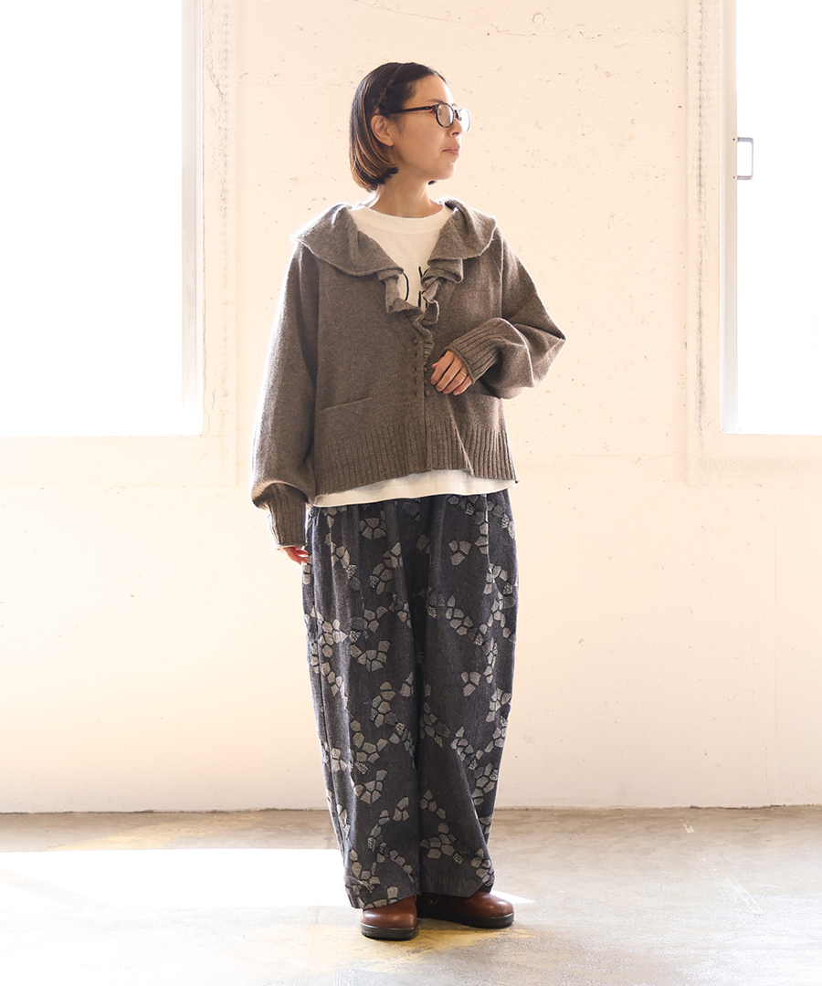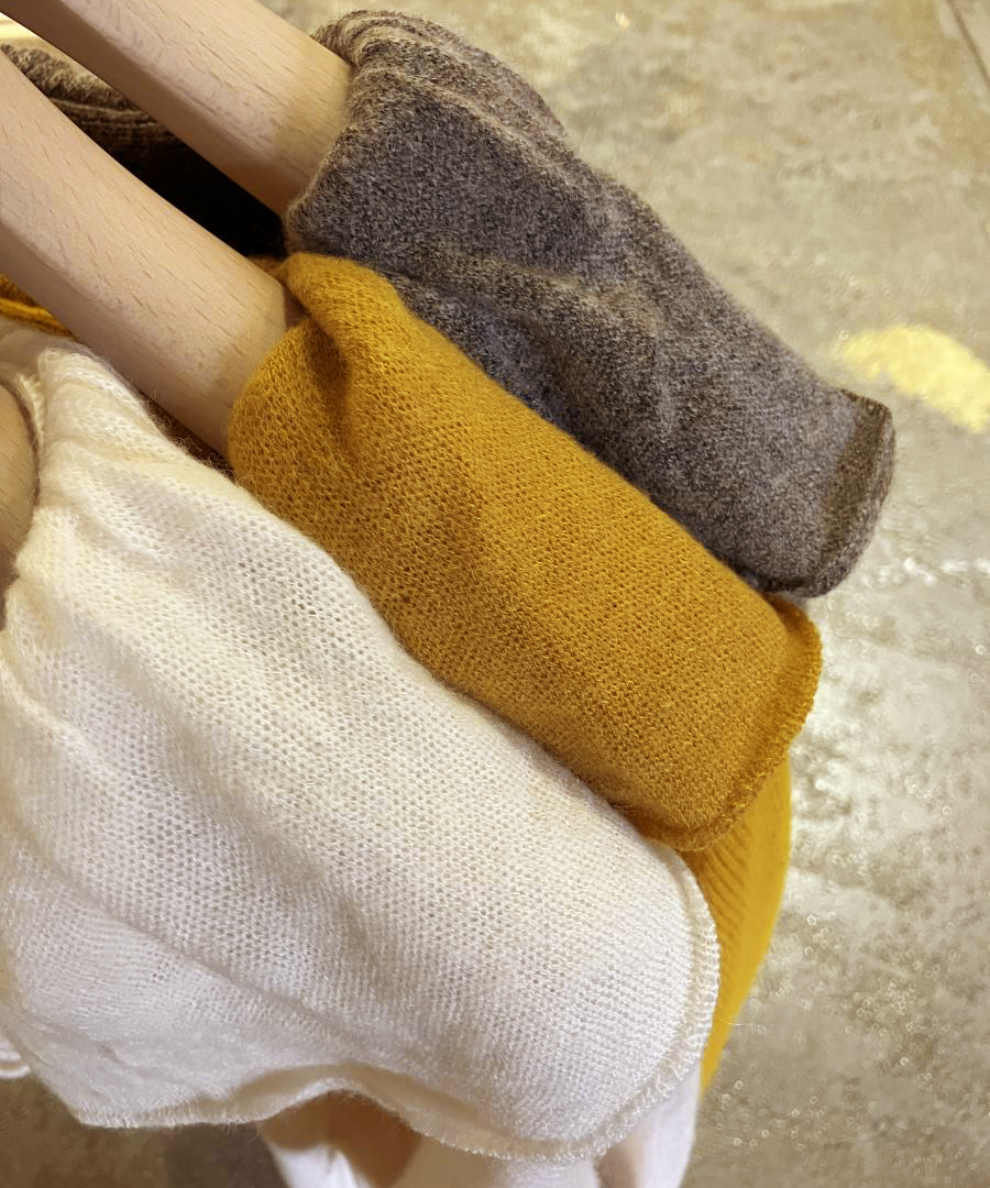 高品質なメリノウールを使用し、しっとりとした柔らかさと、アルパカ混のフリル部分はふんわりと空気を含んだ軽くて暖かな風合いです。
