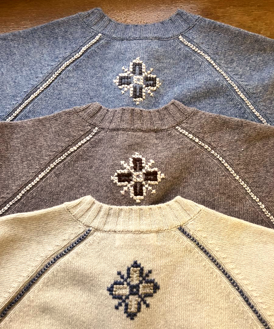 職人の手で一針ずつ、太番手の糸で立体的に仕上げたクロスモチーフ刺繍が温かみのあるデザインに仕上がりました。
