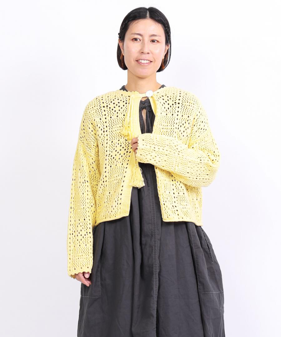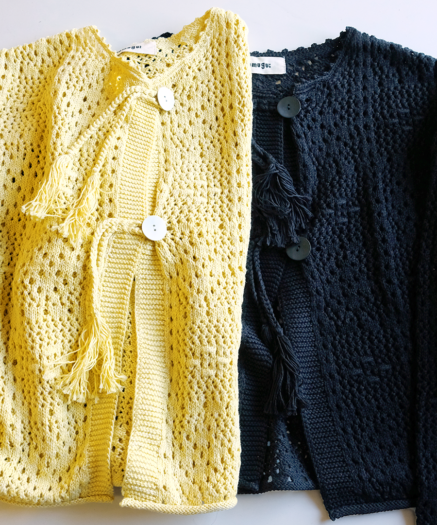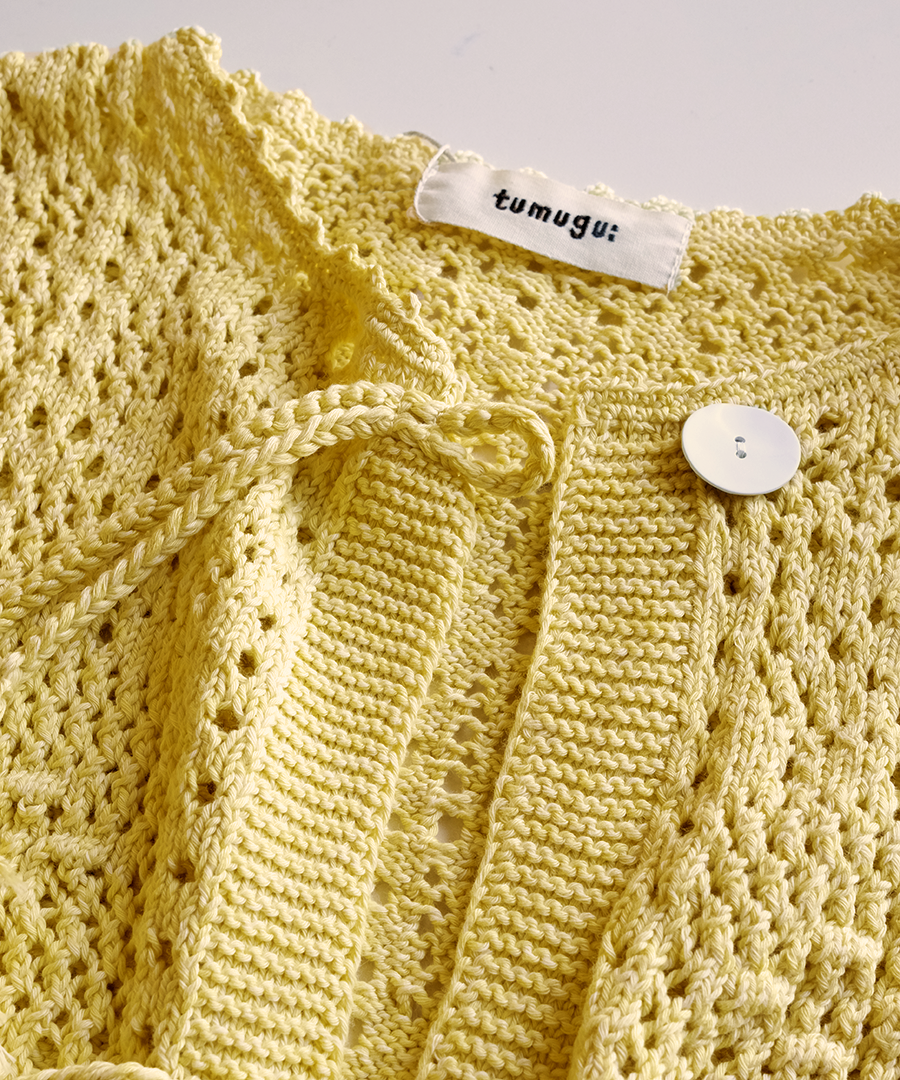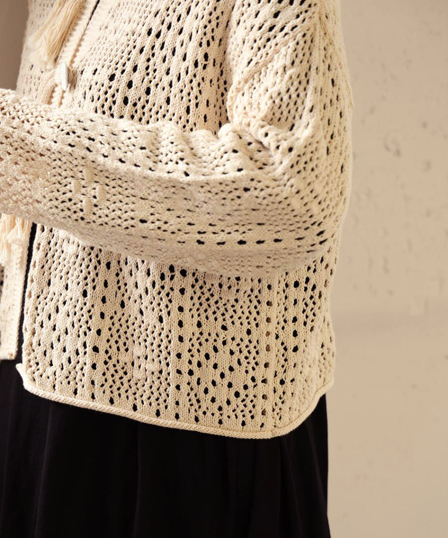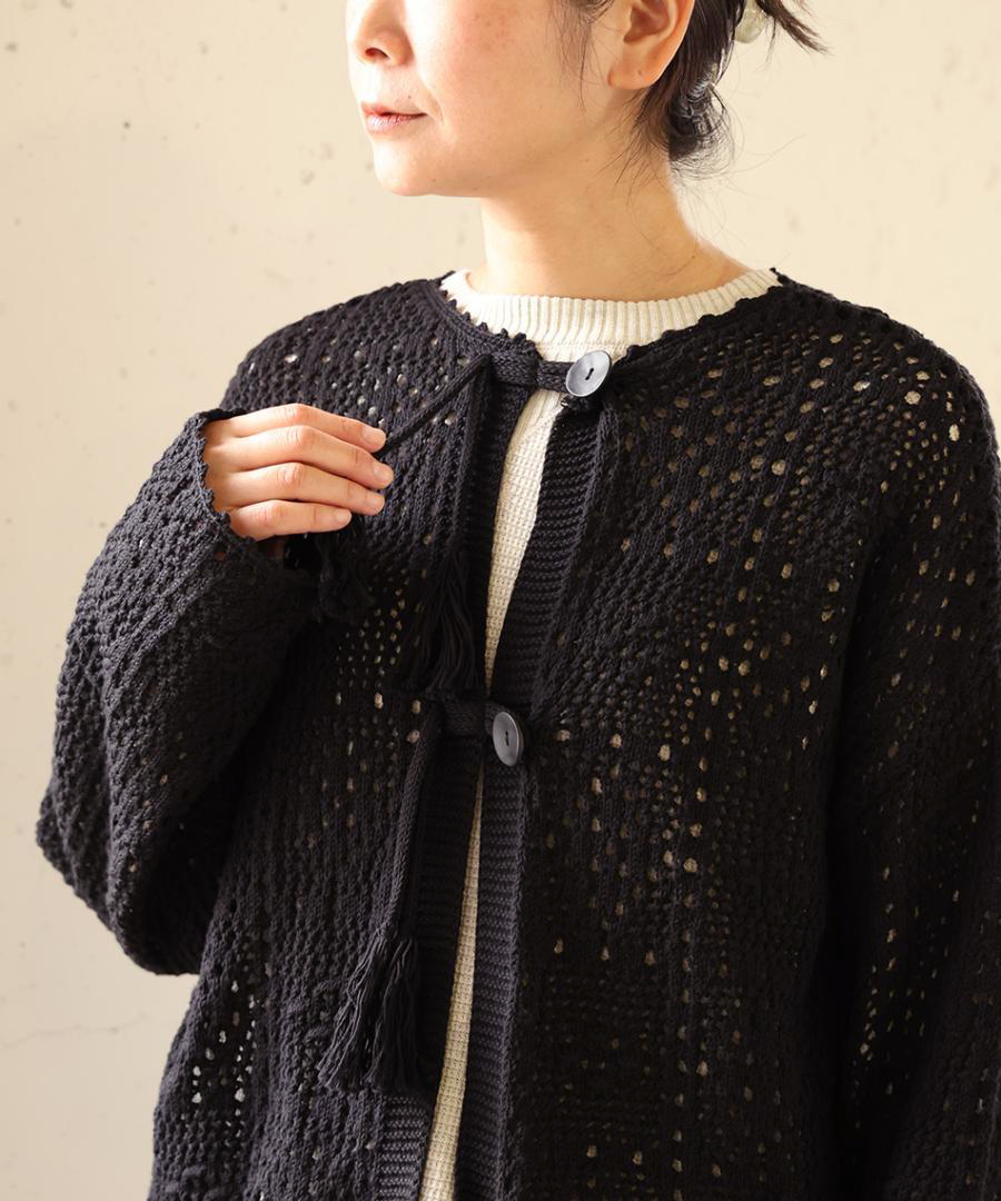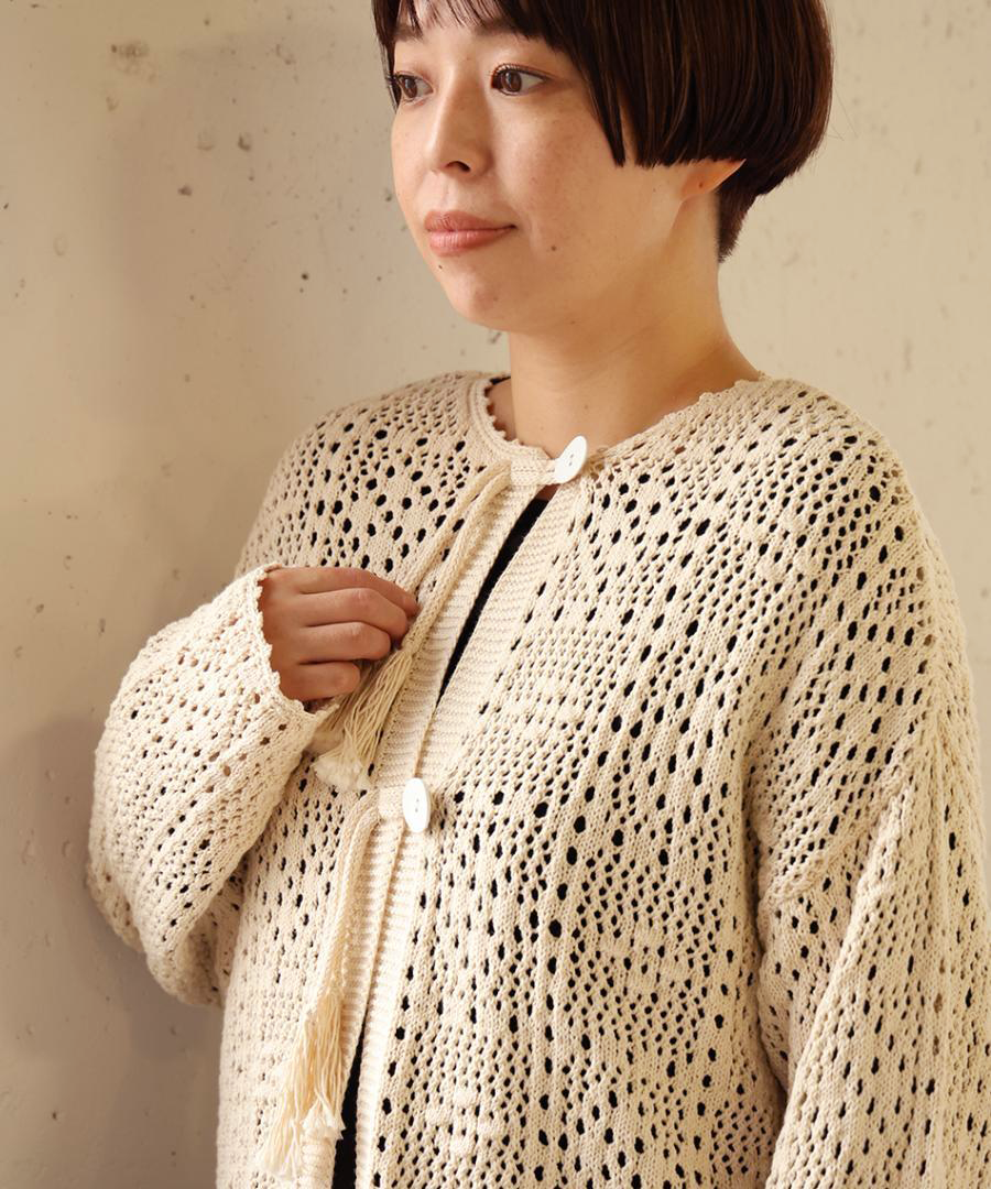 四角い柄の透かし編みをベースに、ぷっくりとした玉編みを組み合わせ、襟ぐりや前立て、裾などの縁部分を手編みのかぎ針で仕上げました。丸いボタンを、共紐のループに潜らせて留めるこだわりの仕様。紐先のタッセルが動きに合わせて揺れる愛らしいポイントに。