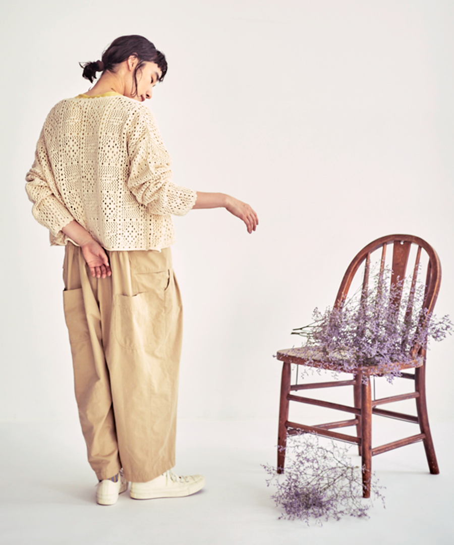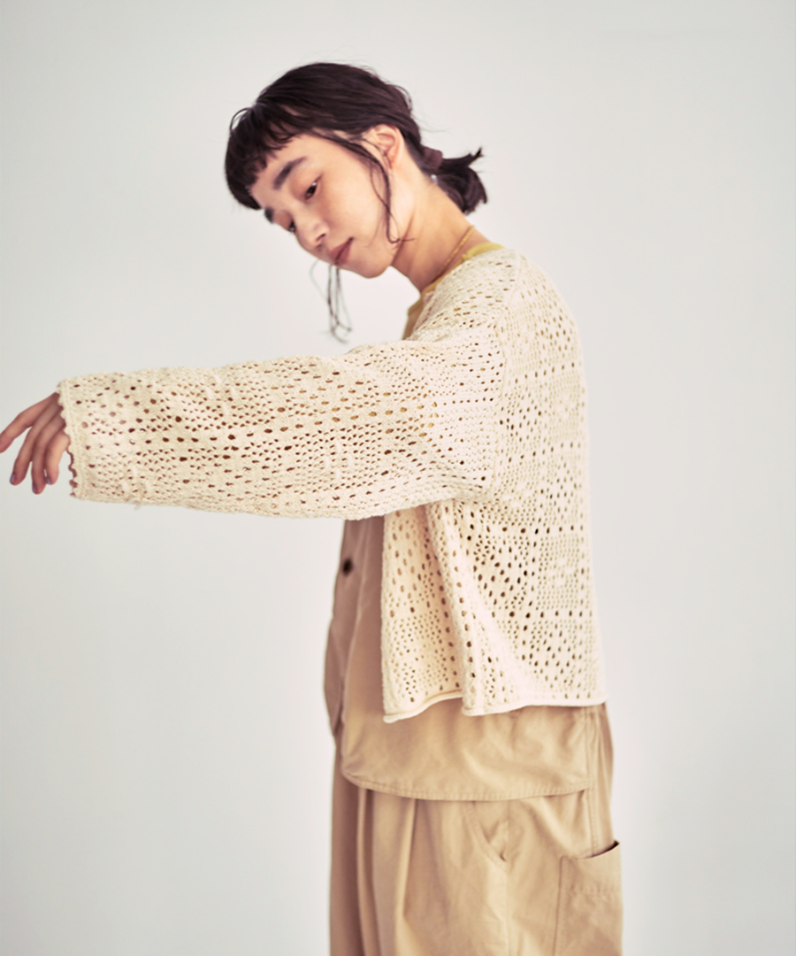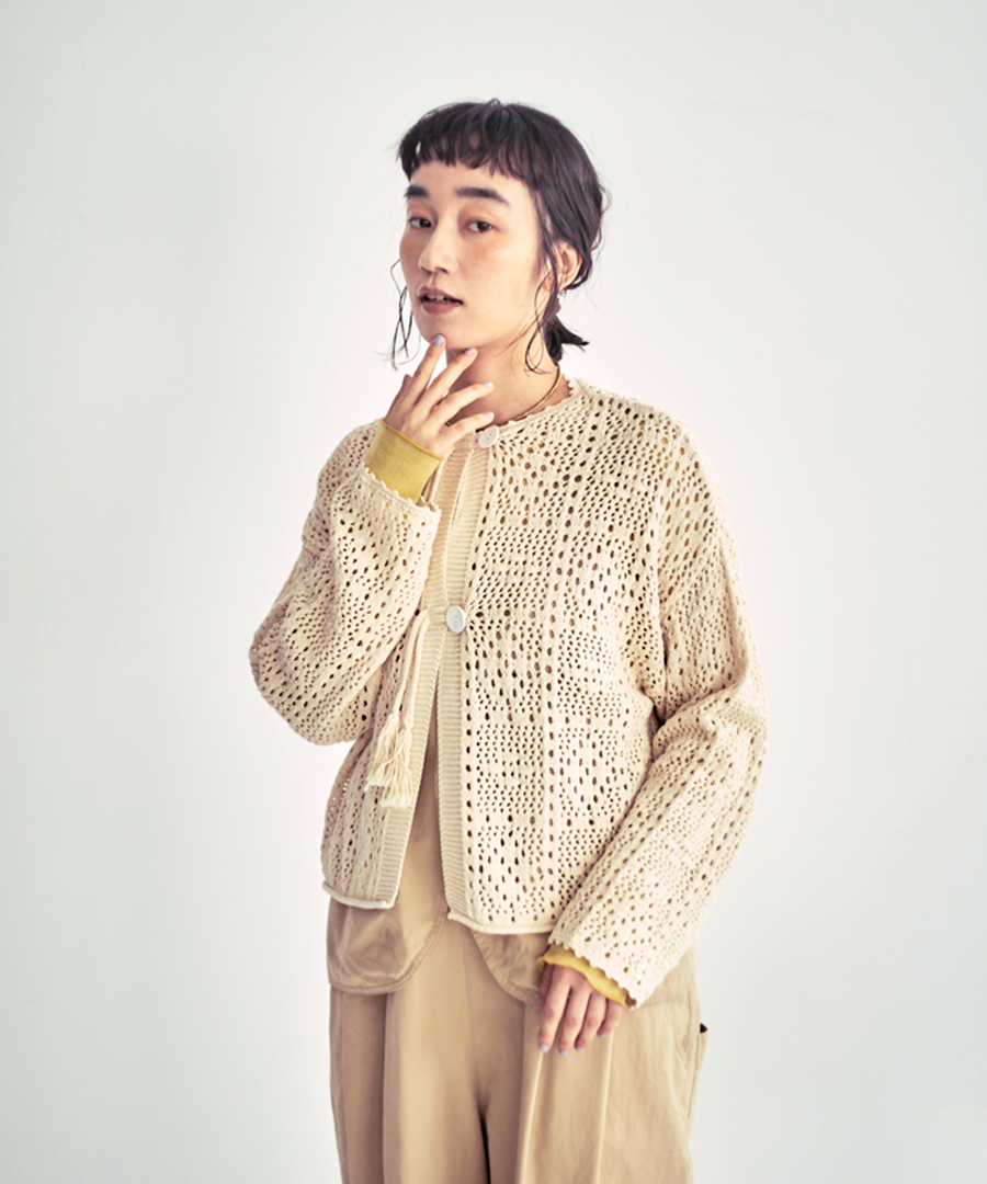 寒さの残る「梅春」の時期から、 日差しが心地よくなる春本番まで。 季節の移ろいに寄り添う、軽やかなクロシェカーディガン。