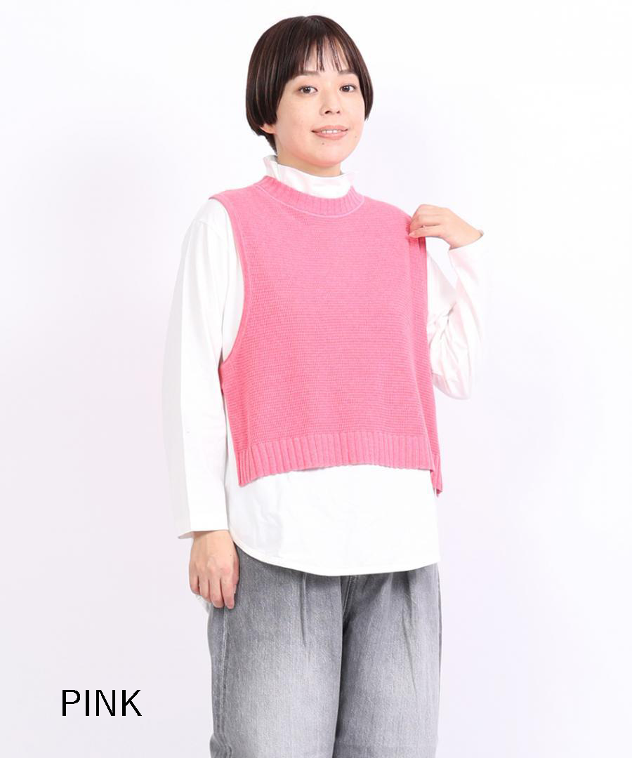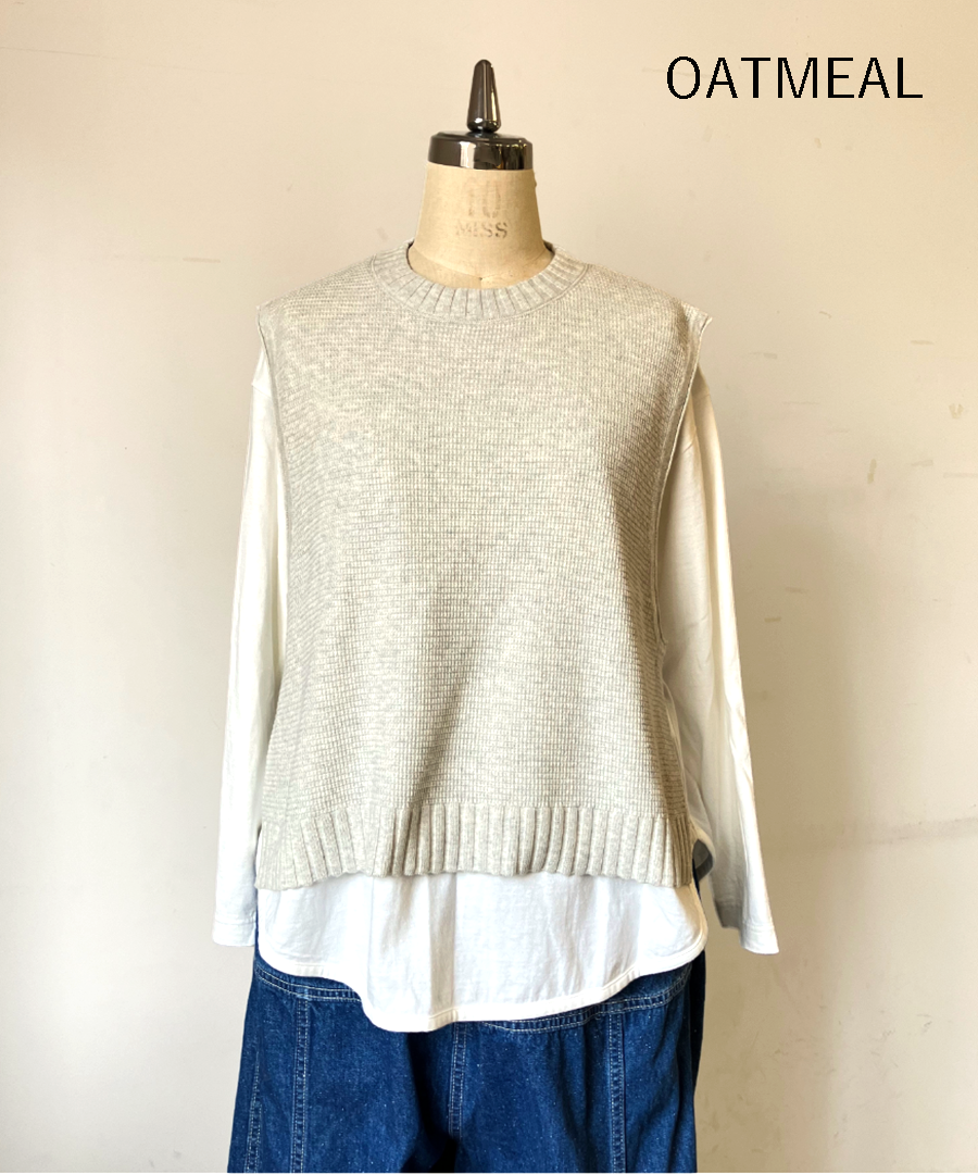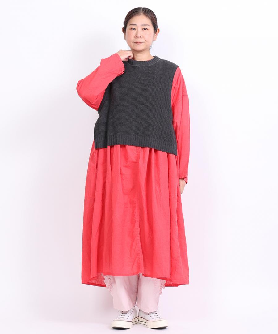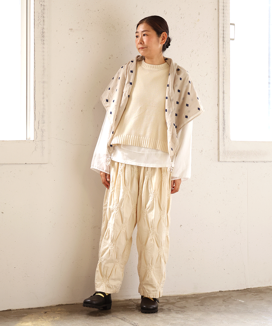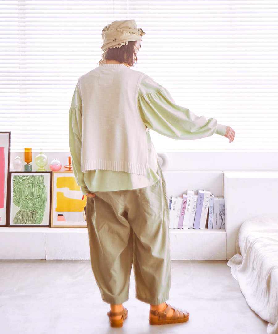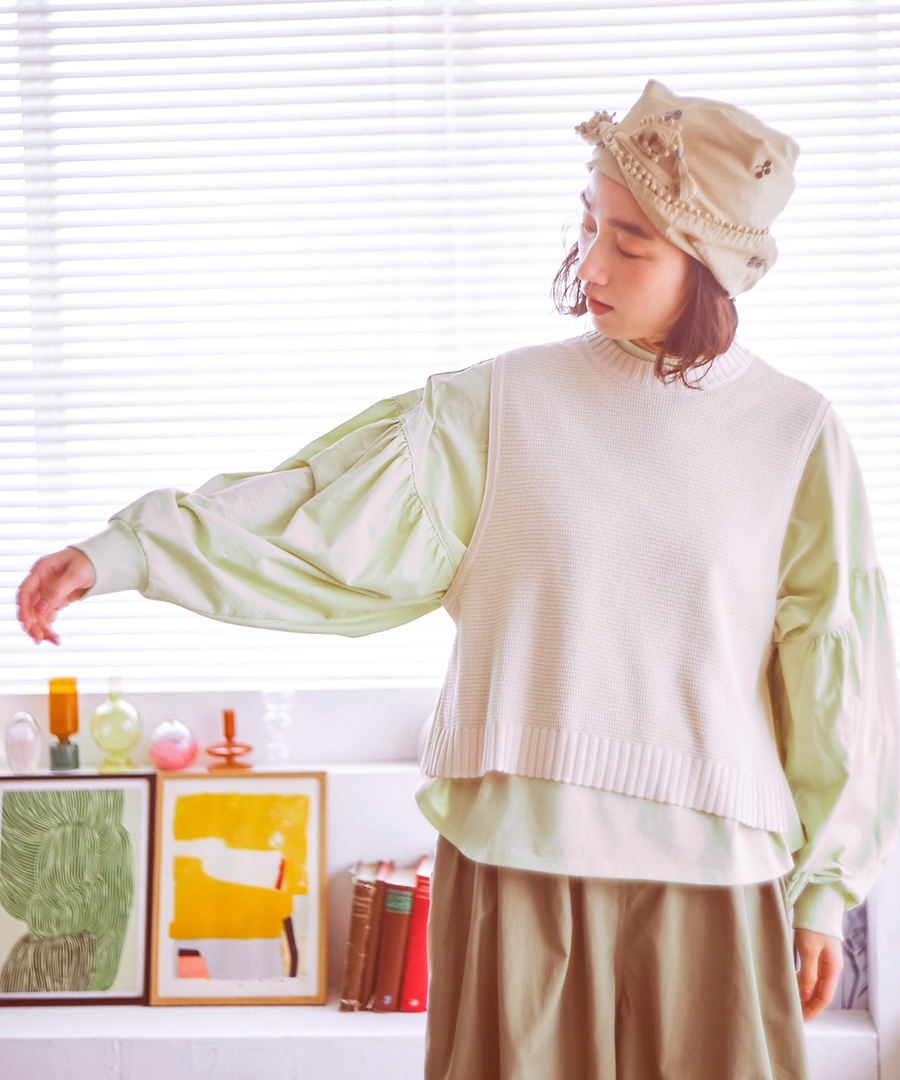 tumugu:人気定番「ランダムリブニット」と同じ、柔らかなコットン糸を100%使用。チクチク感のない優しい肌触りと空気を含んだ柔らかな編み地が、日常のレイヤードスタイルを心地よく彩ります。