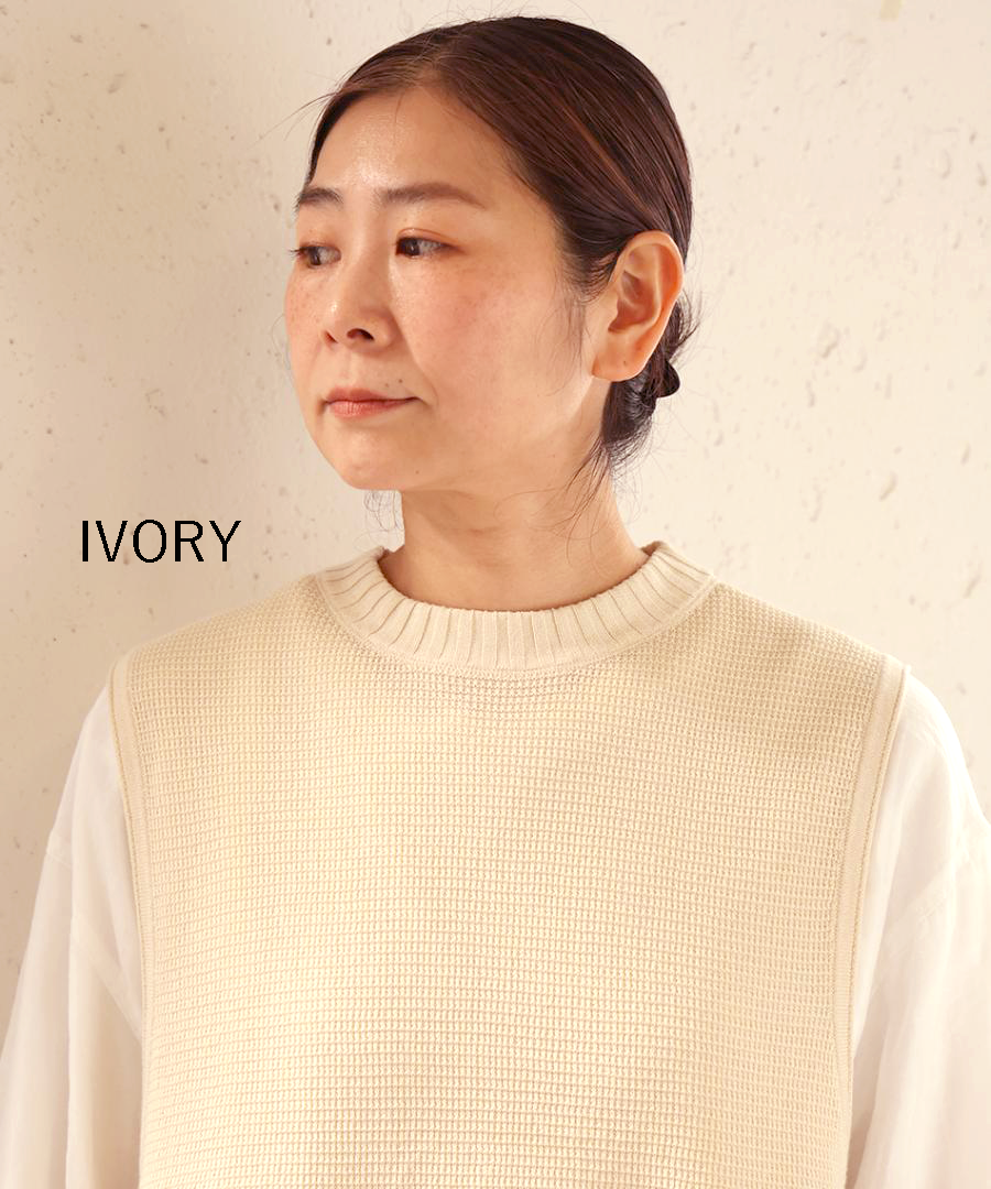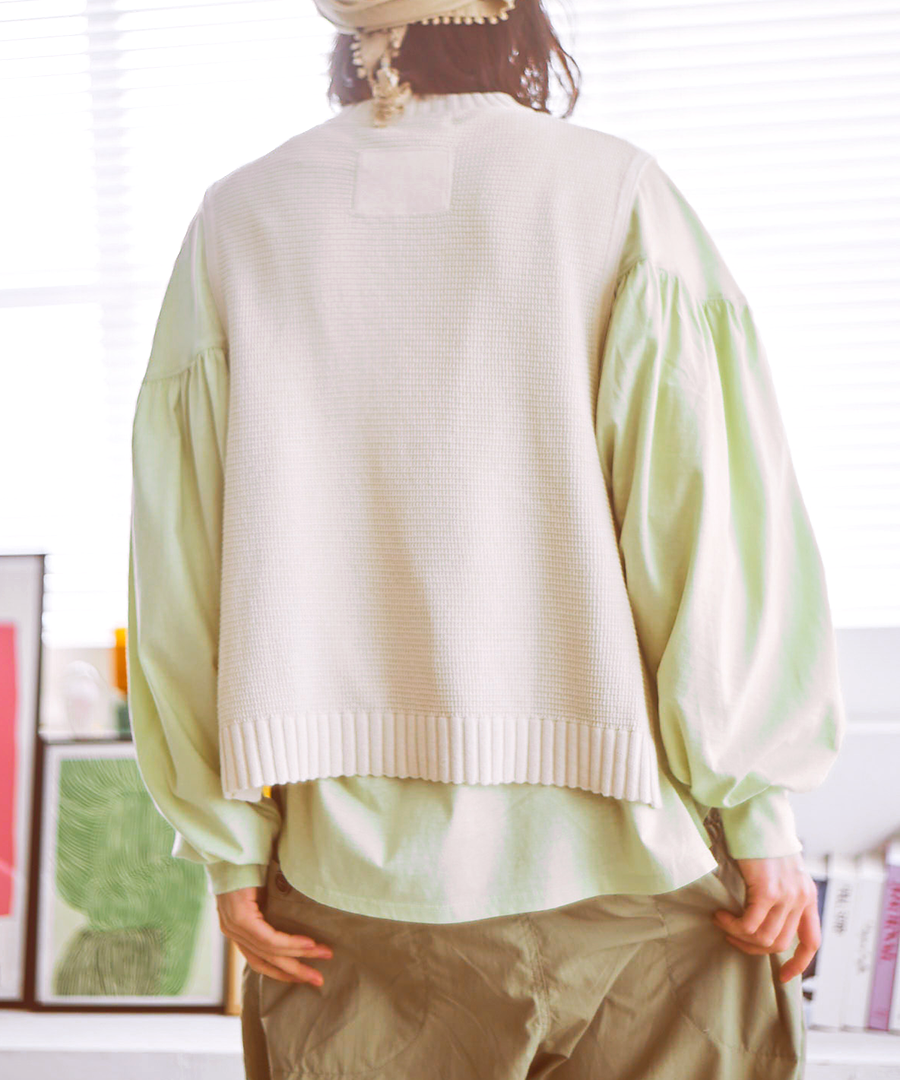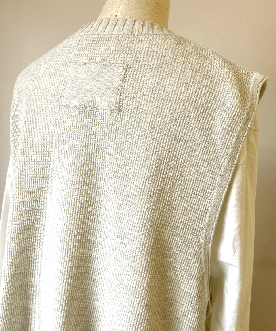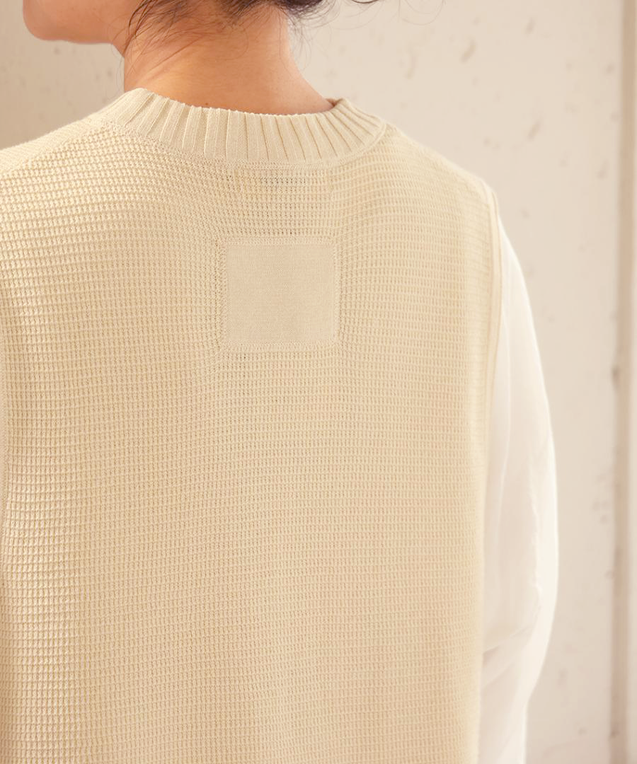 表面にはワッフル地のような細かな凹凸感のある表情豊かな仕上がり。シンプルな装いに奥行きを加えてくれます。後ろ姿にはガゼット風の編地デザインがアクセントに。