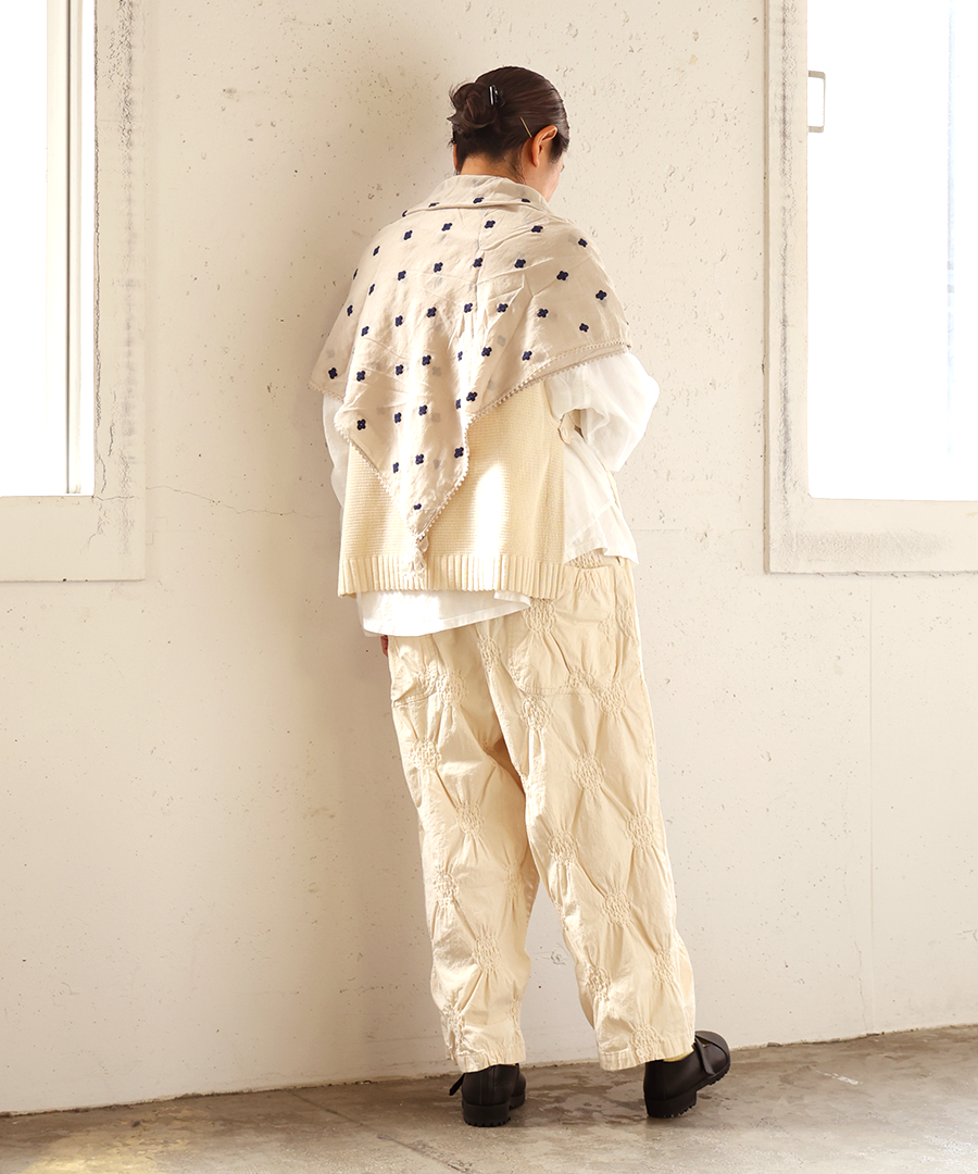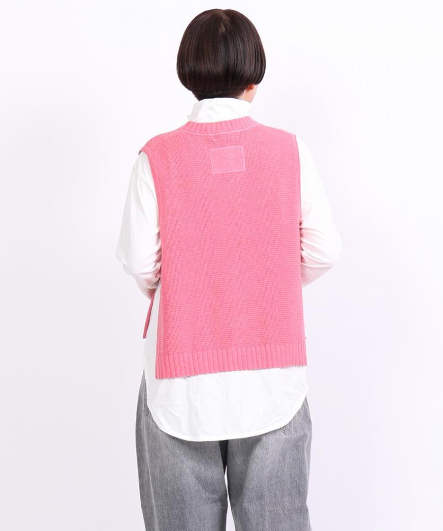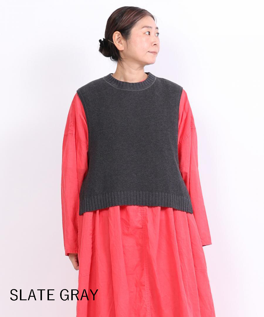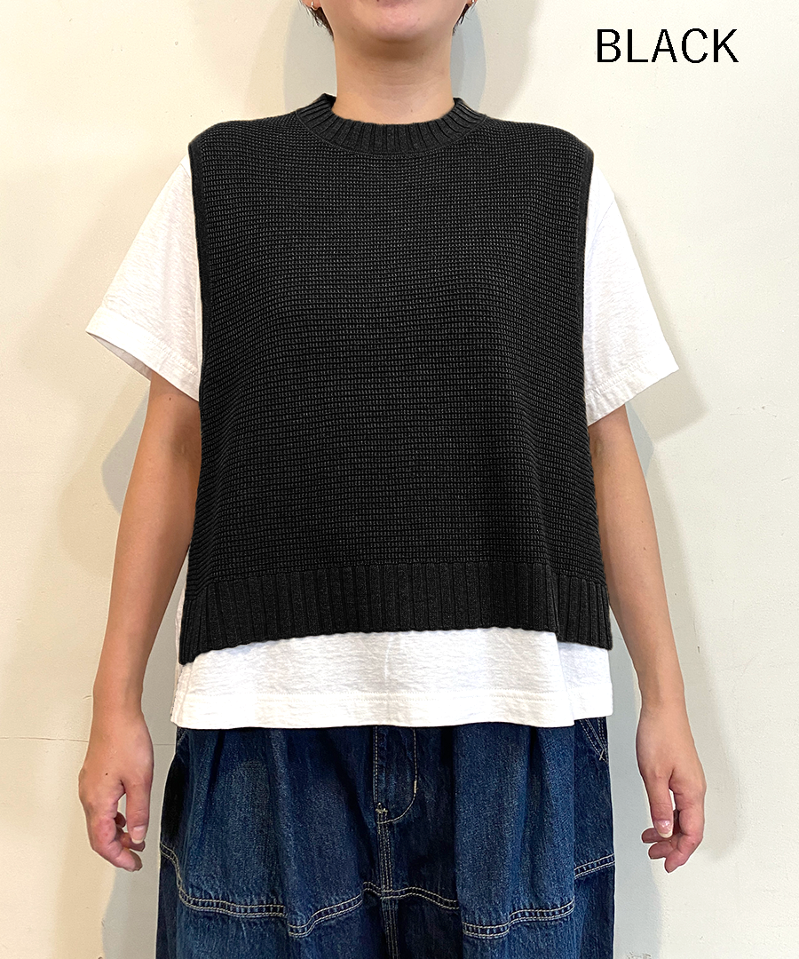 表面にはワッフル地のような細かな凹凸感のある表情豊かな仕上がり。シンプルな装いに奥行きを加えてくれます。後ろ姿にはガゼット風の編地デザインがアクセントに。