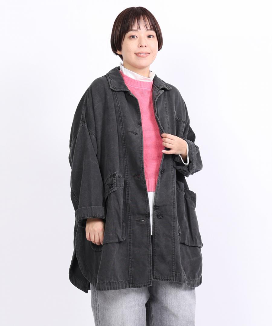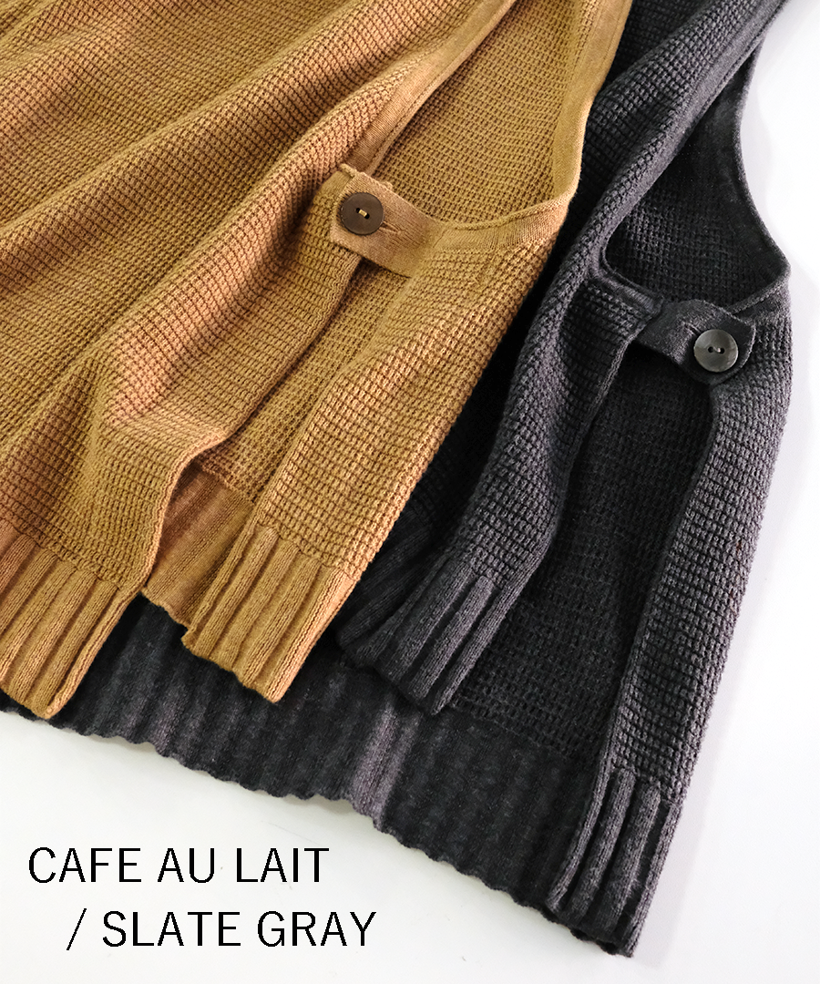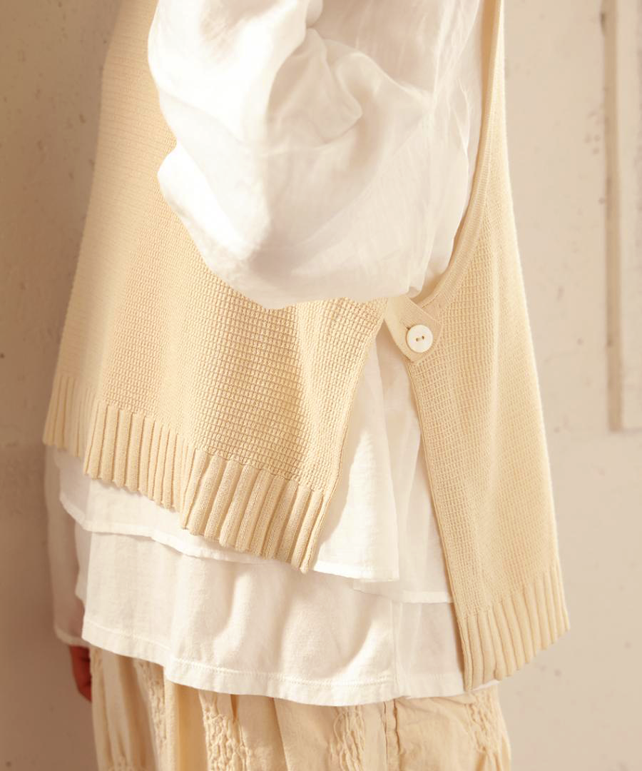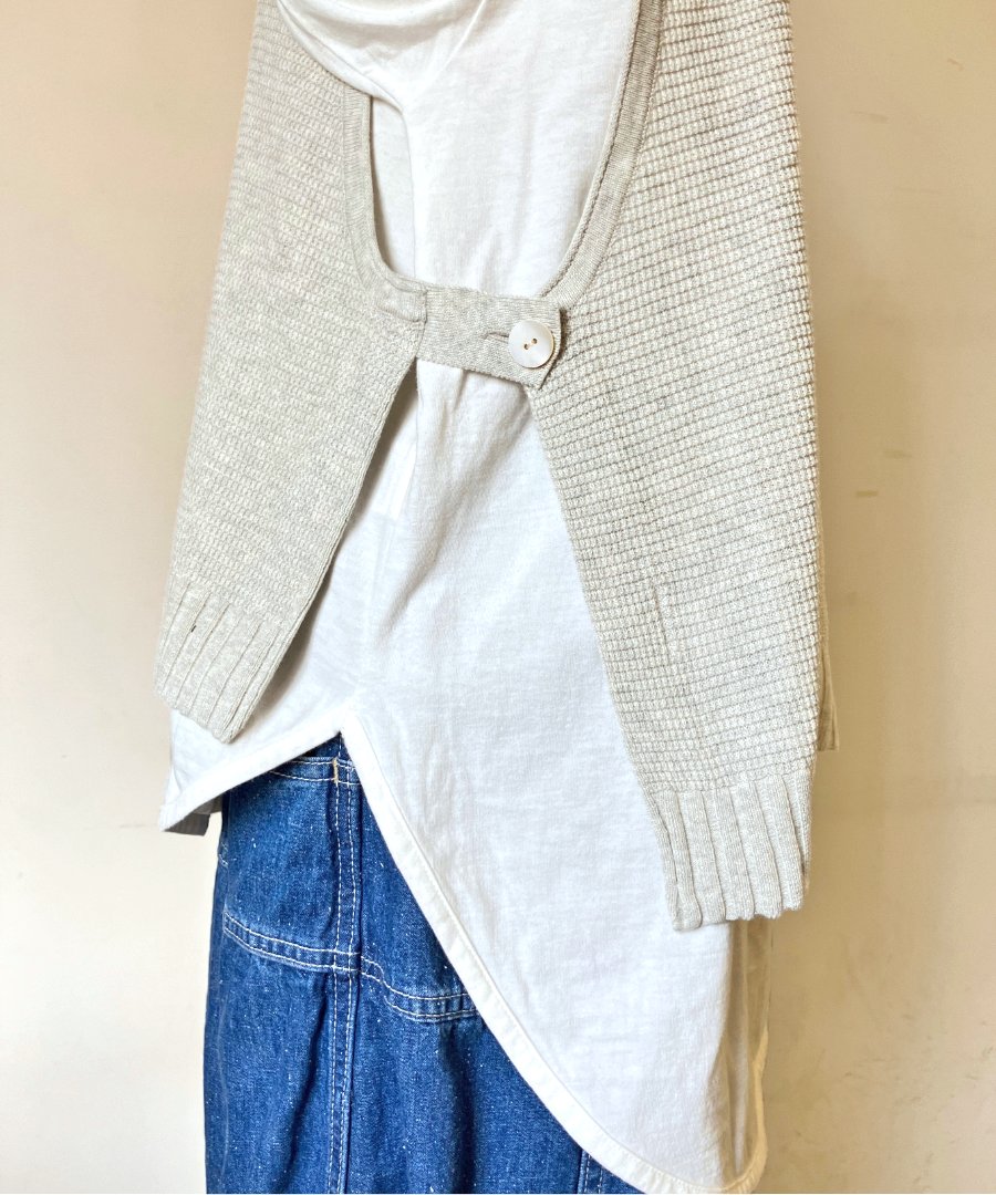 脇が大きく開いているので、ゆったりとワンピースの上にも重ねていただけます。サイドに施されたボタンが、横顔にさりげないアクセントをプラス。