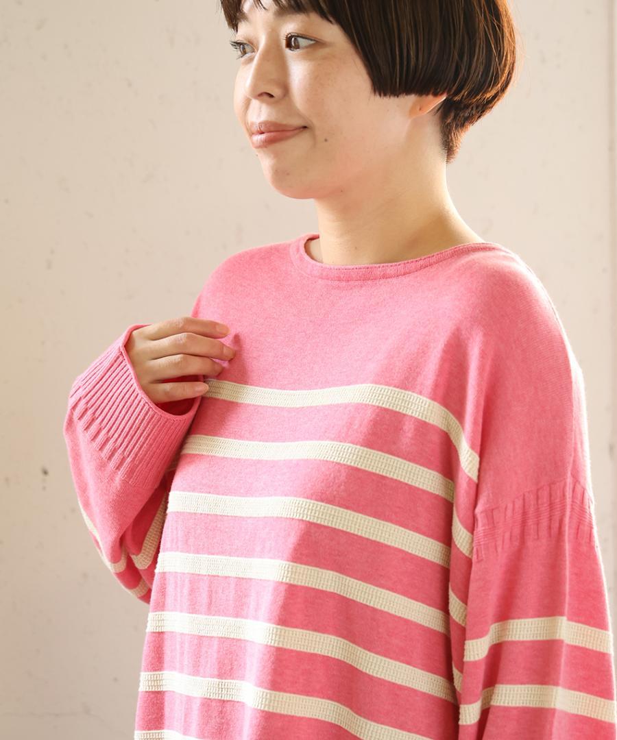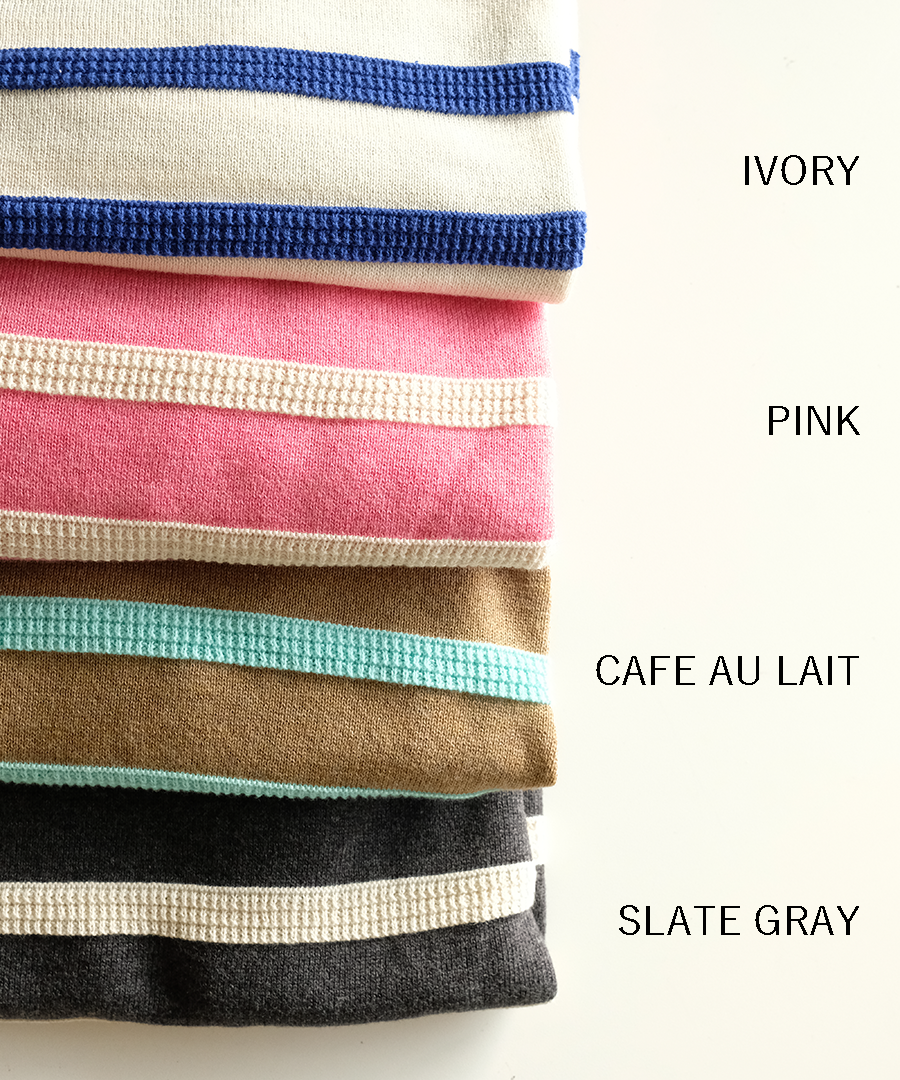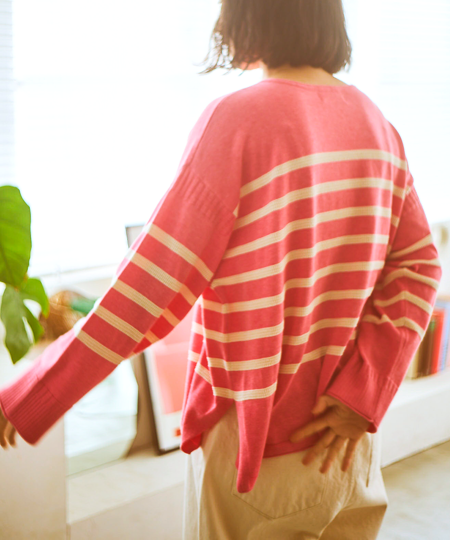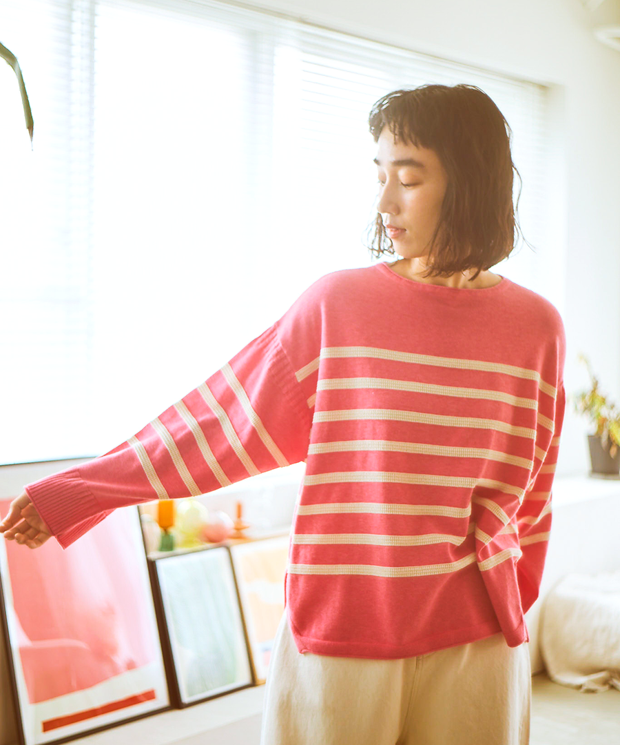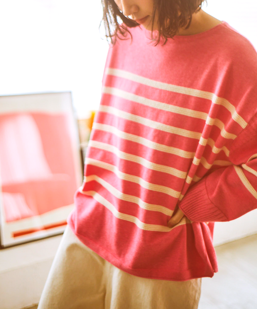 パッと目を引く鮮やかなピンクや、爽やかなブルー。プリントではなく、ワッフル編みで描かれたボーダーが春らしい軽やかな印象を与えてくれます。袖の切り替えラインには、はしご状の特殊な編み模様がアクセントに。