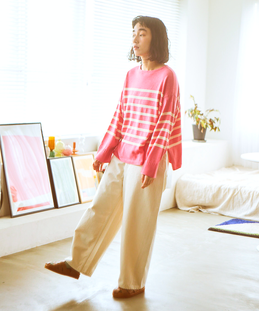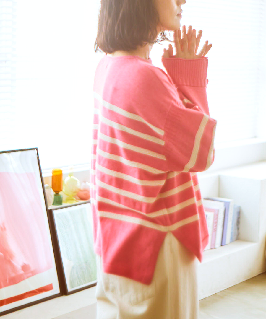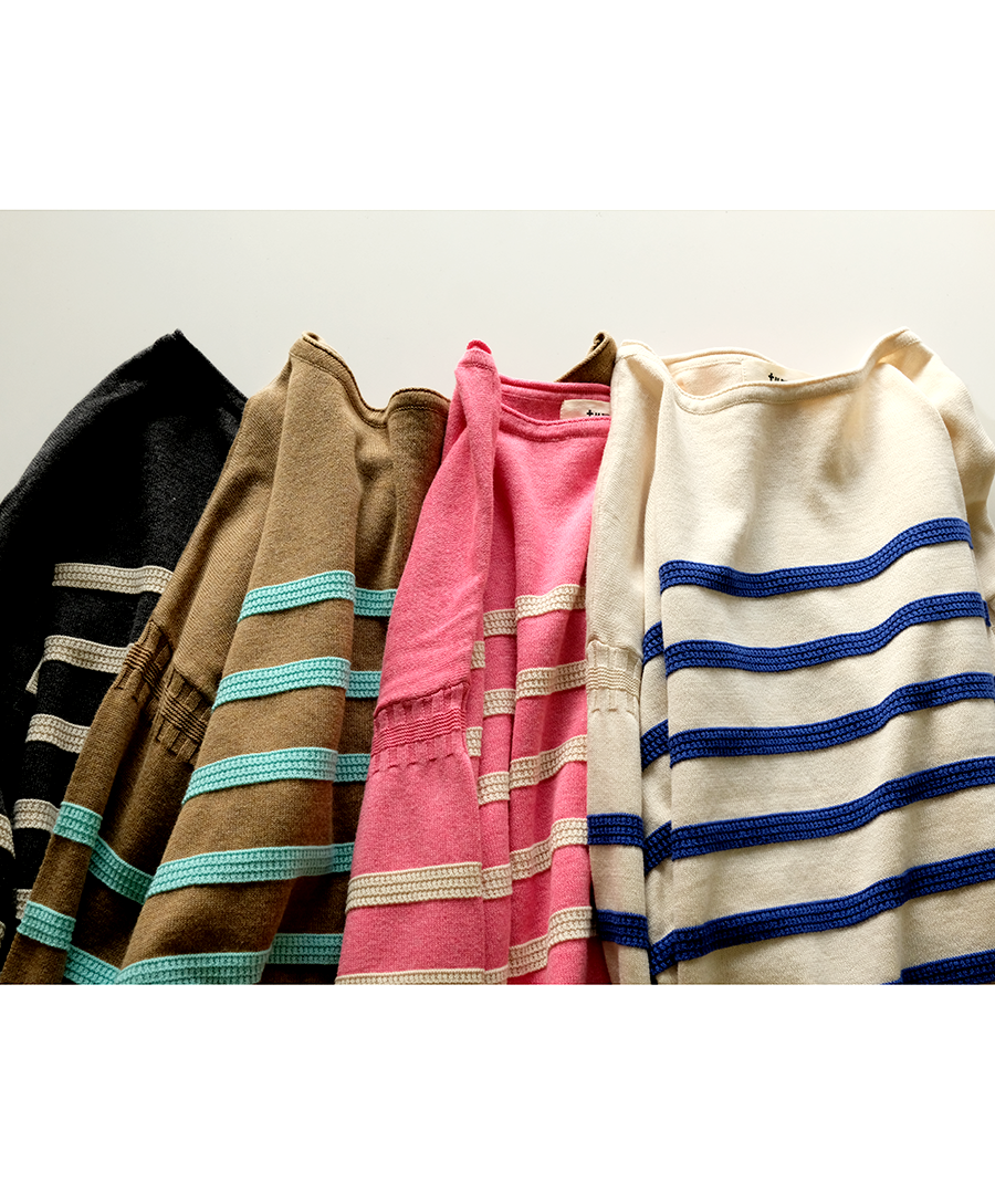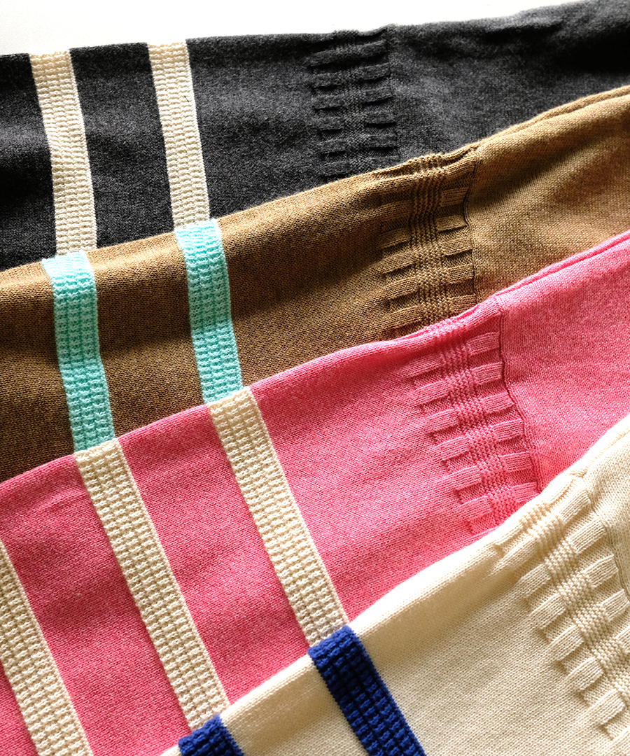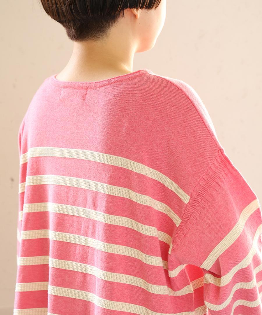 パッと目を引く鮮やかなピンクや、爽やかなブルー。プリントではなく、ワッフル編みで描かれたボーダーが春らしい軽やかな印象を与えてくれます。袖の切り替えラインには、はしご状の特殊な編み模様がアクセントに。