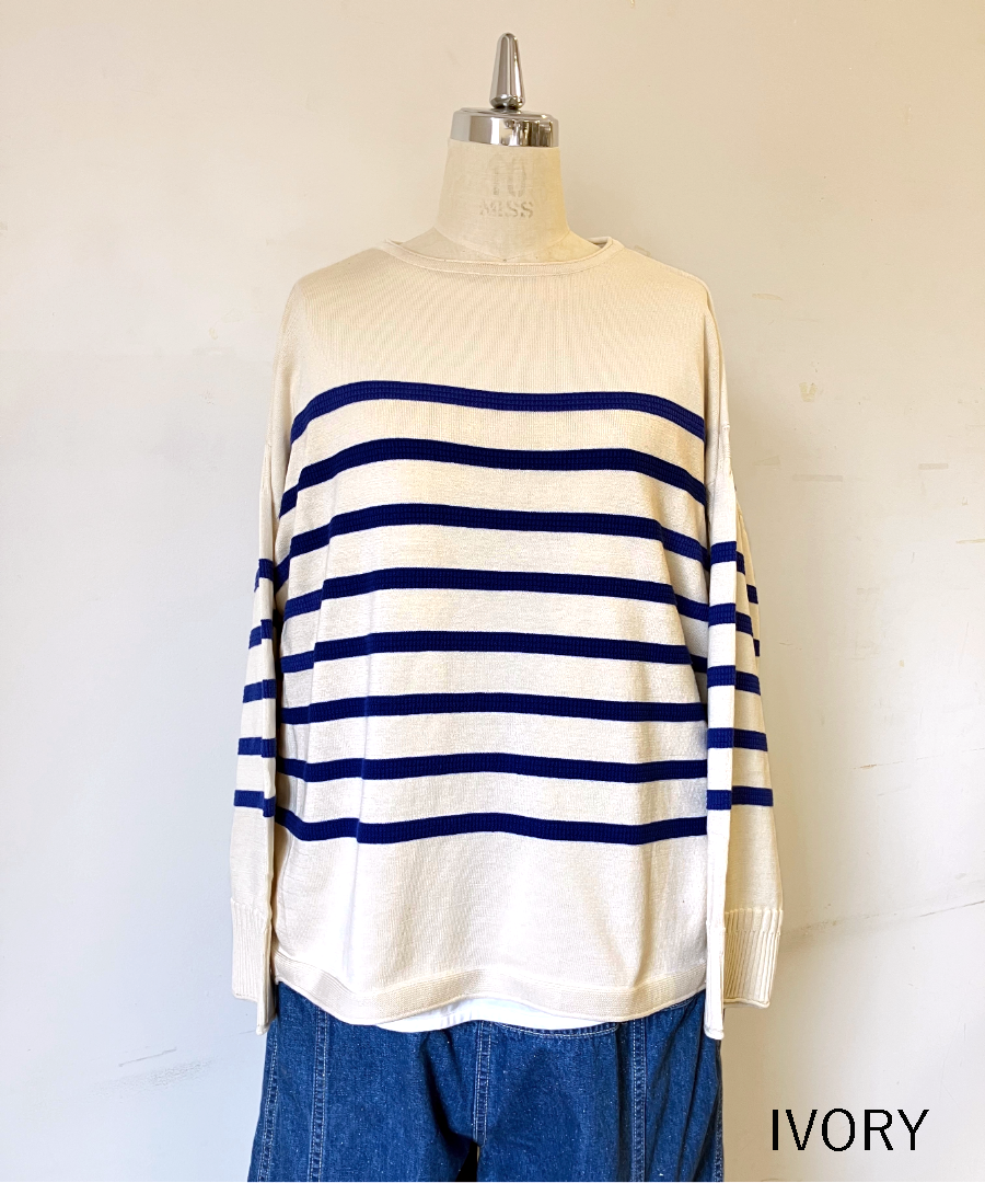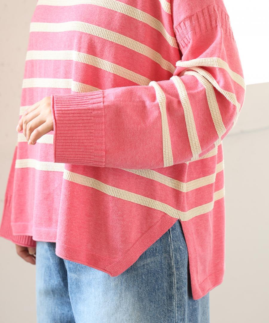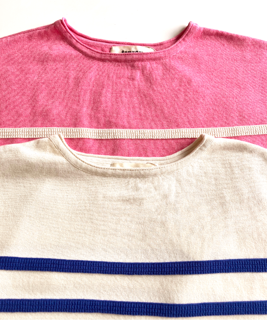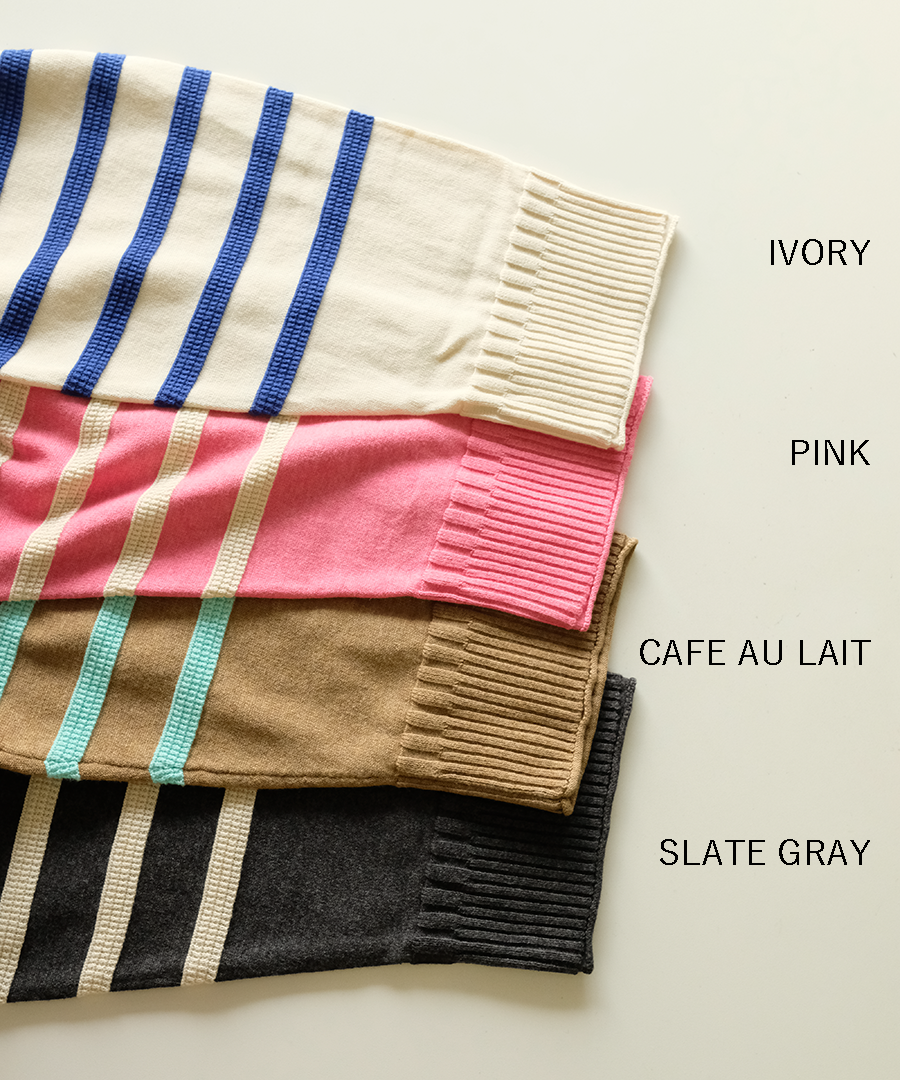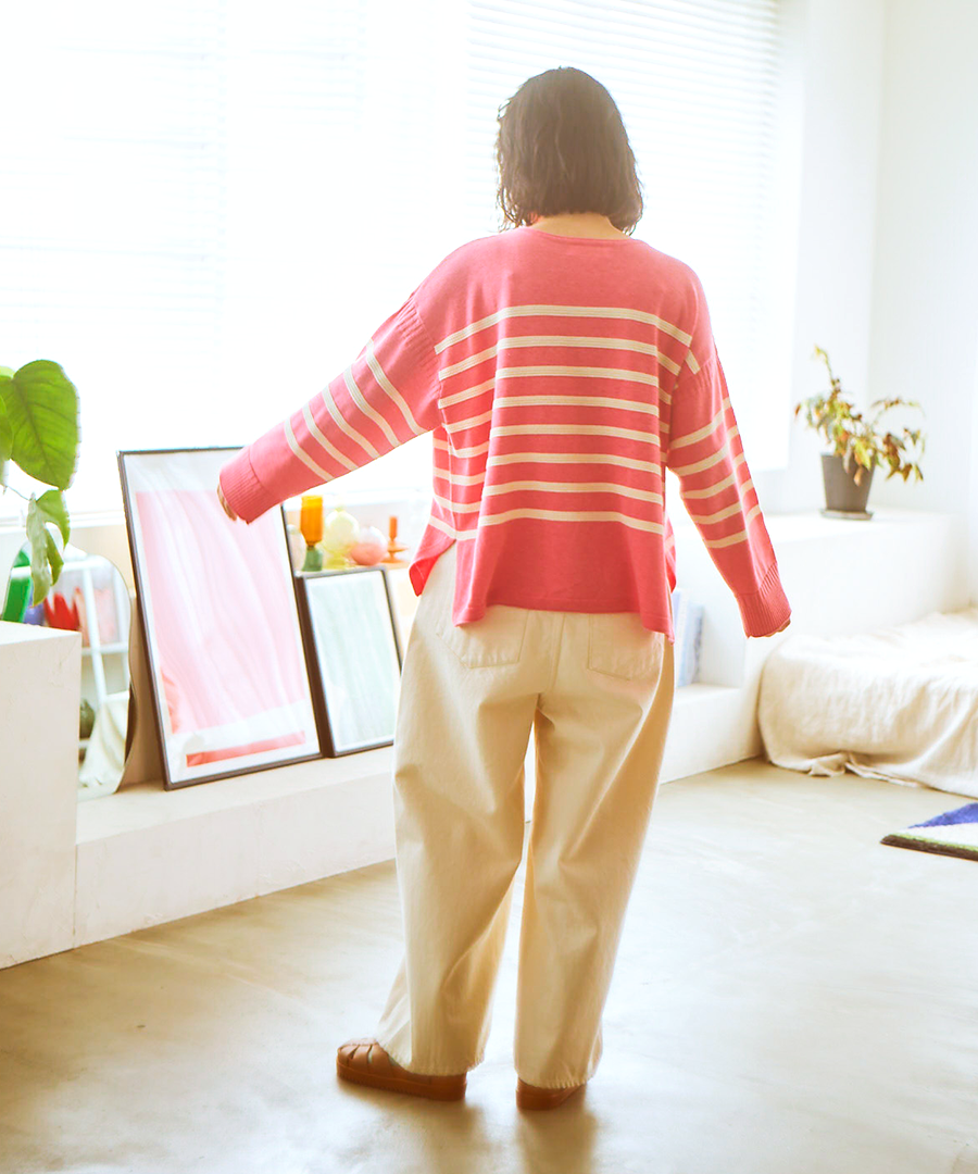 パッと目を引く鮮やかなピンクや、爽やかなブルー。プリントではなく、ワッフル編みで描かれたボーダーが春らしい軽やかな印象を与えてくれます。袖の切り替えラインには、はしご状の特殊な編み模様がアクセントに。