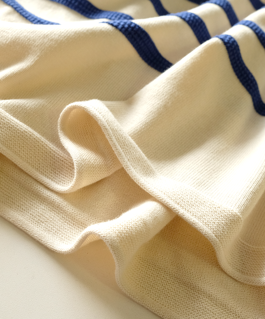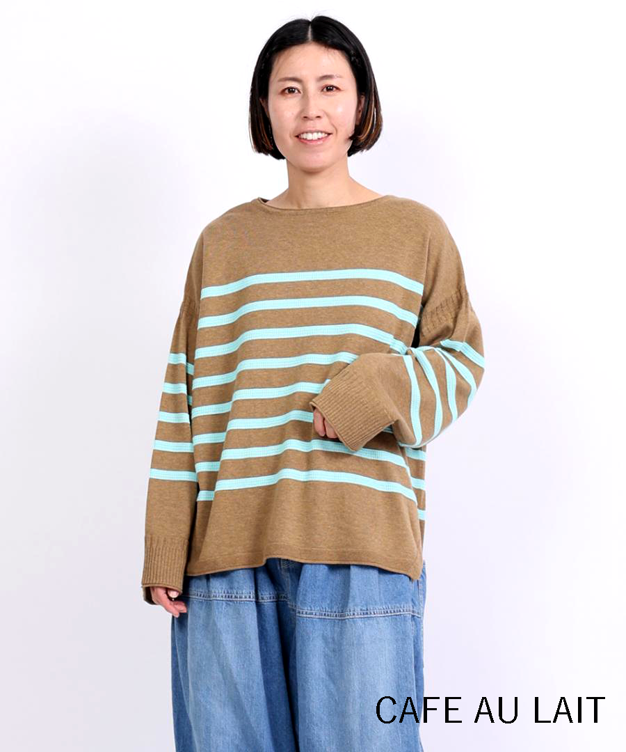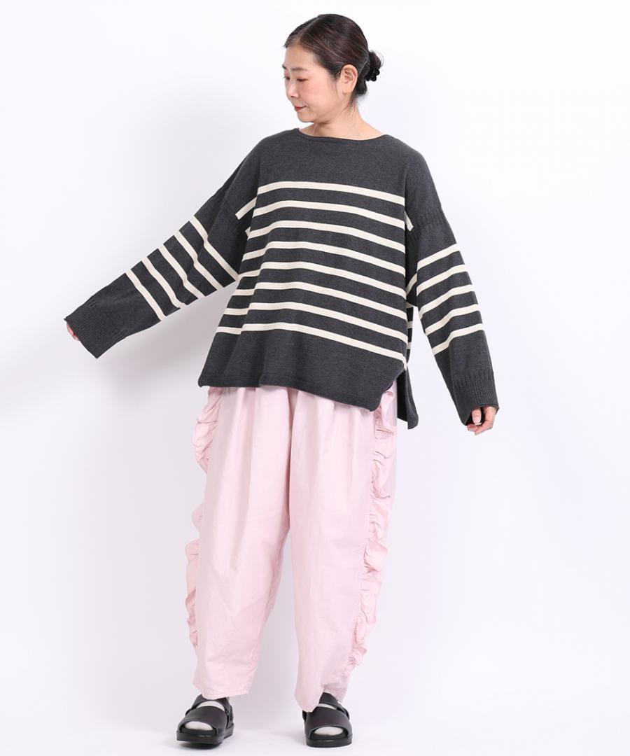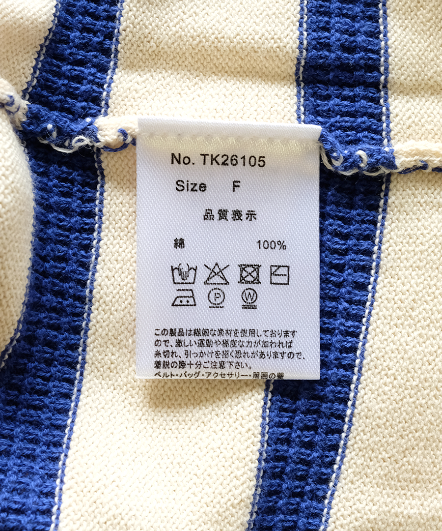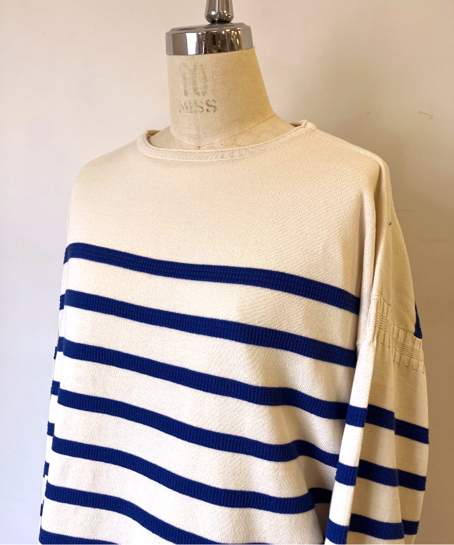 パッと目を引く鮮やかなピンクや、爽やかなブルー。プリントではなく、ワッフル編みで描かれたボーダーが春らしい軽やかな印象を与えてくれます。袖の切り替えラインには、はしご状の特殊な編み模様がアクセントに。