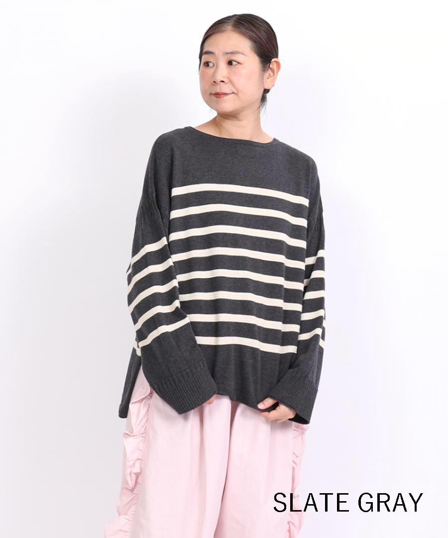 tumugu:人気定番「ランダムリブニット」と同じ、柔らかなコットン糸を100%使用。チクチク感のない優しい肌触りと空気を含んだ柔らかな編み地が編み地が心地よいプルオーバーです。