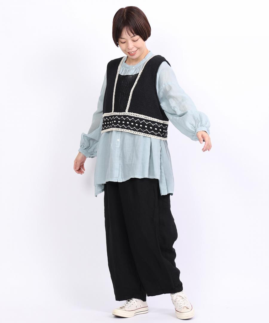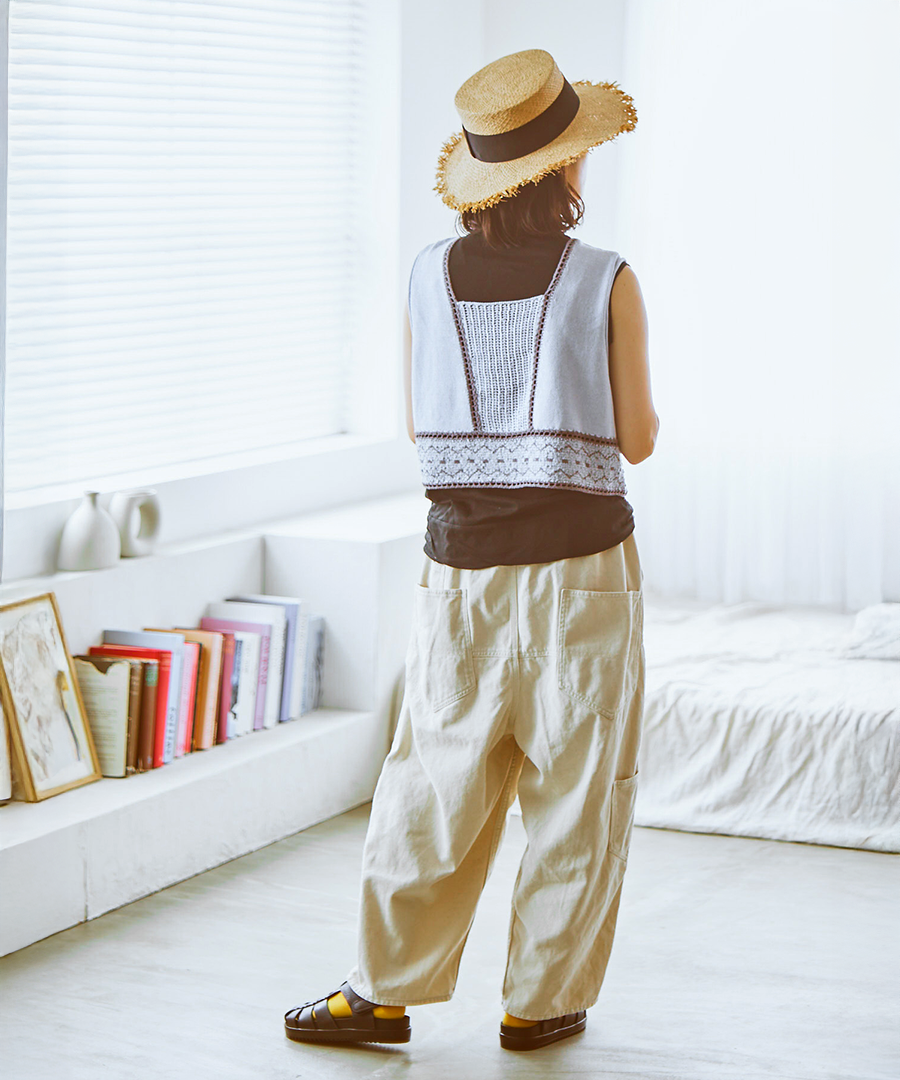 ネックラインや裾の縁取りには、繊細なかぎ針編みを施しました。このひと手間が、既製品にはないハンドメイドのような温もりと上品さをプラス。