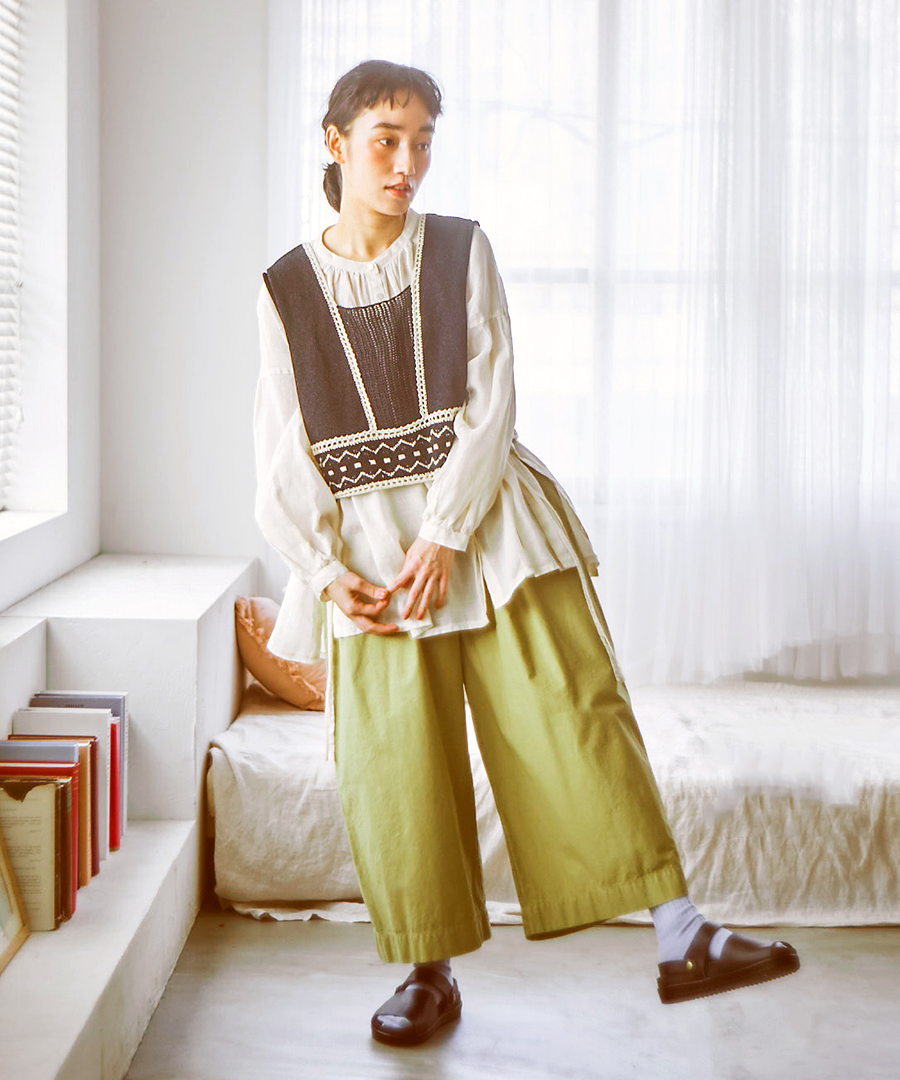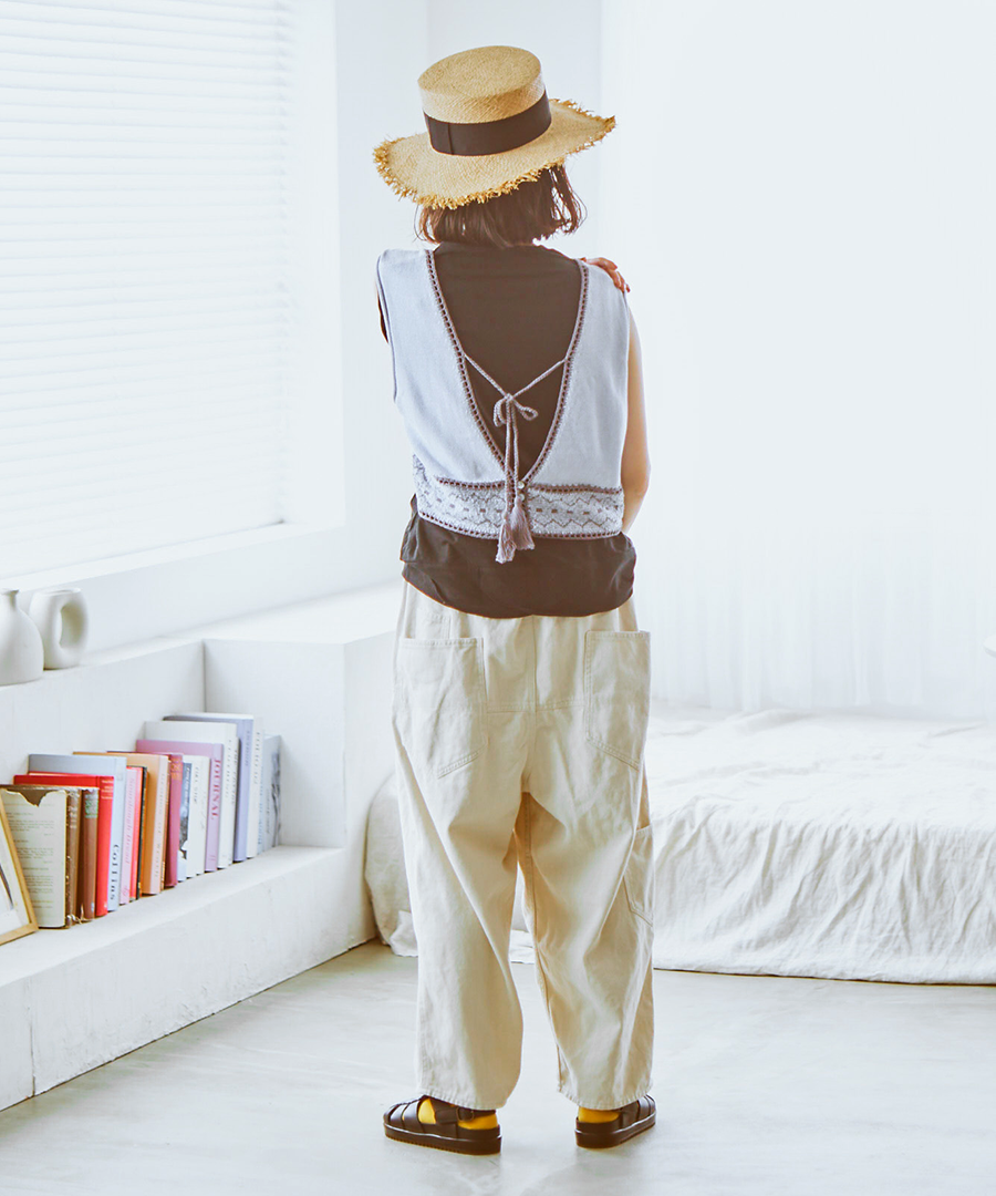 スッキリとしたスクエア型のベスト面と、リボン結びやボタンがアクセントになるボレロ面。その日の気分やインナーに合わせて、異なる2つの表情を楽しめます。コンパクトな丈感でバランスの良い軽やかなレイヤードスタイルに。