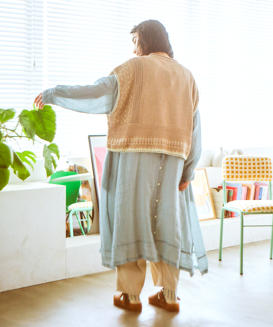 リヨセルのなめらかさと、ペーパーや麻特有のシャリ感が共存し、さらりと軽やかで清涼感のある肌触り。身体を包み込むようなゆったりとしたシルエットで、大人の余裕を感じさせるリラクシーな雰囲気に仕上げました。