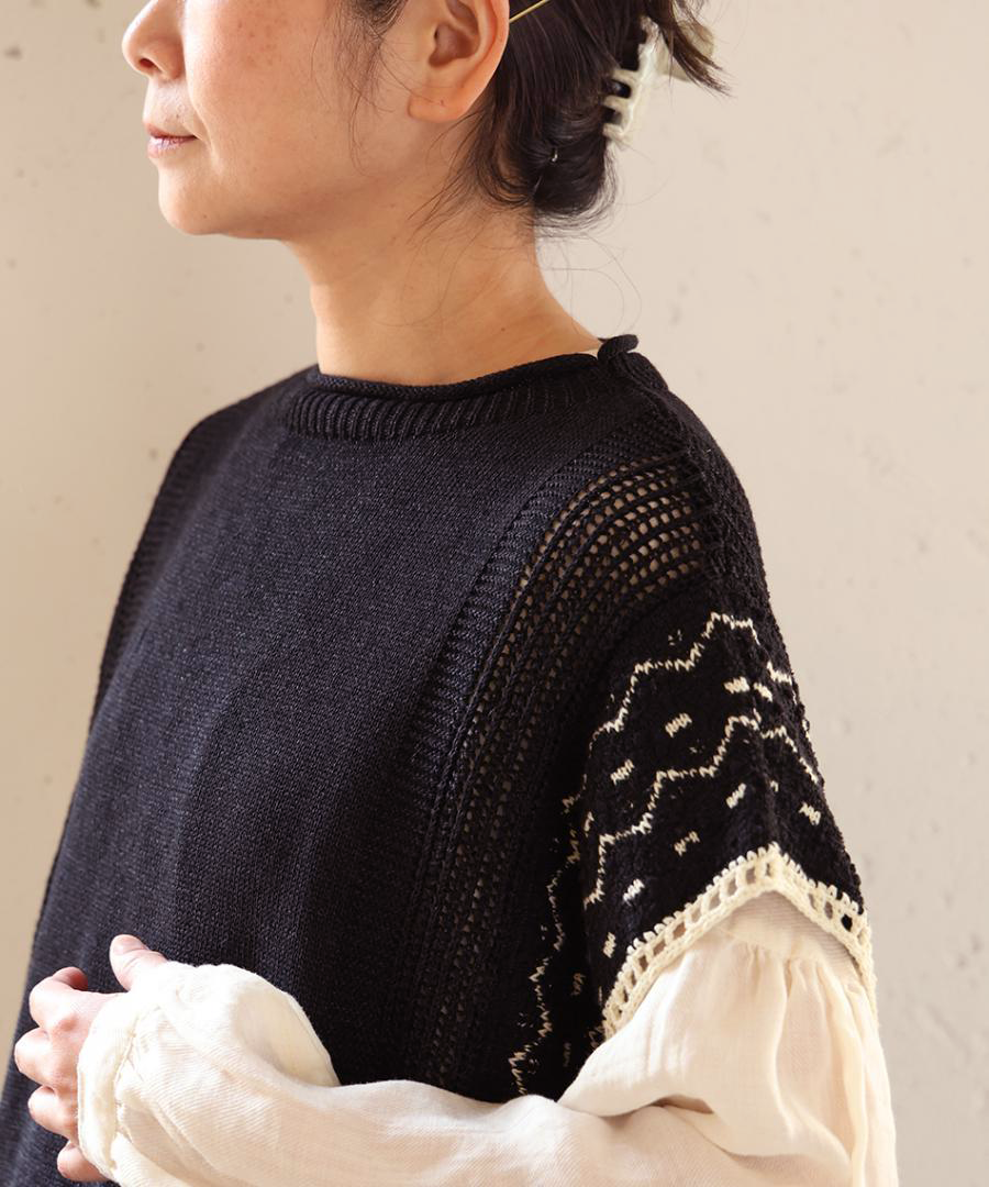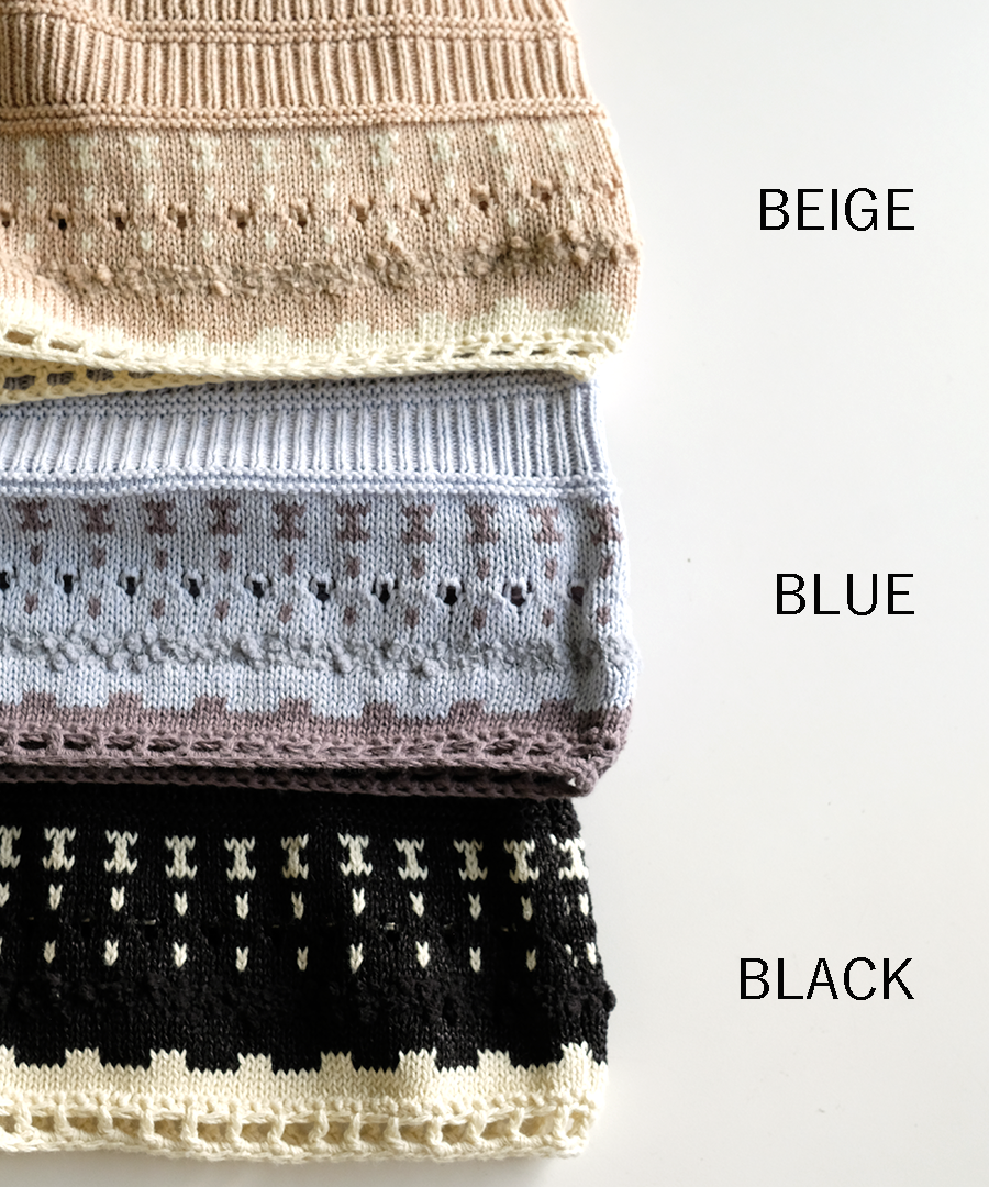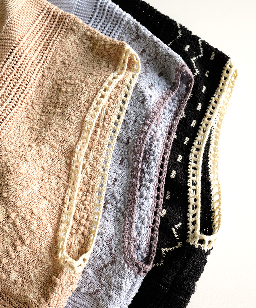 ジャガード柄を縁取るように施された「かぎ針編み」が、全体の印象を優しく引き締め、上質なハンドクラフト感をプラス。
